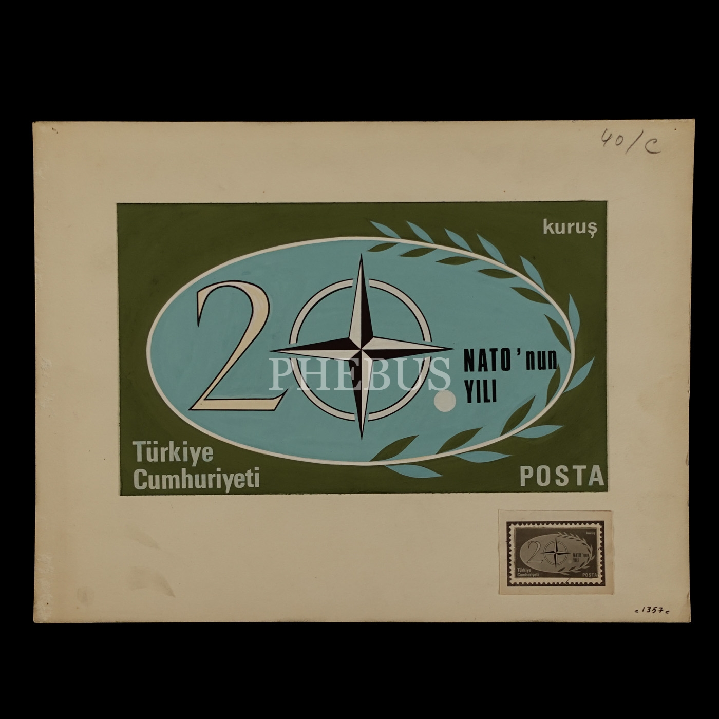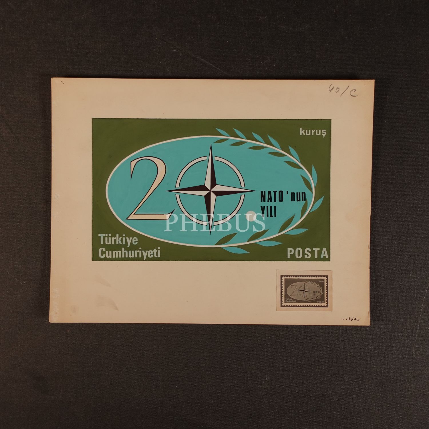 Ressam A. Baber Kocamanoğlu tarafından tasarlanan "NATO´nun 20. Yılı" konulu Türkiye Cumhuriyeti Postaları pulunun orijinal çizimi, çizim 22,5x13,5 cm, paspartu 30x23 cm...