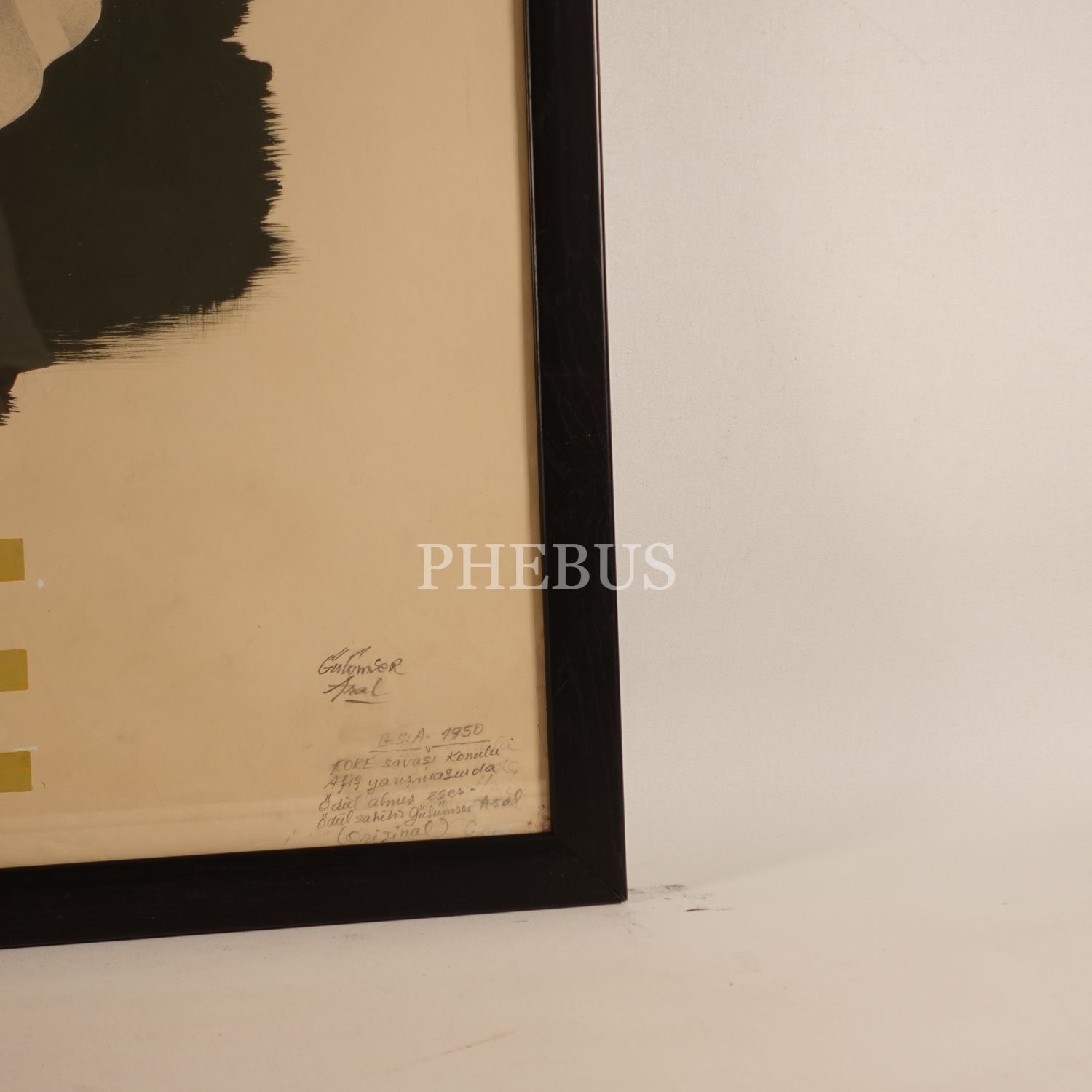 Afişin sağ alt köşesinde, ıslak imzanın hemen altında el yazısıyla kaleme alınmış şu not bulunmaktadır: "G.S.A. 1950 - Kore Savaşı konulu afiş yarışmasında ödül almış eser. Ödül sahibi Gülümser Aral (Orijinal)"