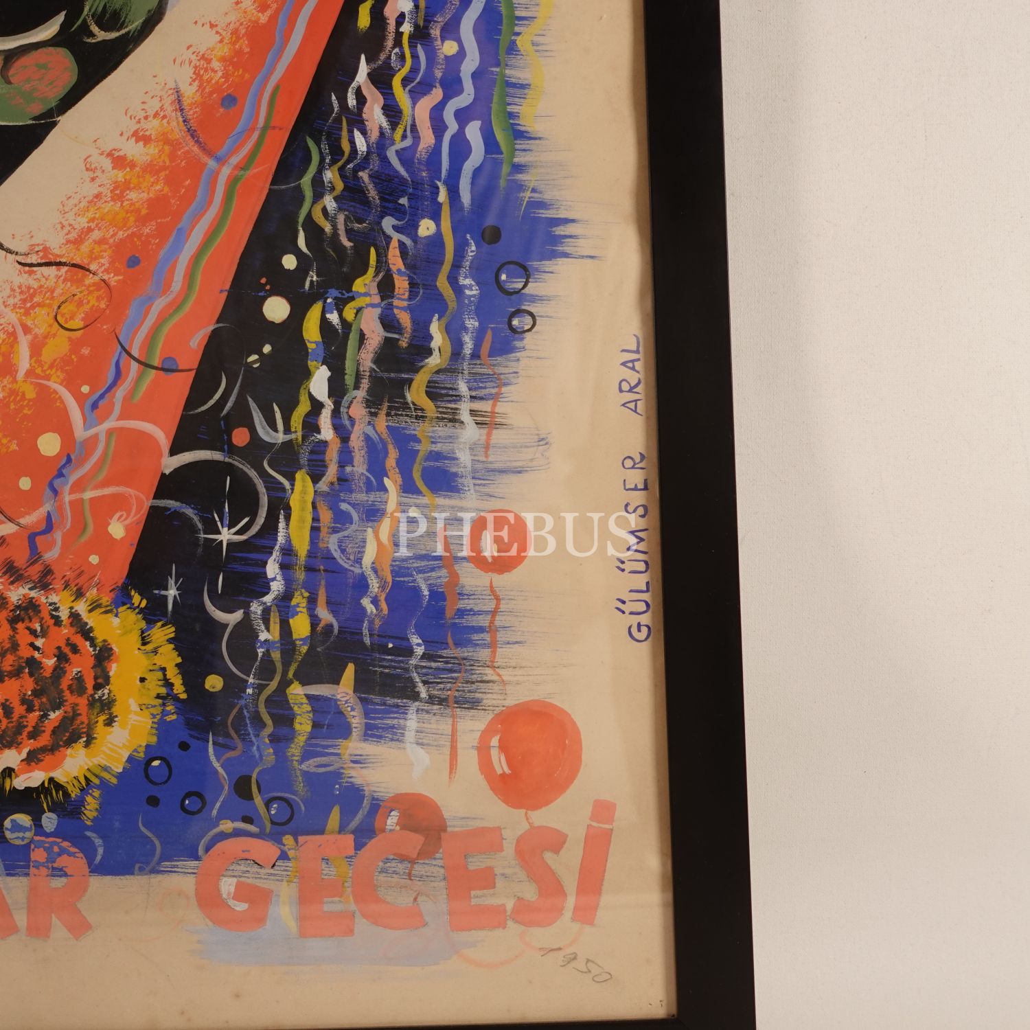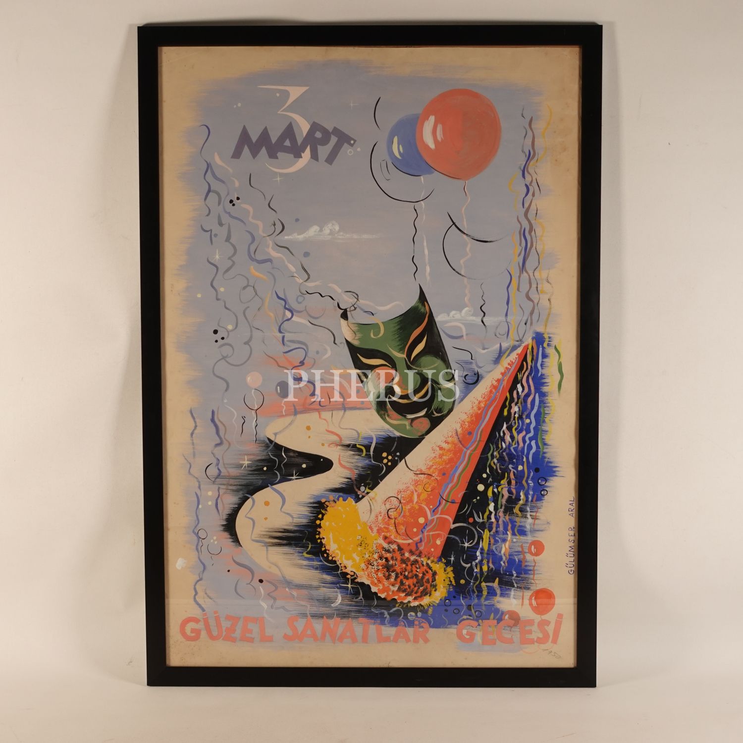 Gülümser Aral´ın ıslak imzasıyla "3 Mart Güzel Sanatlar Gecesi" yazılı orijinal duyuru afişi çizimi, çerçevesiyle birlikte 68x100 cm...