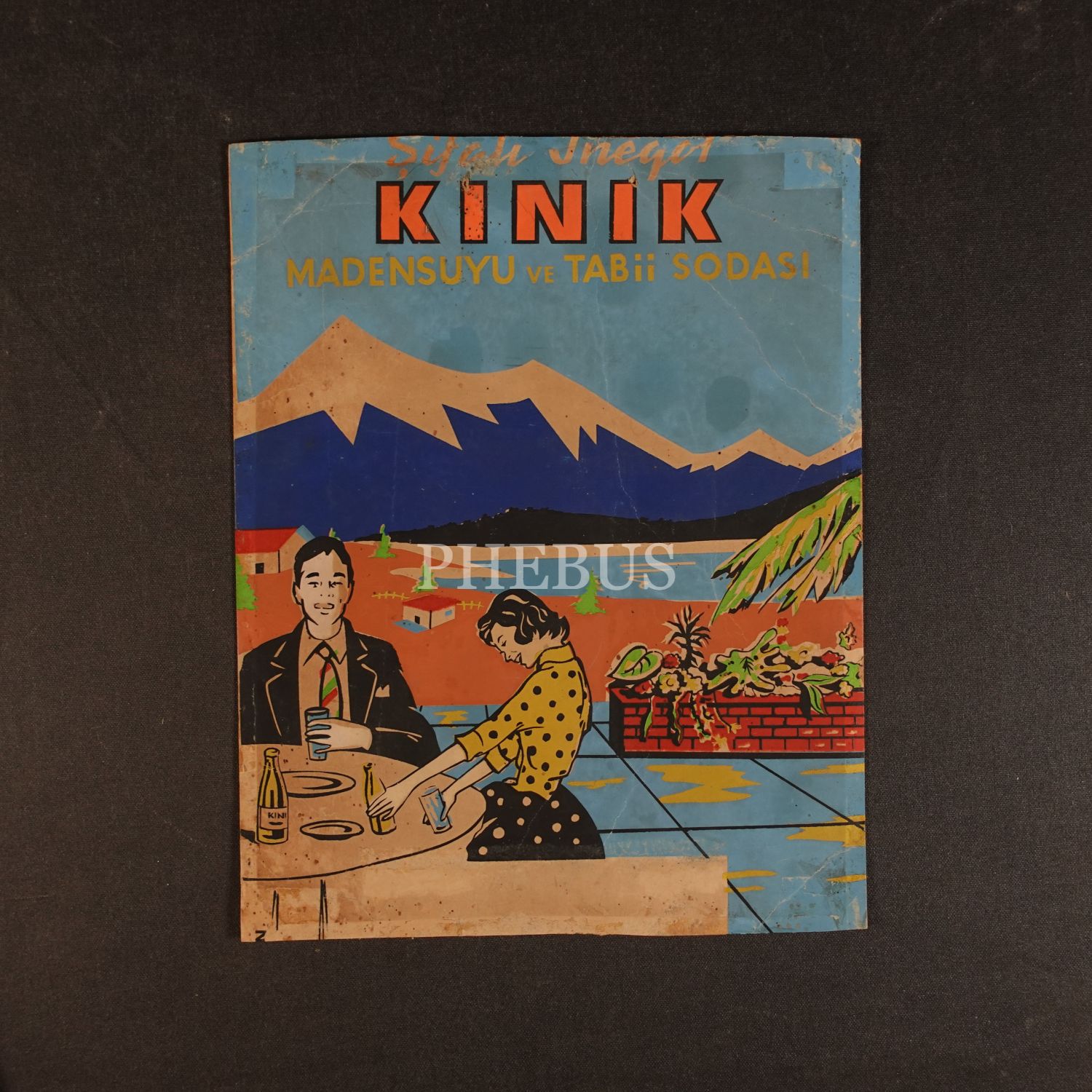 "Şifalı İnegöl KINIK Madensuyu ve Tabii Sodası" başlıklı orijinal reklam kartoneti çizimi, 24x30 cm...