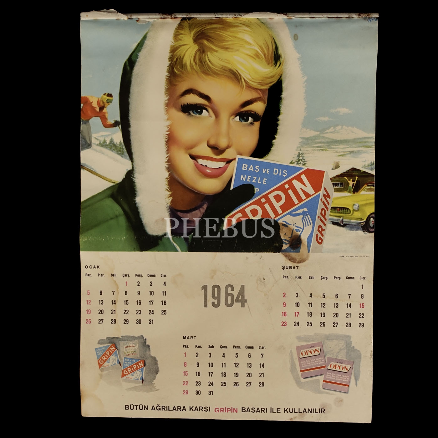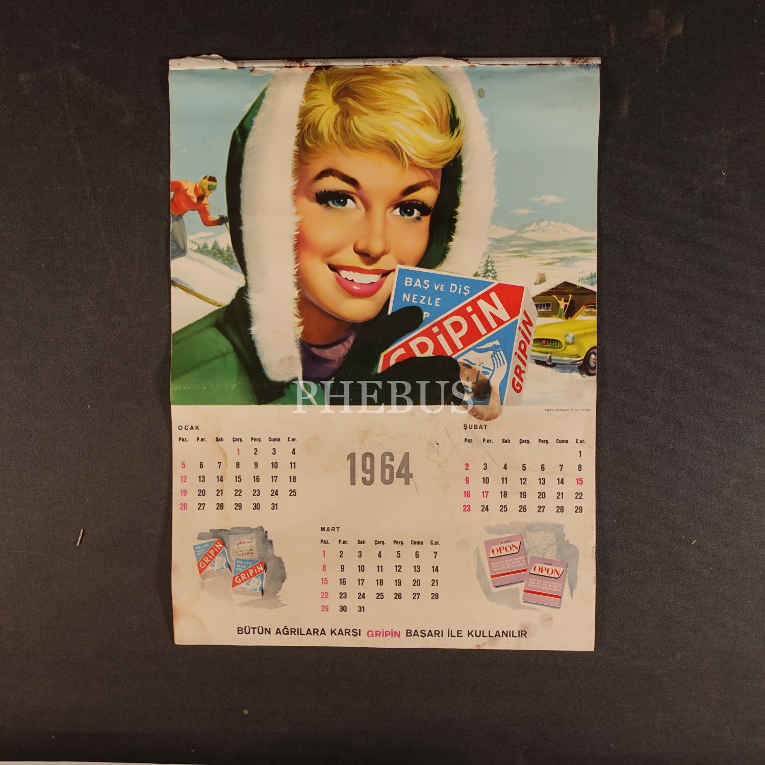 Gripin, "Köpüklü" Fay Deterjanı, Opon ve Puro Tuvalet Sabunu reklamlı 1964 takvimi, 33x46 cm...