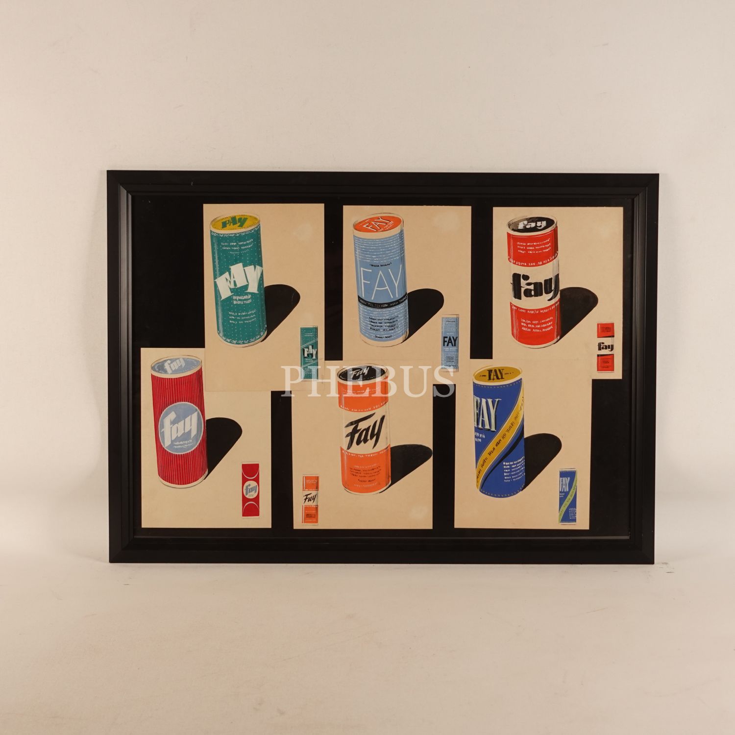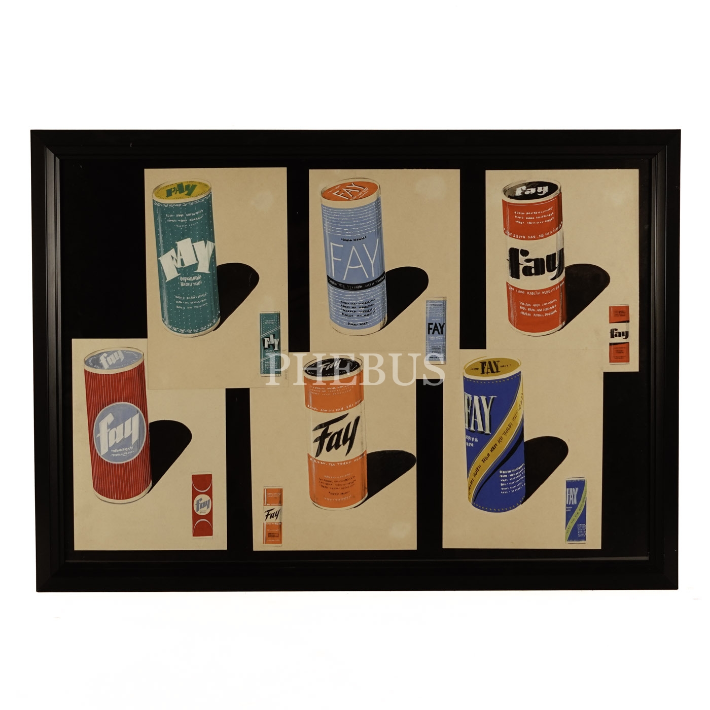 Mesut Manioğlu´nun ıslak imzasıyla orijinal Fay Deterjanı ambalaj çizimleri (6 adet), ortalama çizim boyutu 19x23 cm, çerçeve 76x55 cm...