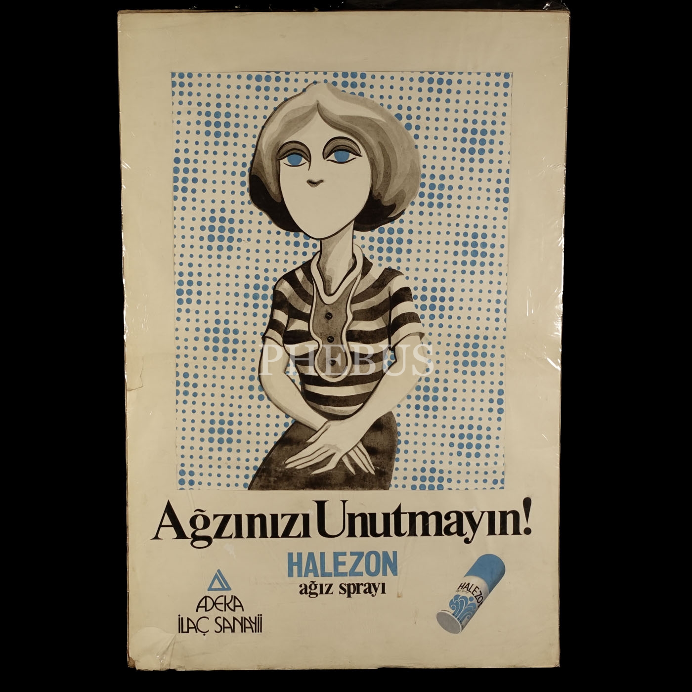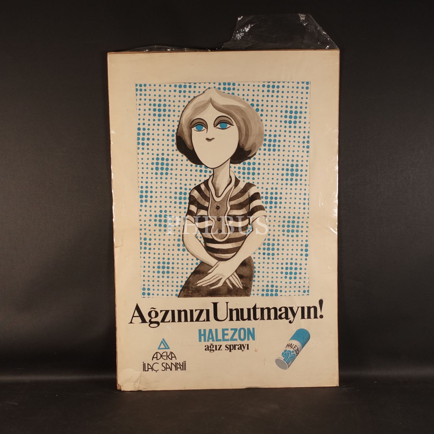 Orijinal çizim "HALEZON ağız sprayı" reklam afişi, ADEKA İlaç Sanayii, 67x100 cm...