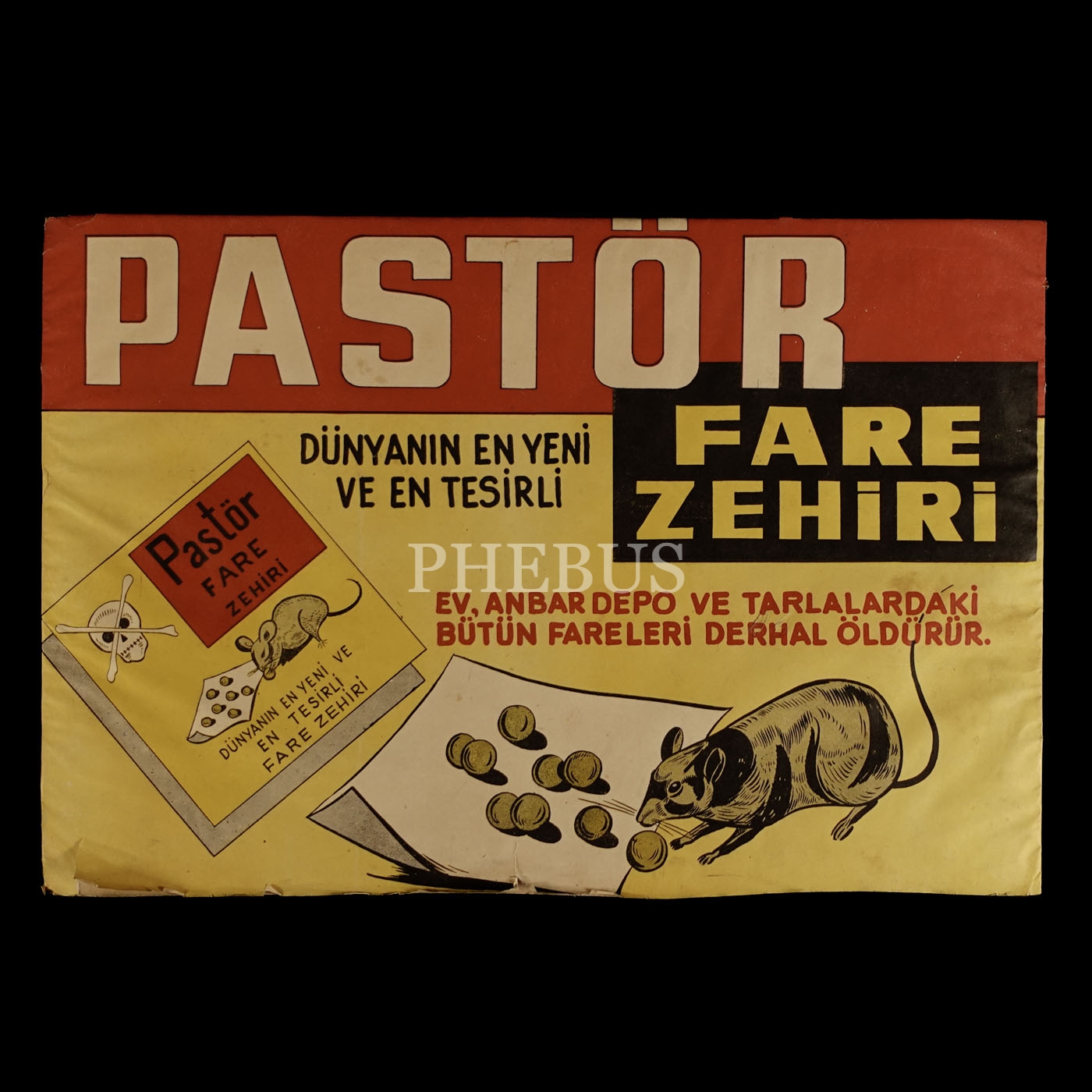 PASTÖR Fare Zehiri reklam kartoneti, "Ev, anbar, depo ve tarlalardaki bütün fareleri derhal öldürür", 50x33 cm...