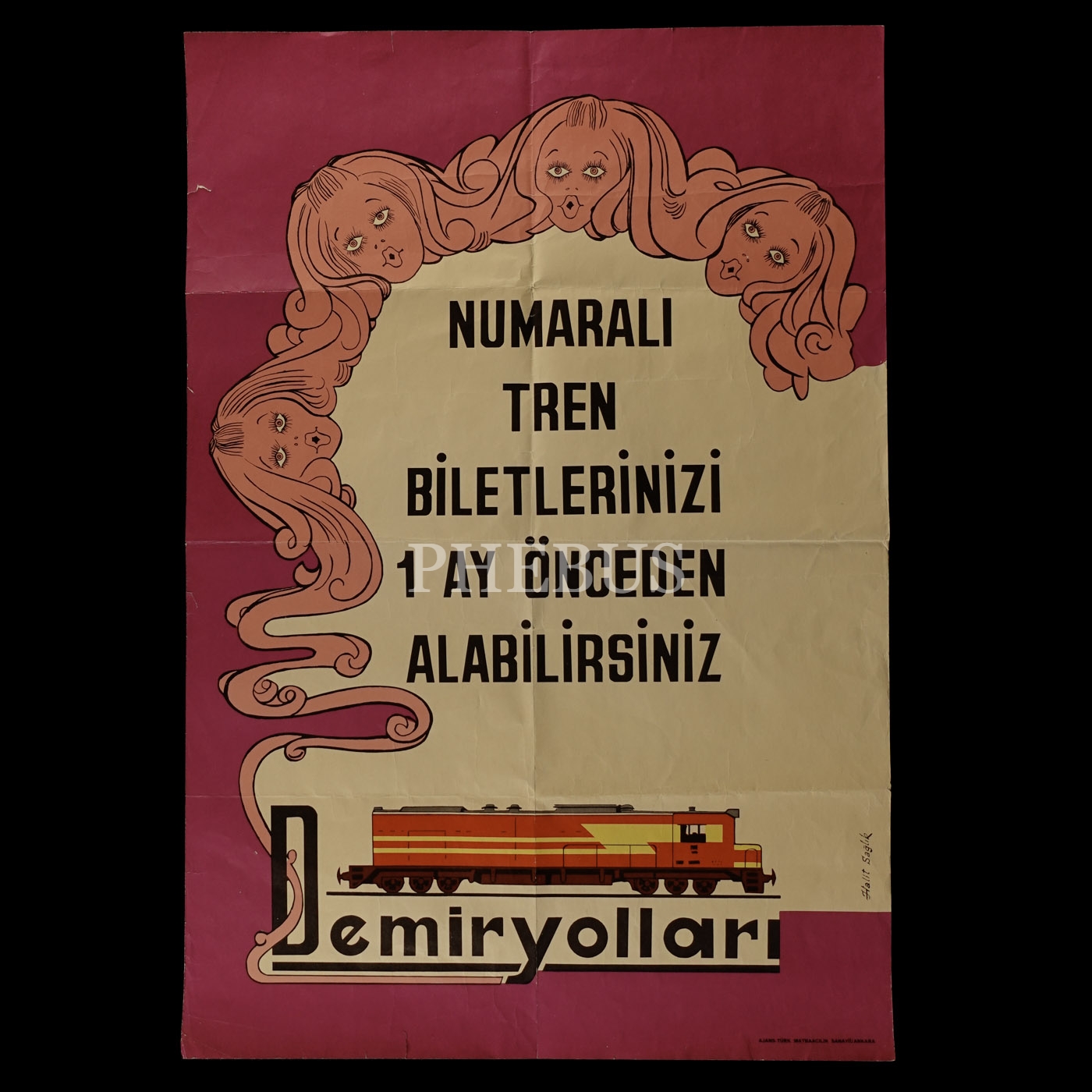 Halit Sağlık tasarımlı, "Numaralı Tren Biletlerinizi 1 Ay Önceden Alabilirsiniz" yazılı Demiryolları afişi, Ajans-Türk Matbaacılık Sanayii, 55x80 cm...