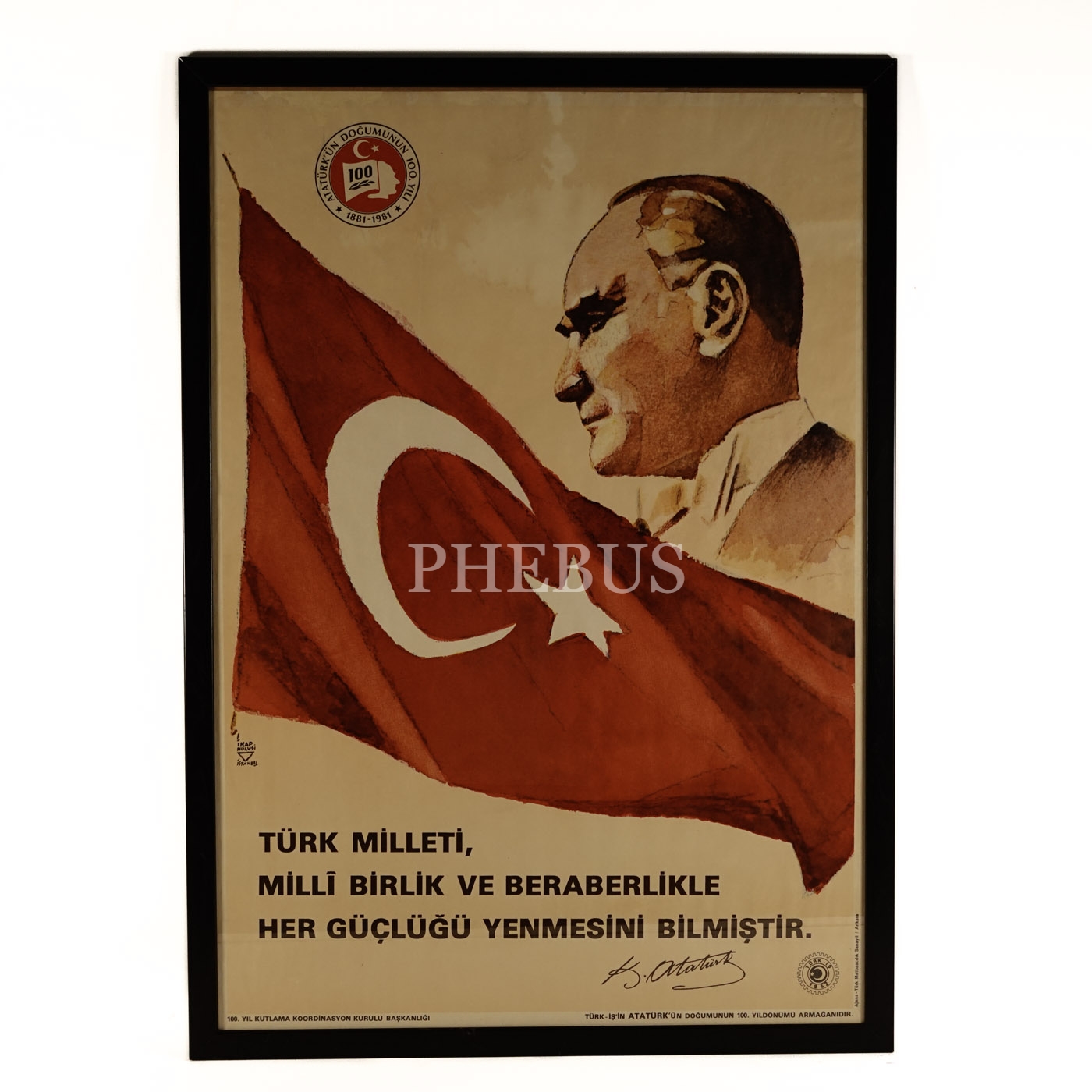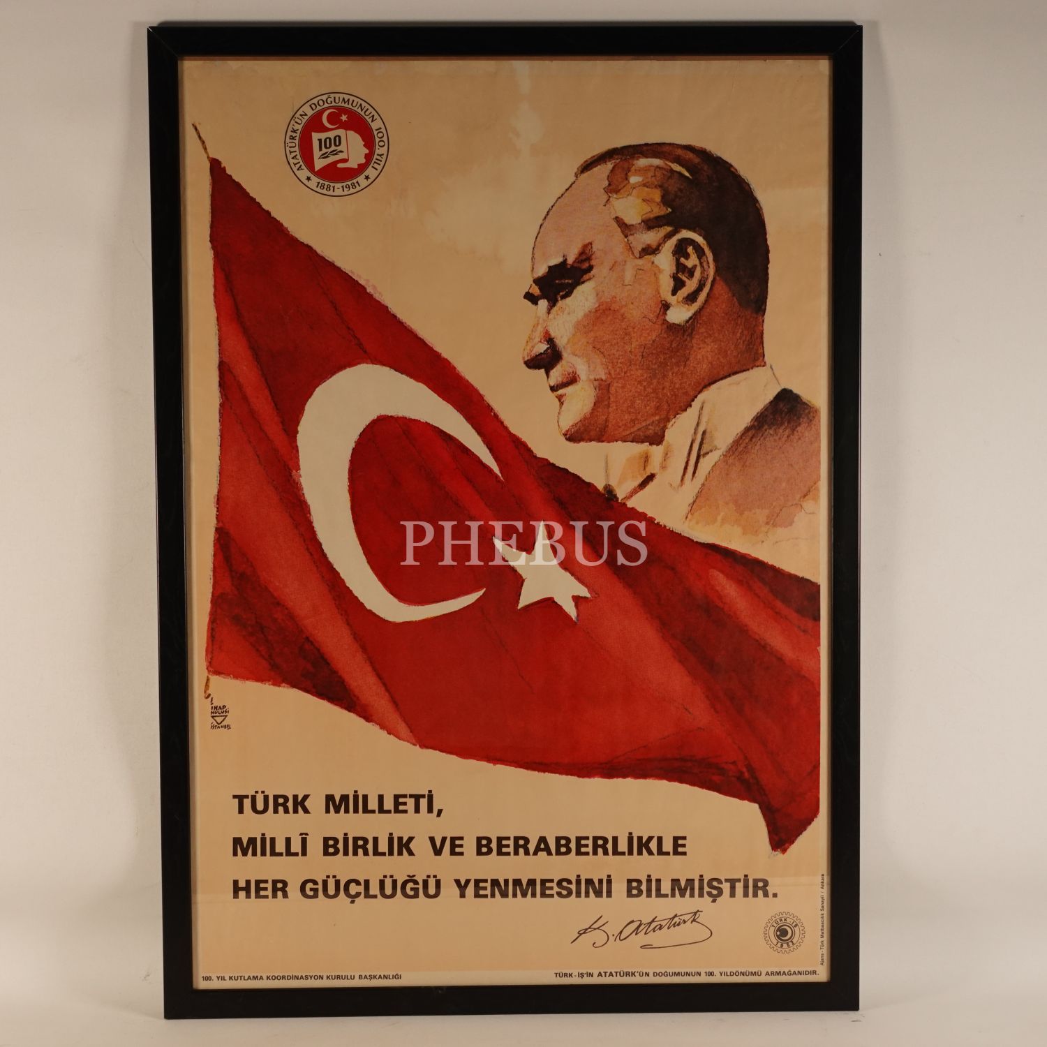 İhap Hulusi tasarımlı, Atatürk´ün doğumunun 100. yıldönümü konulu afiş, Türkiye İşçi Sendikaları Konfederasyonu (TÜRK-İŞ), Ajans Türk Matbaacılık Sanayii, çerçevesiyle birlikte 75x106 cm...