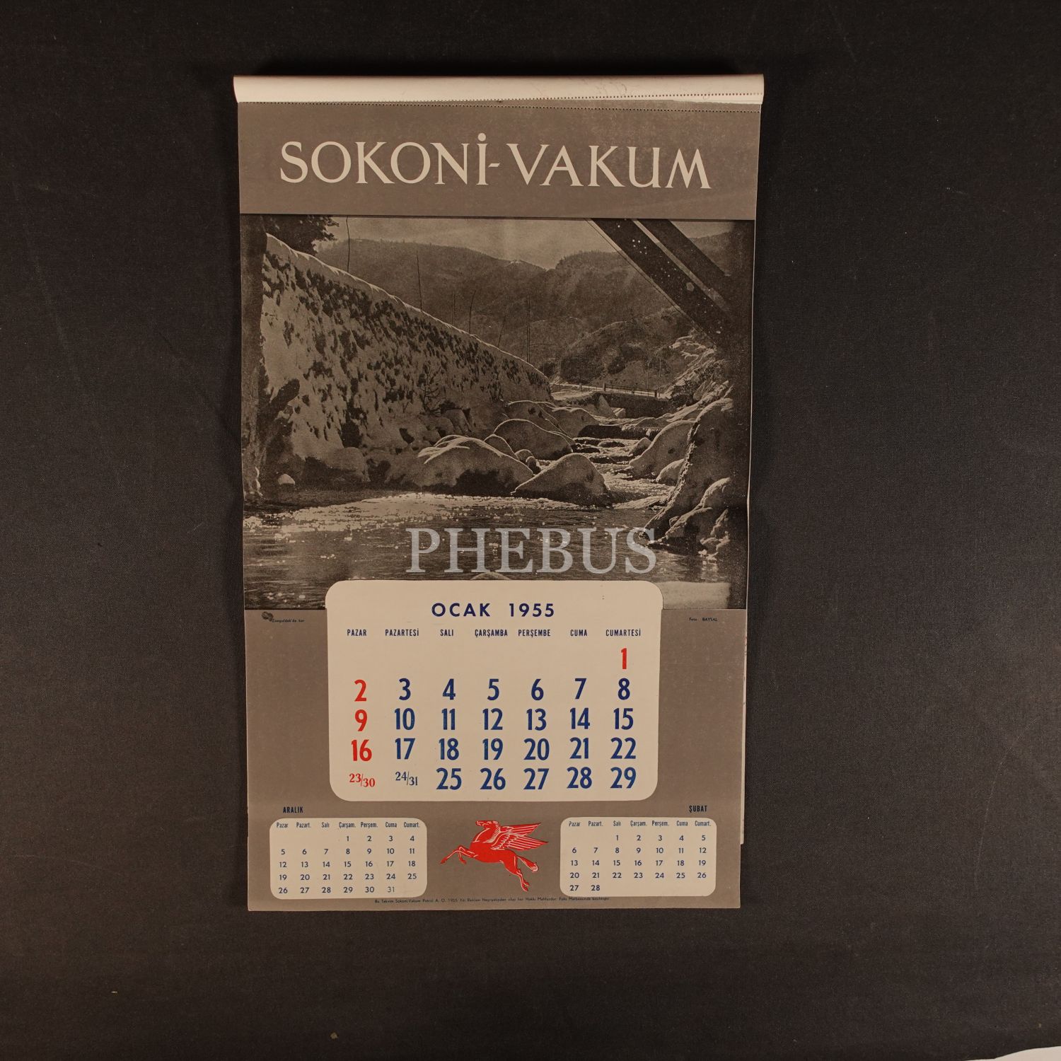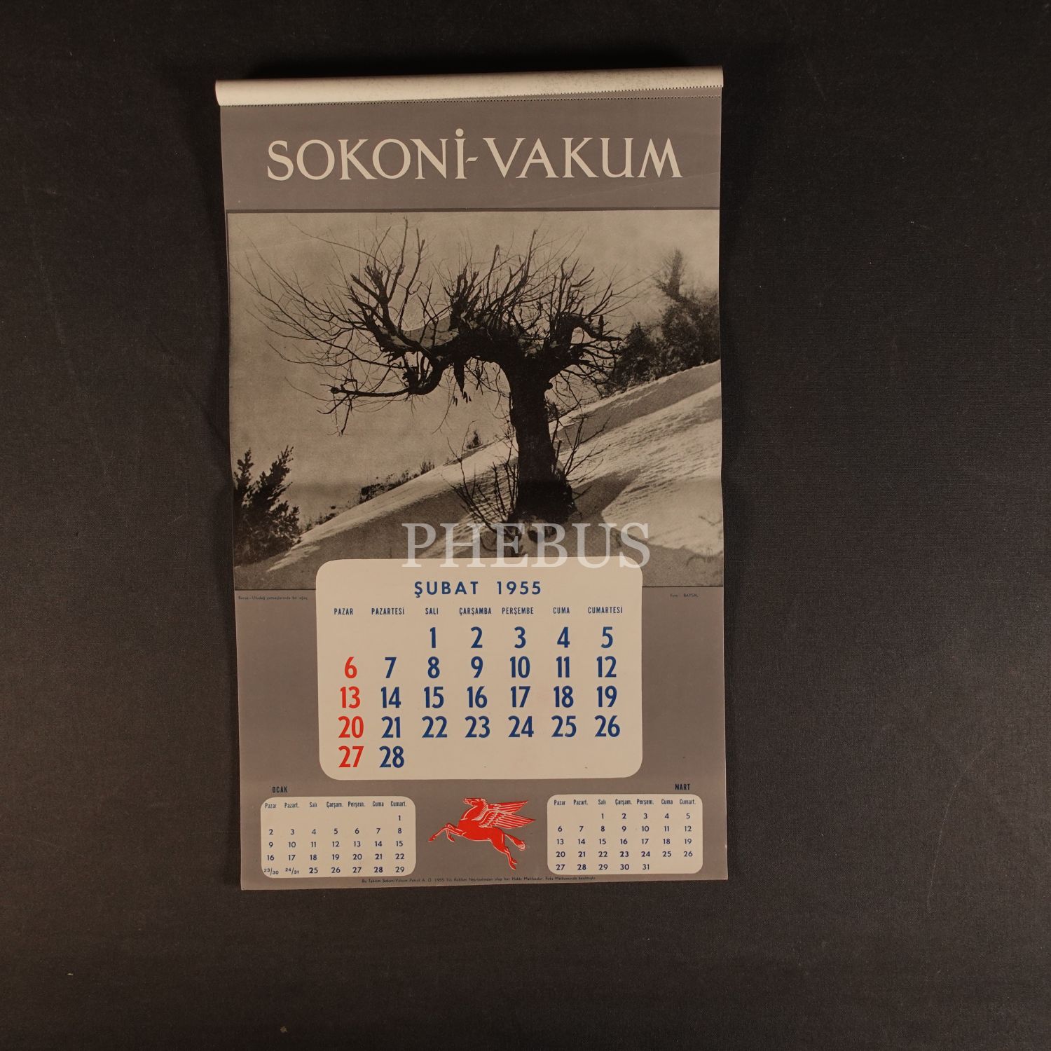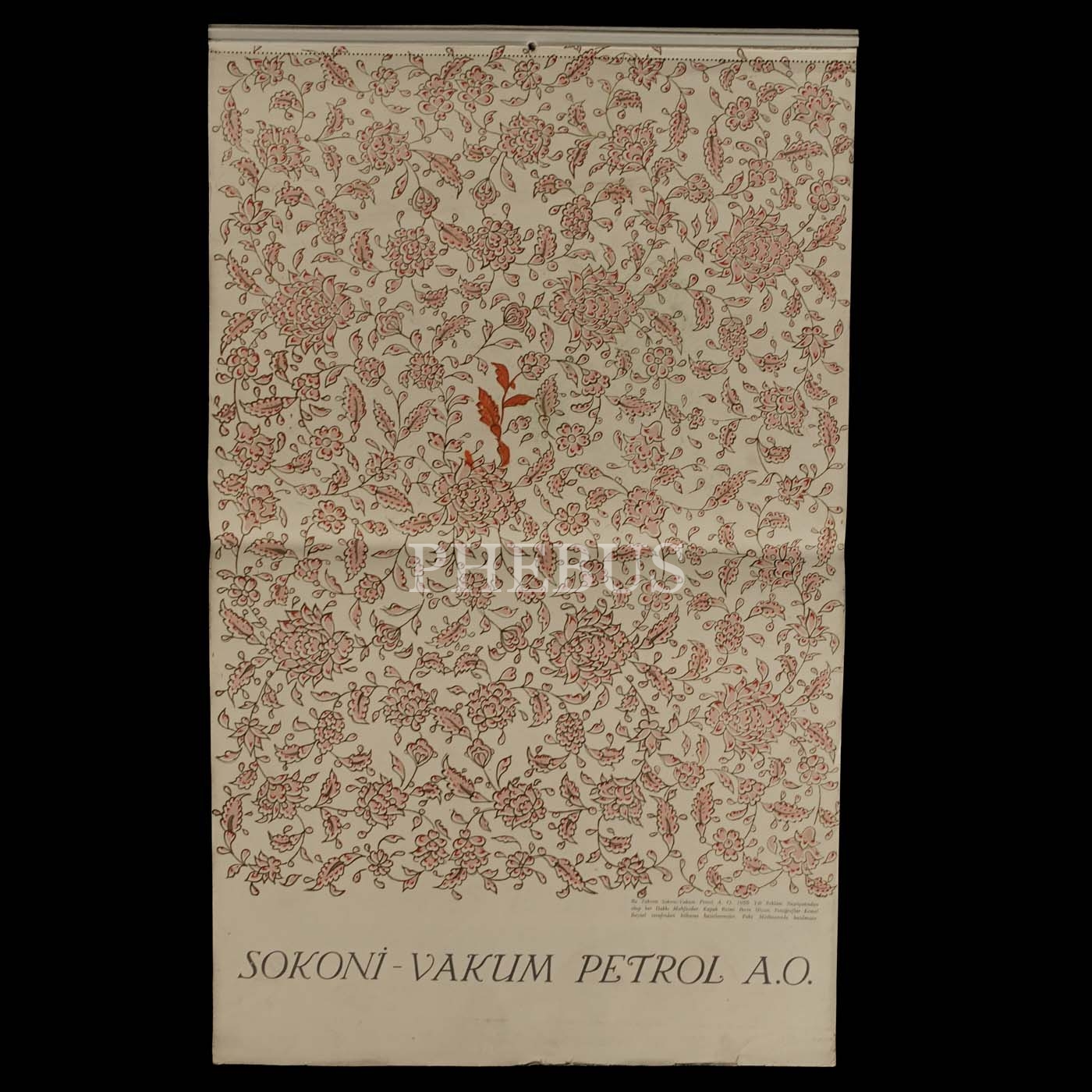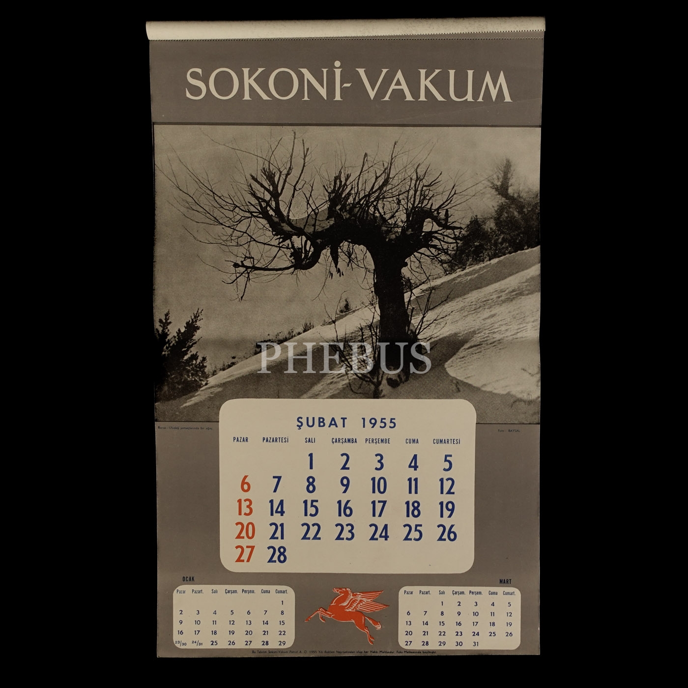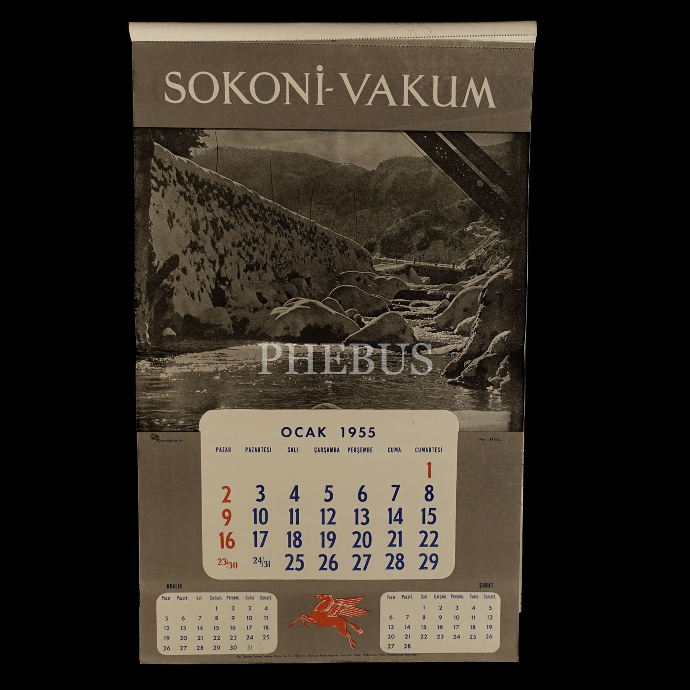 SOKONİ - VAKUM PETROL A.O. reklamlı 1955 duvar takvimi, kapak resmi: Berin Urcan - fotoğraflar: Kemal Baysal, Foks Matbaası, 30x49 cm...