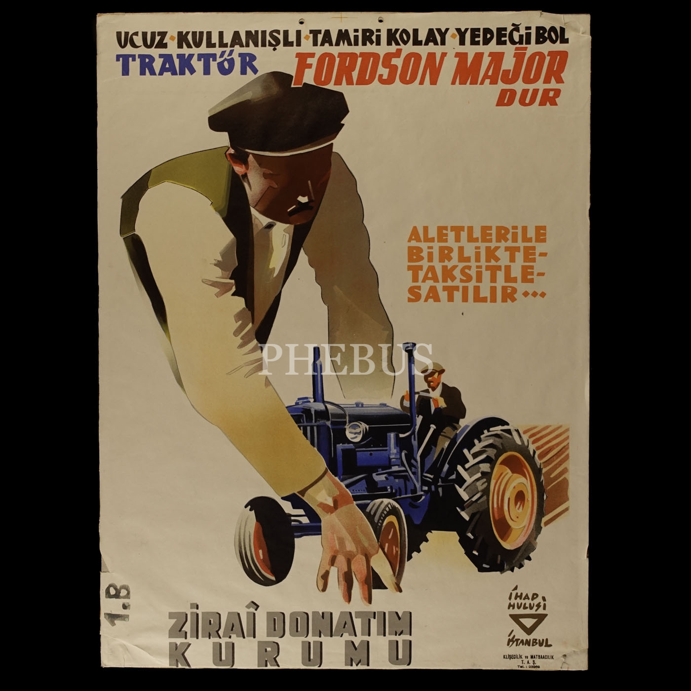 İhap Hulusi tasarımlı Ziraî Donatım Kurumu afişi, "Ucuz, Kullanışlı, Tamiri Kolay, Yedeği Bol Traktör FORDSON MAJOR´DUR - Aletlerile Birlikte Taksitle Satılır", Klişecilik ve Matbaacılık T.A.Ş., 50x66,5 cm...
