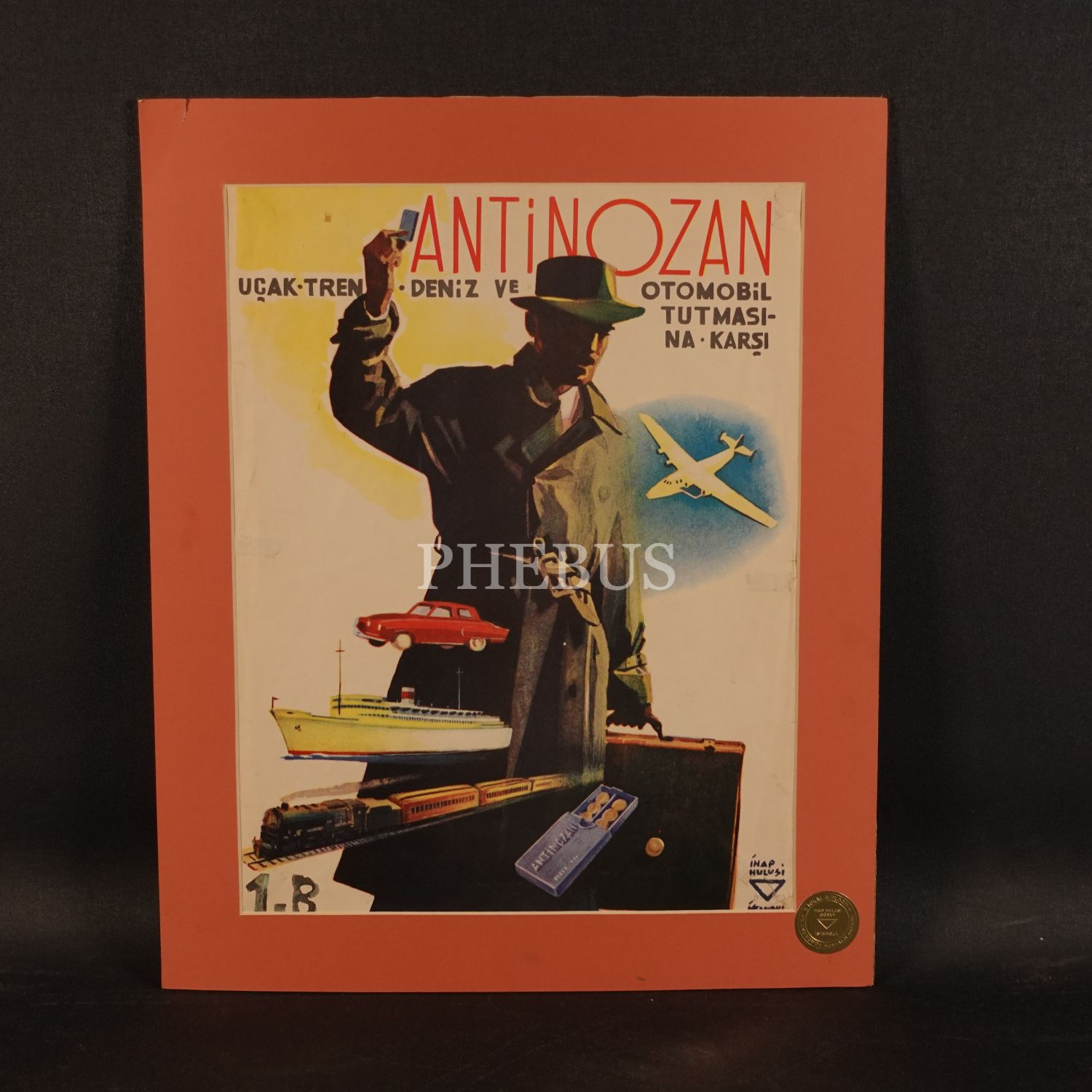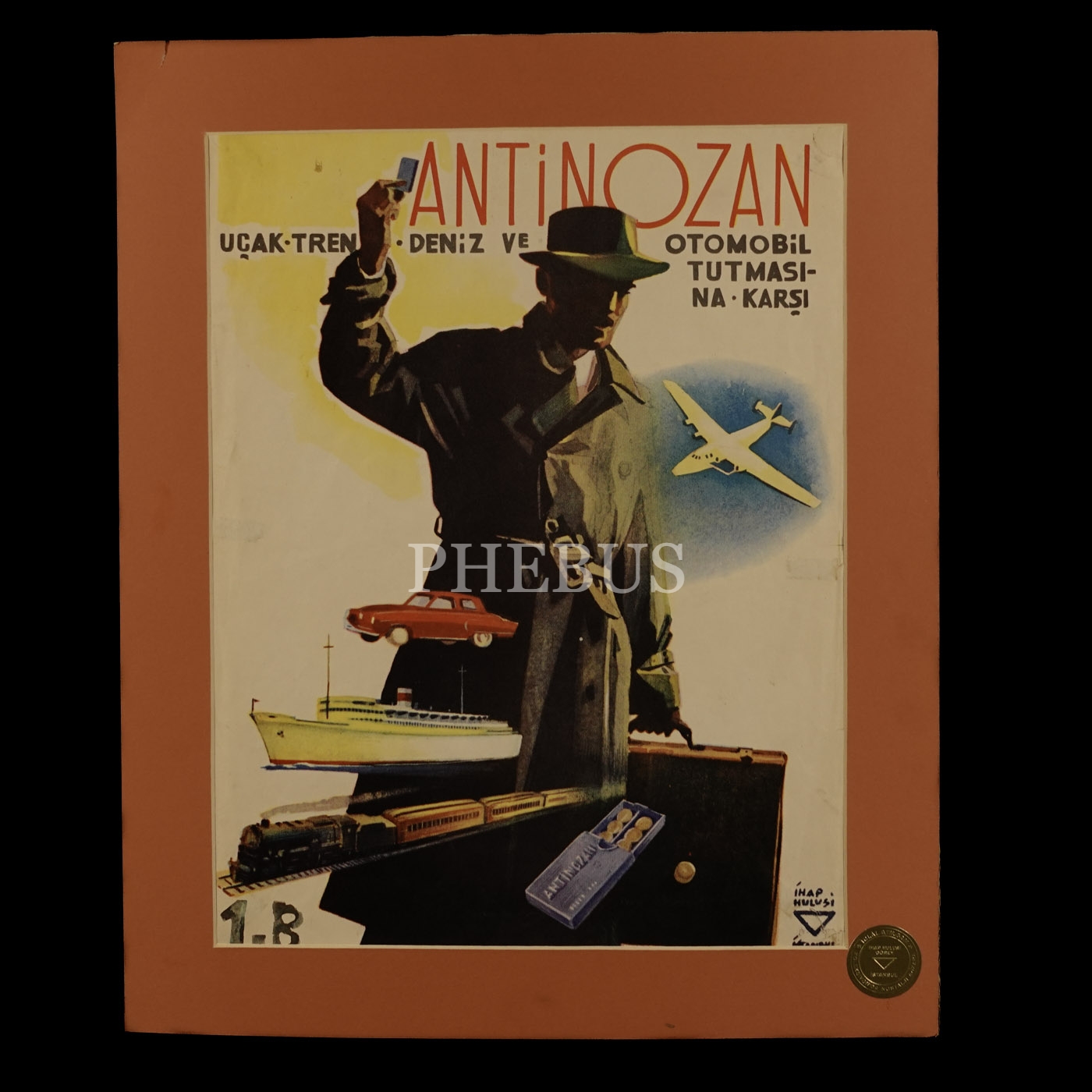 İhap Hulusi tasarımlı Antinozan Bulantı Giderici afişi, "Uçak, tren, deniz ve otomobil tutmasına karşı", 44x54 cm...