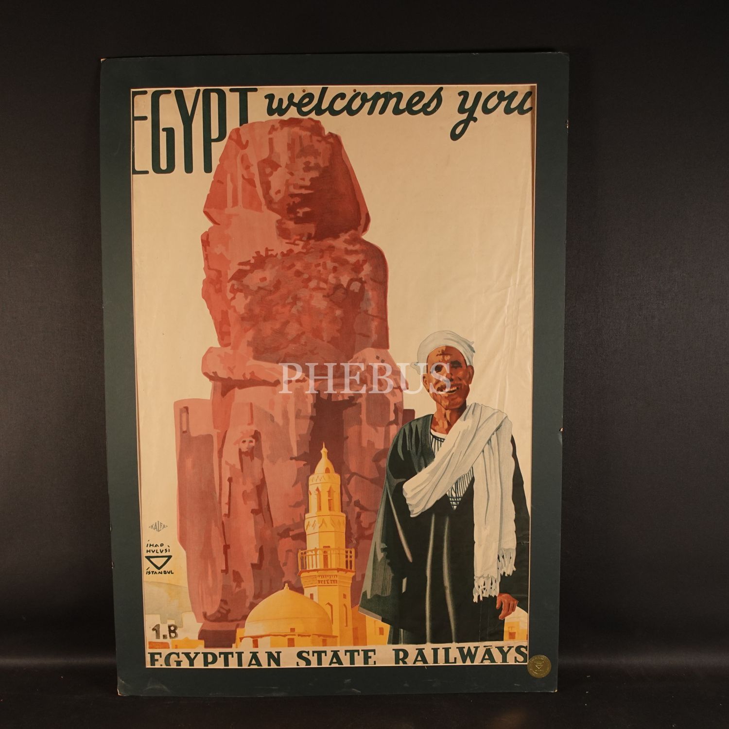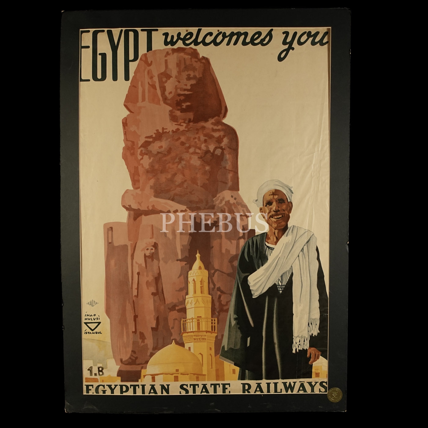 İhap Hulusi tasarımlı Mısır Devlet Demiryolları afişi, "Egypt welcomes you", Egyptian State Railways, 75x105 cm...