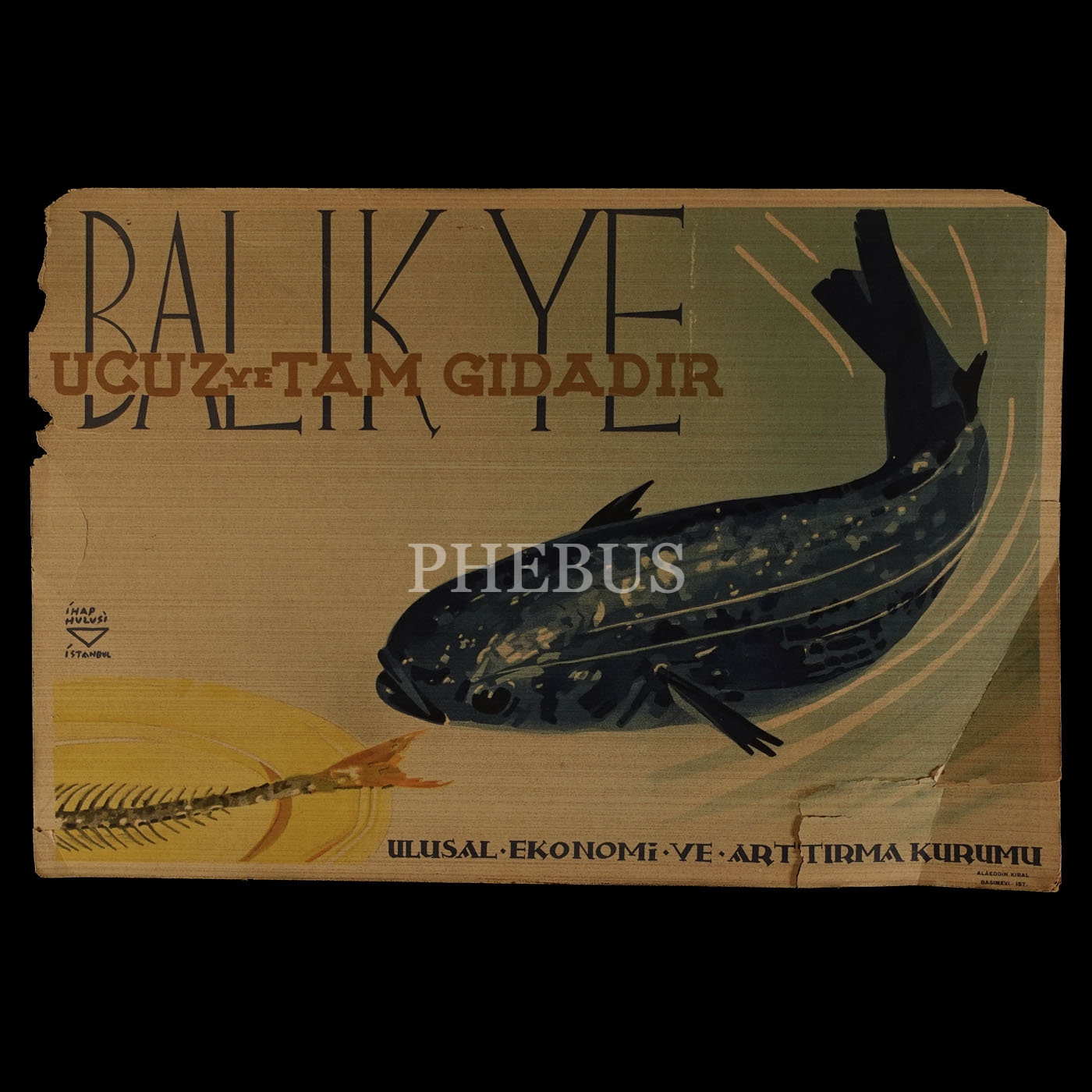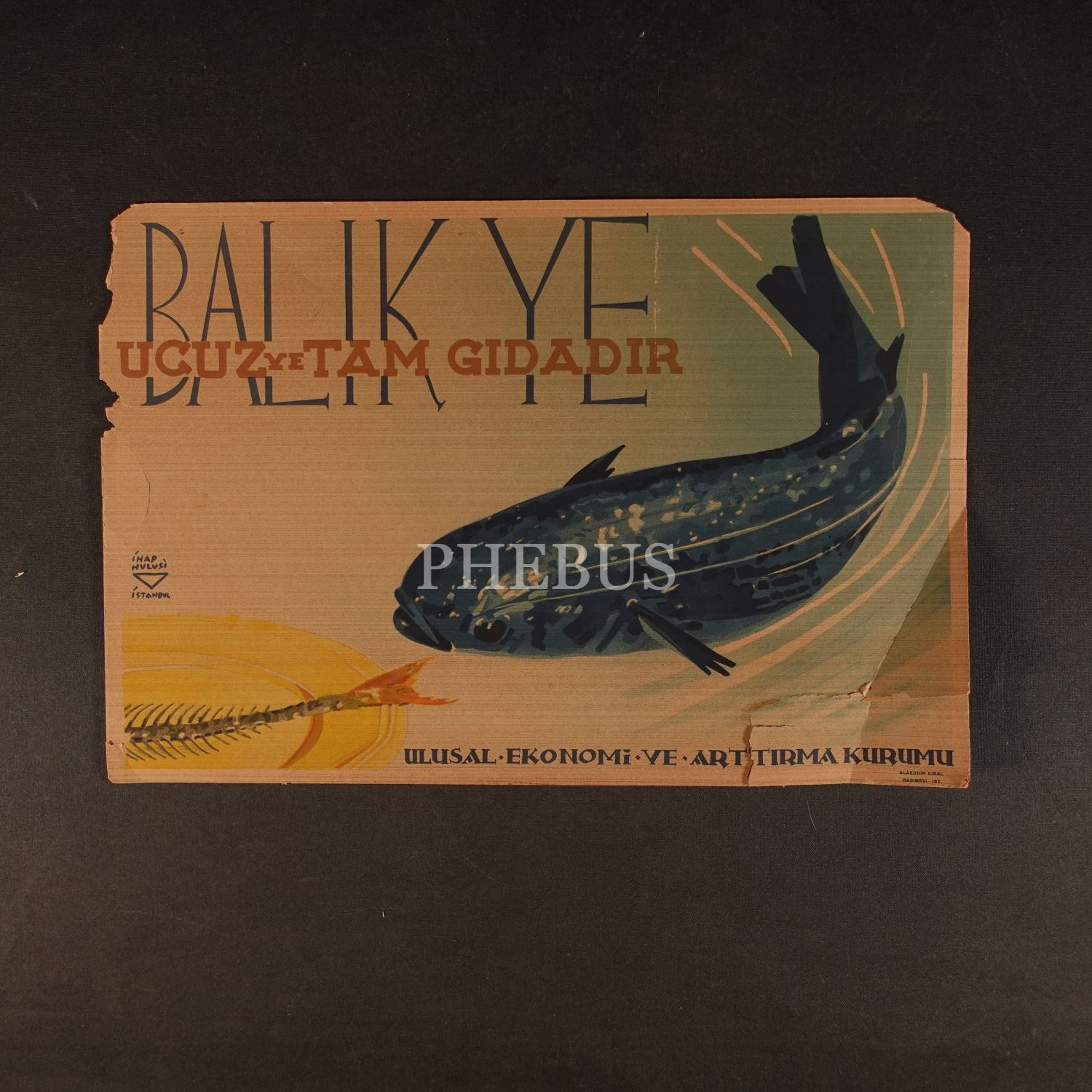 İhap Hulusi tasarımlı Ulusal Ekonomi ve Arttırma Kurumu afişi, "Balık Ye: Ucuz ve Tam Gıdadır", Alâeddin Kıral Basımevi, 49x33 cm...