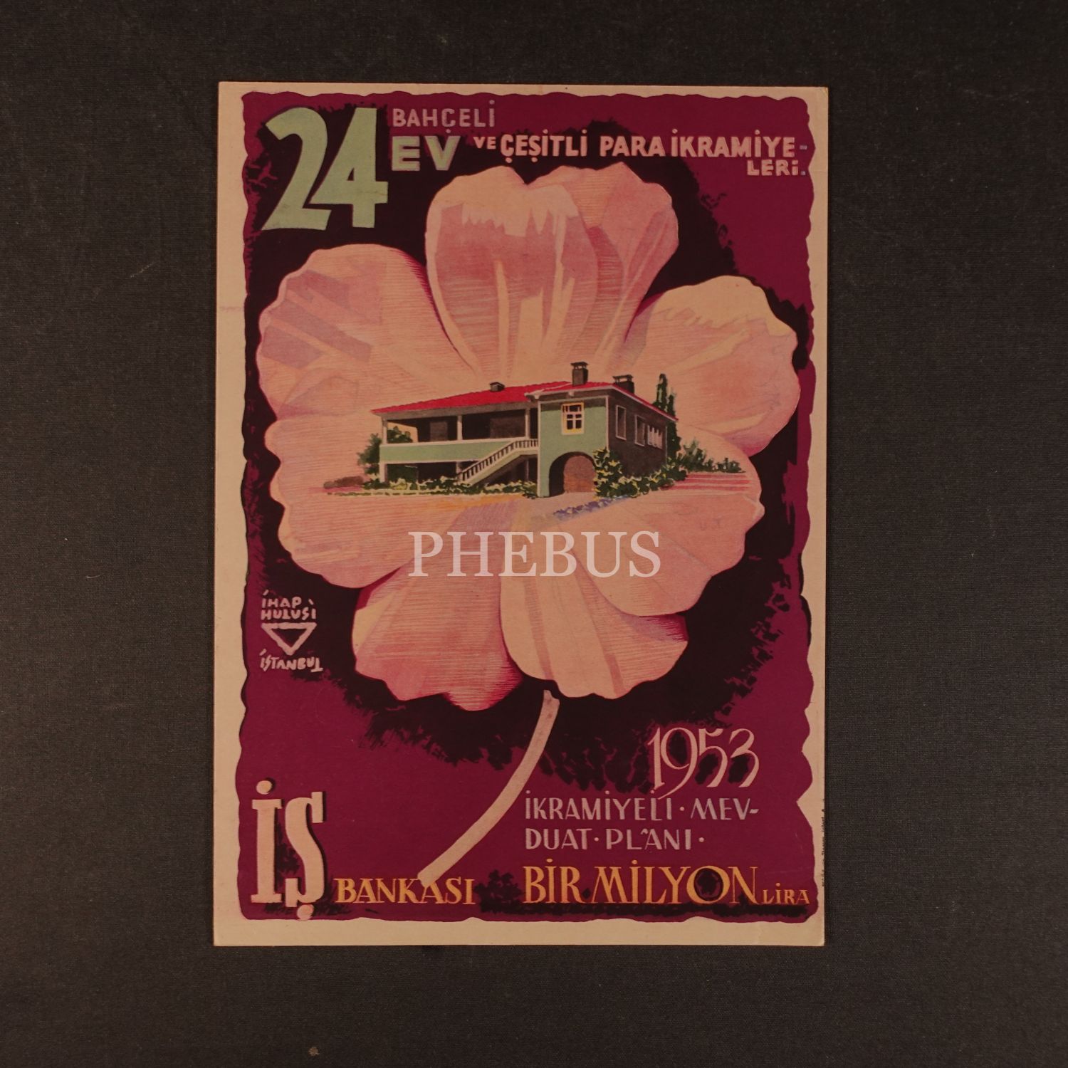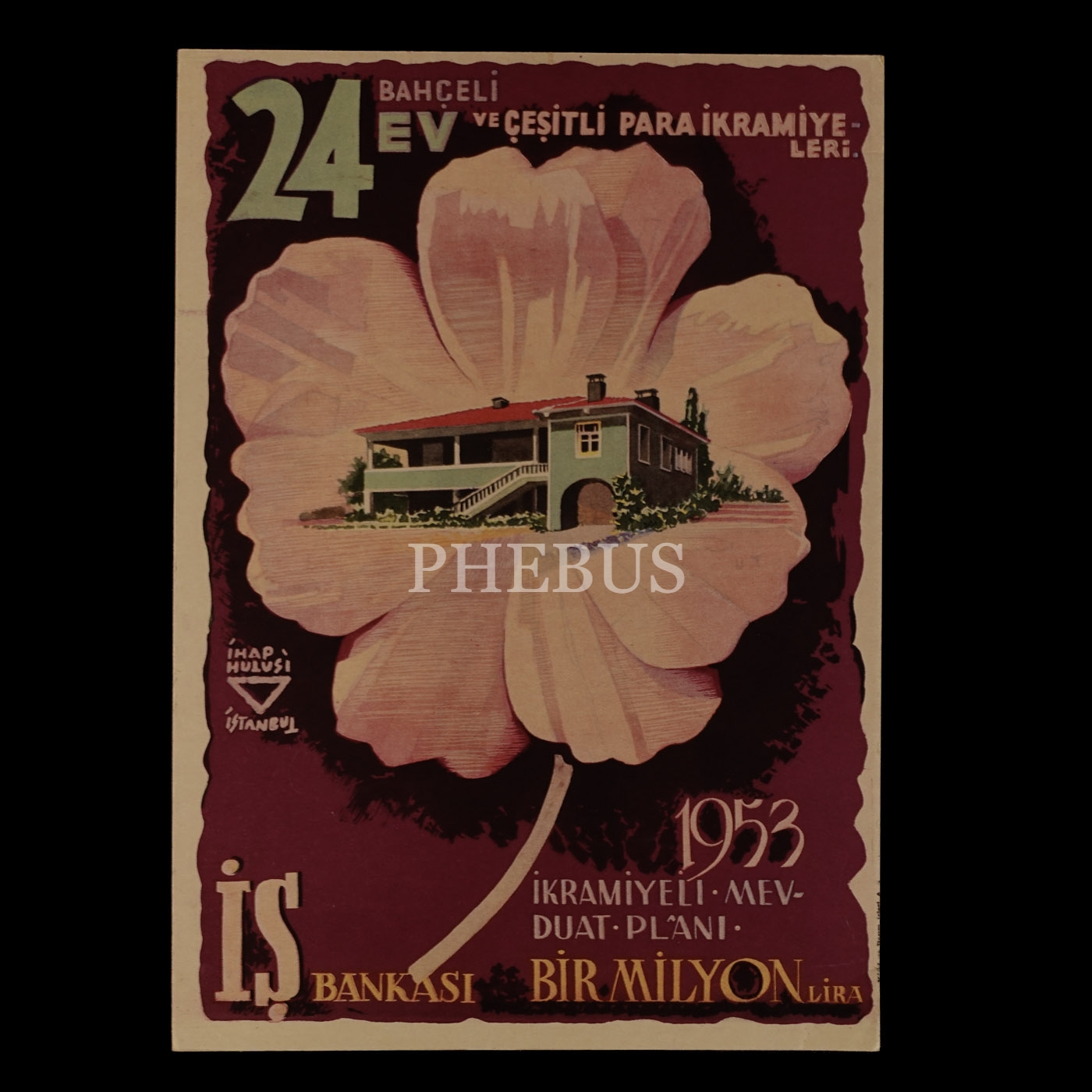 İhap Hulusi tasarmlı Türkiye İş Bankası afişi, "1953 İkramiyeli Mevduat Plânı: Bir Milyon Lira, 24 Bahçeli Ev ve Çeşitli Para İkramiyeleri", 25x35 cm...