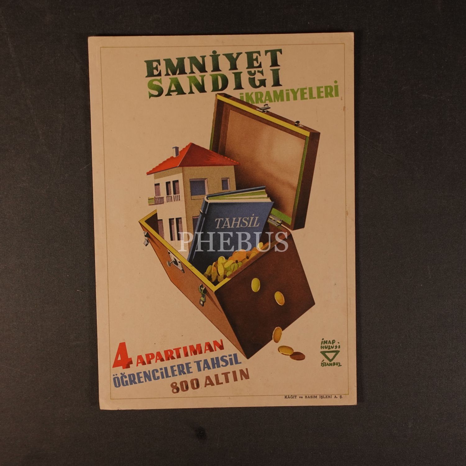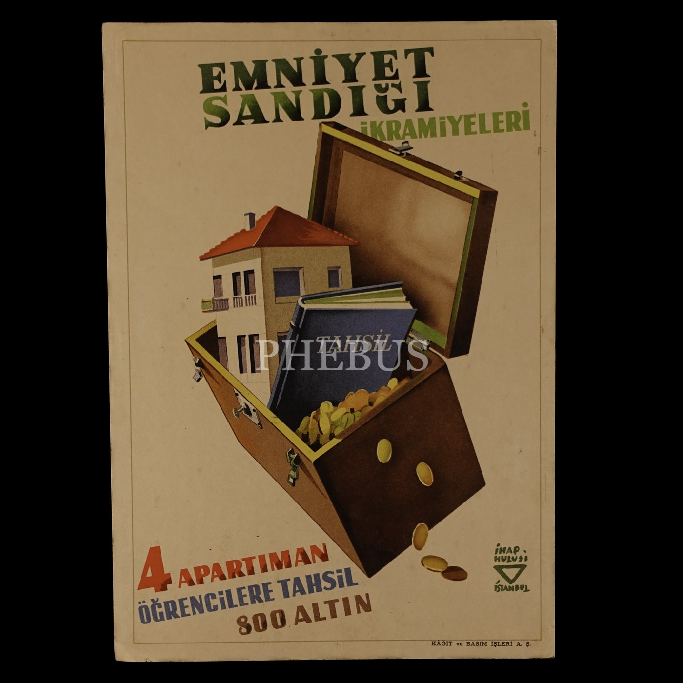 İhap Hulusi tasarımlı Emniyet Sandığı afişi, "Emniyet Sandığı İkramiyeleri: 4 Apartıman, Öğrencilere Tahsil 800 Altın", Kâğıt ve Basım İşleri A.Ş., 26x37 cm...