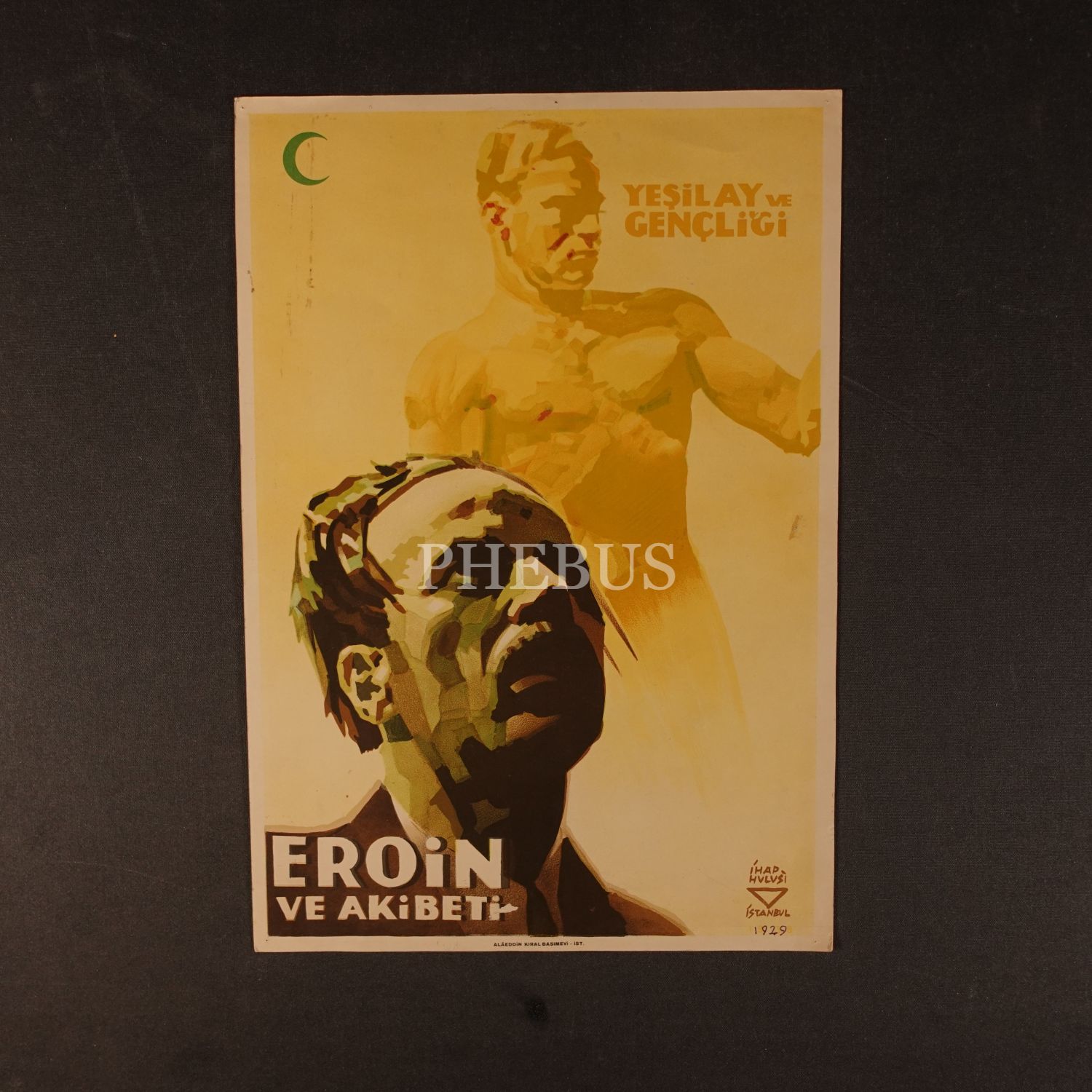 İhap Hulusi tasarımlı Yeşilay afişi, "Yeşilay ve Gençliği / Eroin ve Akıbeti", Alâeddin Kıral Basımevi, 29x42 cm...