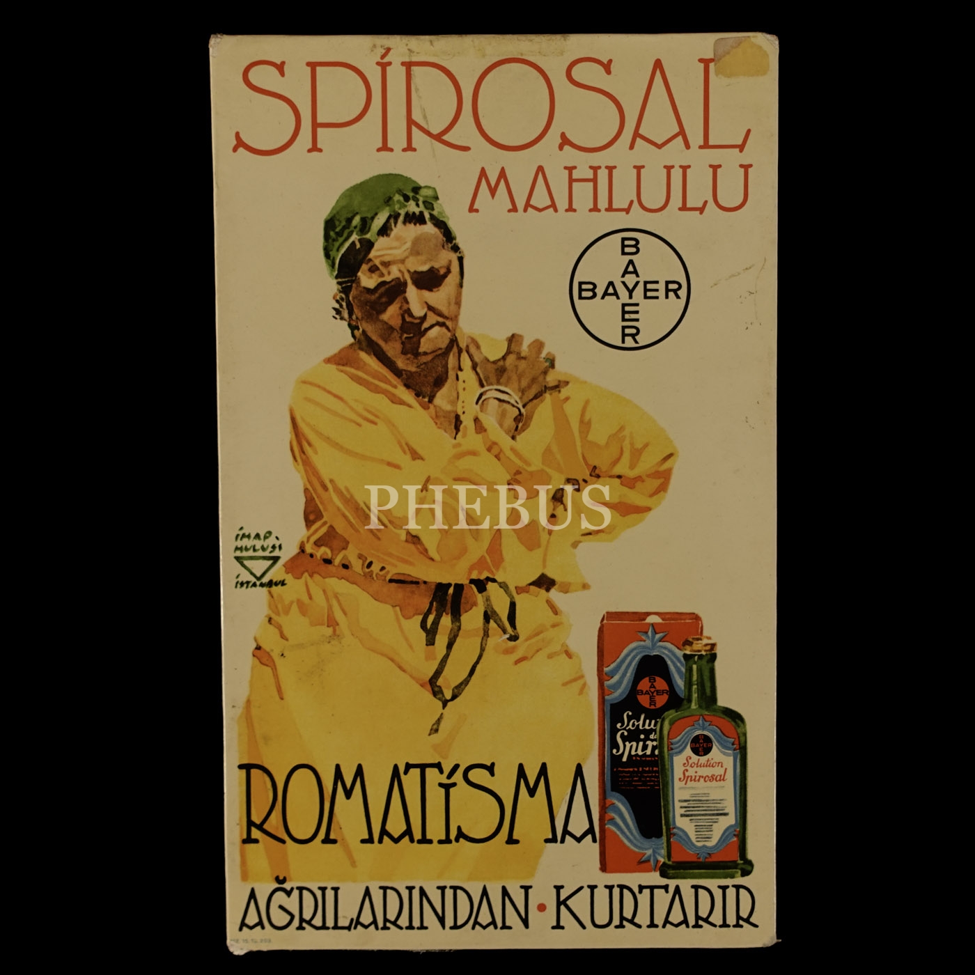 İhap Hulusi tasarımlı, BAYER marka romatizma ilacı Spirosal Mahlulu reklam kartoneti, "BAYER Spirosal Mahlulu Romatisma Ağrılarından Kurtarır", 20x33 cm...