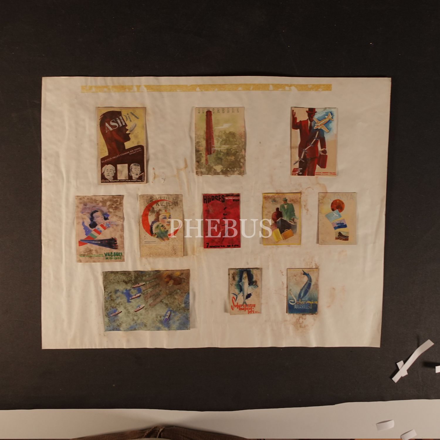 Lot içeriğinden başlık atılan çalışmalar: 1) Asipin 2) Sümerbank 3) Vagonli 4) Kızılay 5) Hürses (gazete) 6) Antalya 7) Sularımızın mahsulleri (2 adet)