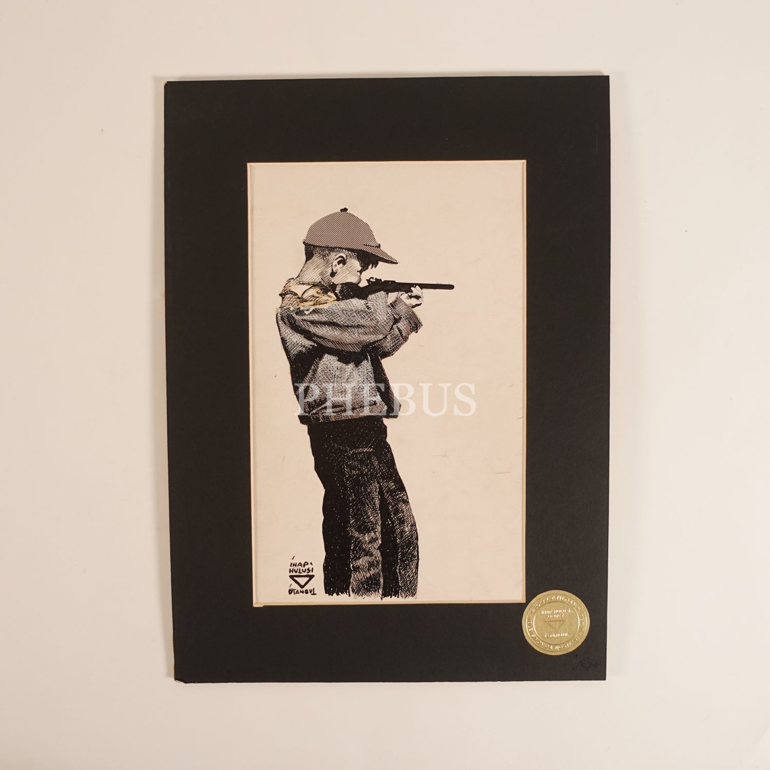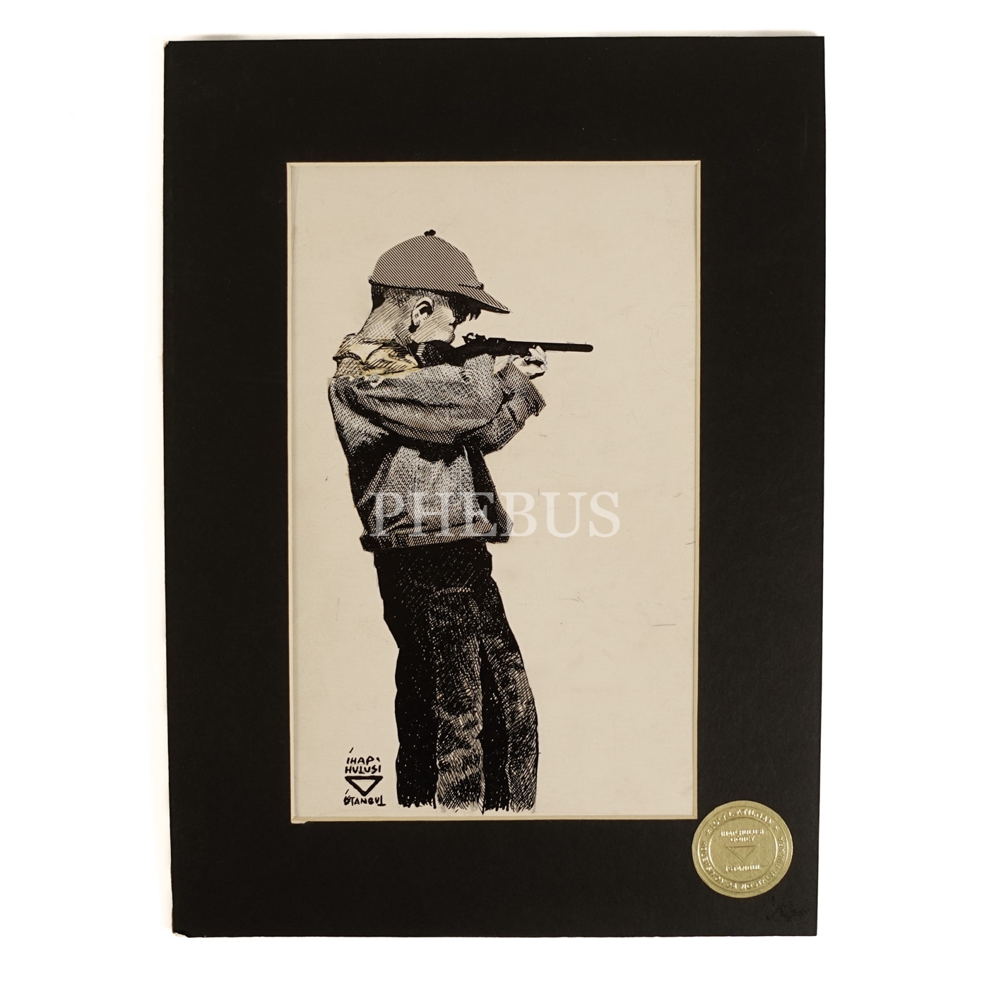 İhap Hulusi´nin ıslak imzasıyla tüfekli çocuk temalı orijinal çizim, kâğıt üzeri çini mürekkebi, 26x36 cm...