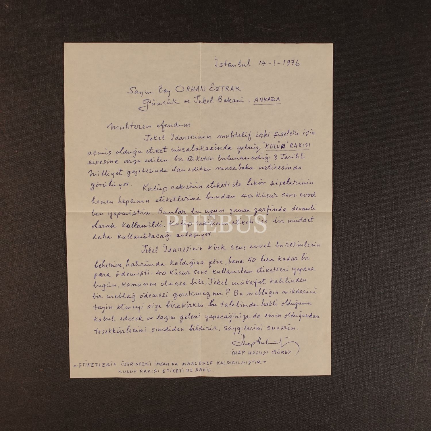 İhap Hulusi´nin, 14 Ocak 1976 tarihinde dönemin Gümrük ve Tekel Bakanı Orhan Öztrak´a hitaben kaleme aldığı, 40 sene evvel kendisinin yaptığı ve halen kullanılmakta olan Kulüp Rakısı etiketi için kendisine mükafat kabilinden bir ödeme yapılmasını rica ettiği el yazısı mektubu, 23x29 cm...