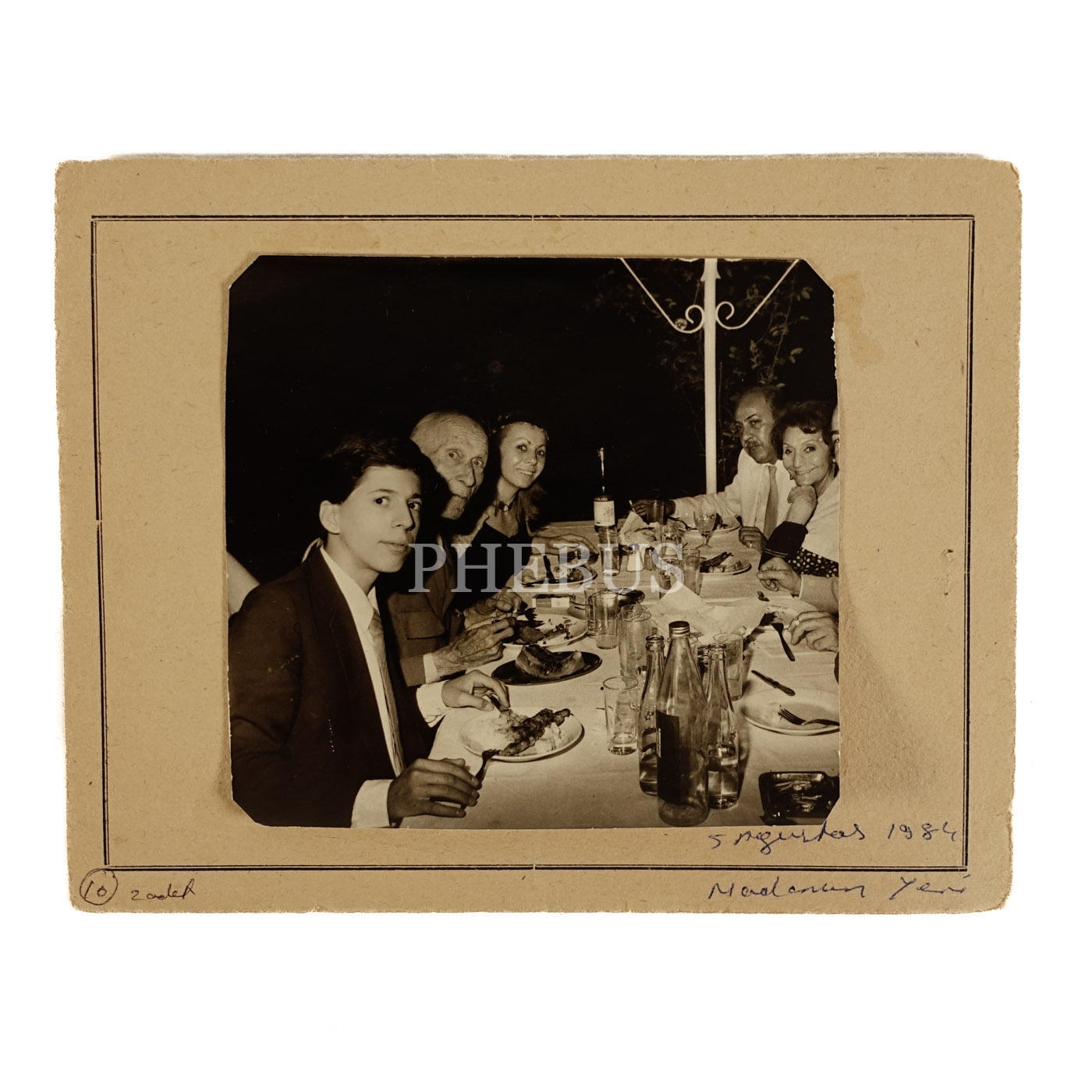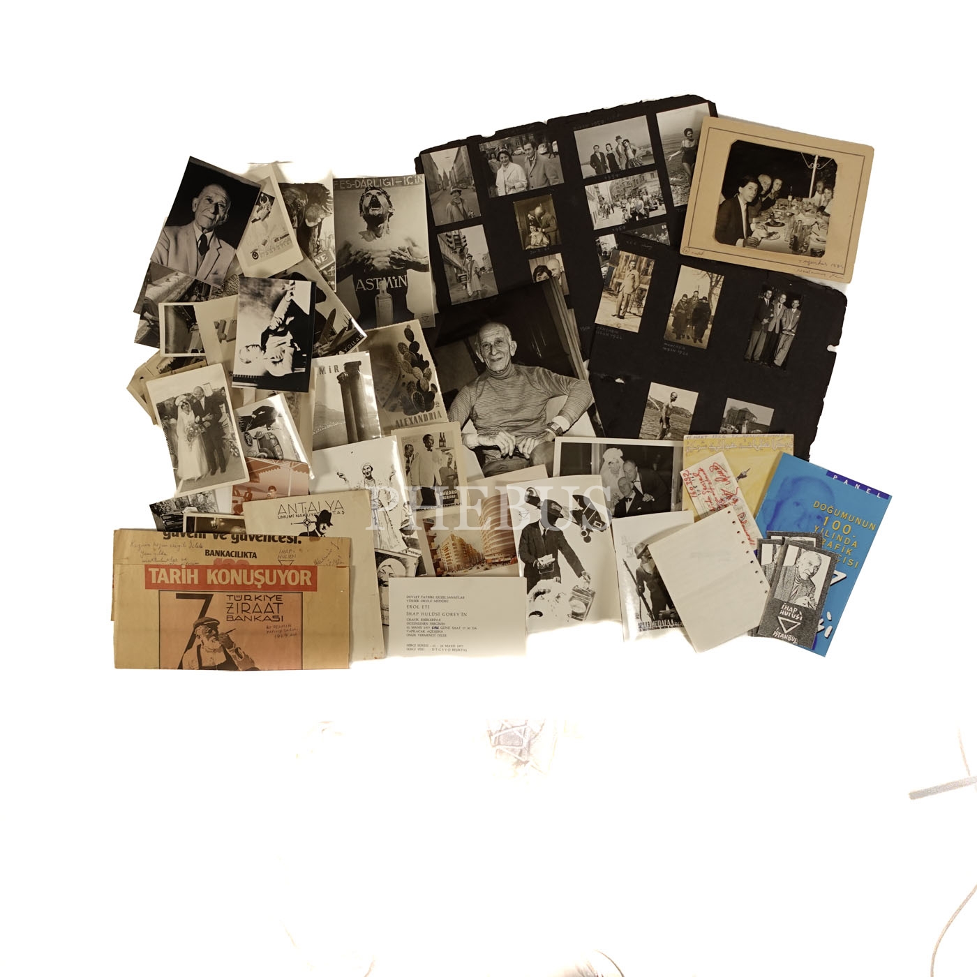 Lot içeriği: İhap Hulusi´nin özel fotoğraf albümünden, dördü ikinci baskı olmak üzere 48 adet fotoğraf (albüm sayfalarına yapışık bulunan 30 fotoğraftan birinde İhap Hulusi, şair İlhan Şevket Aykut ile birlikte görülmektedir), farklı yıllarda tasarlamış olduğu kurum, marka ve ürün afişlerinin fotoğrafları (16 adet), Ziraat Bankası´nın 120. Yılı vesilesiyle 1929 tarihli bir çizimi gazeteye çıkan İhap Hulusi´nin, el yazısıyla "Bu resmin yapılış tarihi 1929´dur" notunu düştükten sonra "Kuzum kızım sevgili İclale yeni yılda mutluluklar ve muvaffakiyetler dilerim" ithafıyla imzaladığı kupür, bir dergiden keserek kartona yapıştırdığı "Antalya Umumî Nakliyat T.A.Ş." reklamı (kendi tasarımı), 27 Mart 1985 tarihinde aldırdığı beyin sintigrafisinin makbuzu, kendisinin tasarladığı 19 Mayıs 1966 tarihli Millî Piyango biletinin, arka yüzüne "İşbu bilet Kadir Özalp, Nida Şensel ve İclâl Karaoğuza (İclal Atılgan) ait olmak üzere ortaklıdır." yazılmış ve ortaklar tarafından imzalanmış nüshası, 11-24 Mayıs 1977 tarihleri arasından Devlet Tatbiki Güzel Sanatlar Yüksekokulu´nda düzenlenen kişisel sergisinin davetiyesi, cenazesinde takılan yaka kartı (4 adet) ve Hacettepe Üniversitesi Güzel Sanatlar Fakültesi Grafik Bölümü´nün 28 Kasım 1998 tarihinde düzenlediği "Doğumunun 100. Yılında İhap Hulusi" panelinin davetiyesi...