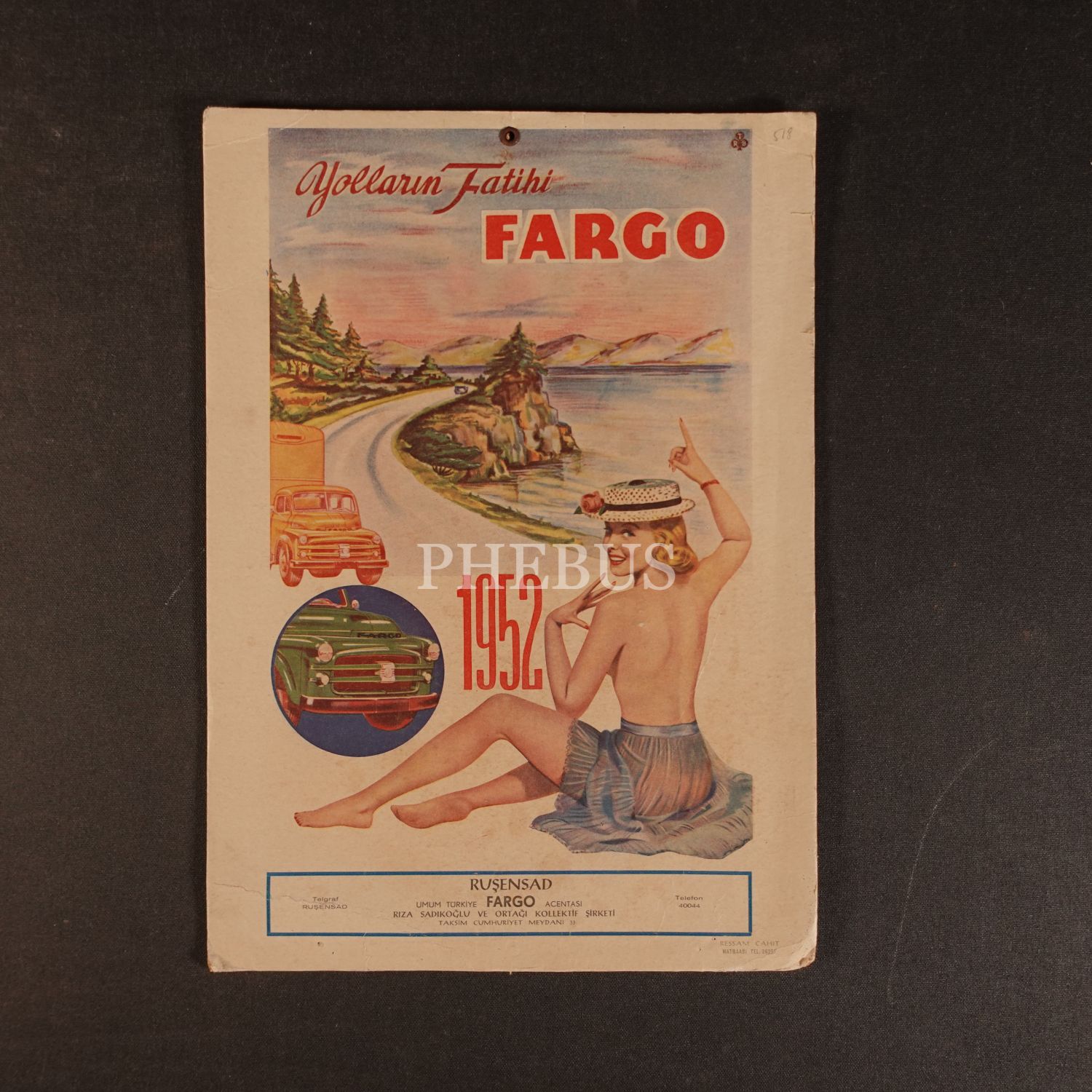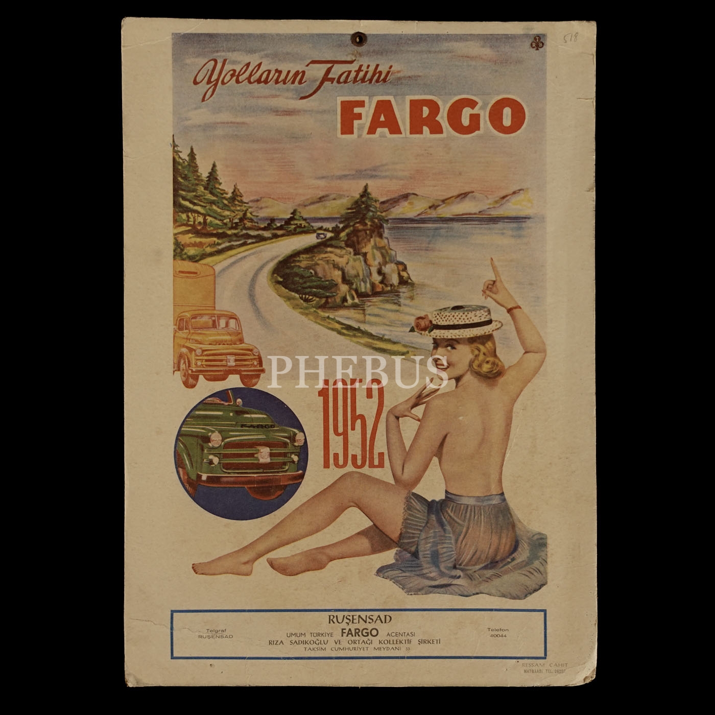 Ressam Cahit tasarımıyla Fargo kamyonetleri reklam kartoneti, "Yolların Fatihi FARGO", 1952, RUŞENSAD Umum Türkiye FARGO Acentası (Rıza Sadıkoğlu ve Ortağı Kollektif Şirketi), Ressam Cahit Matbaası, 24x34 cm...