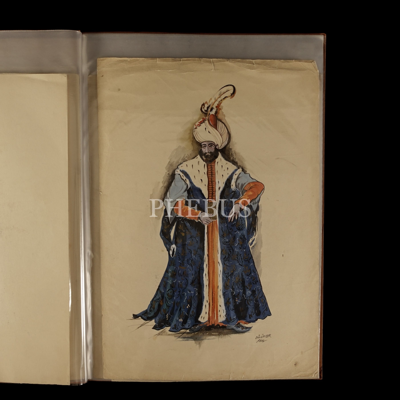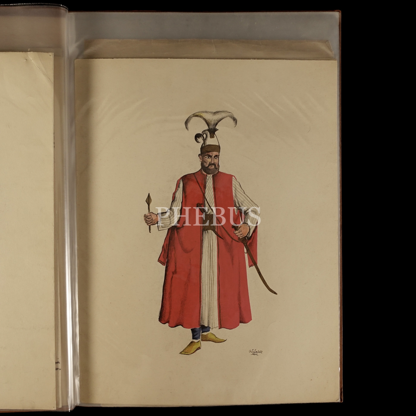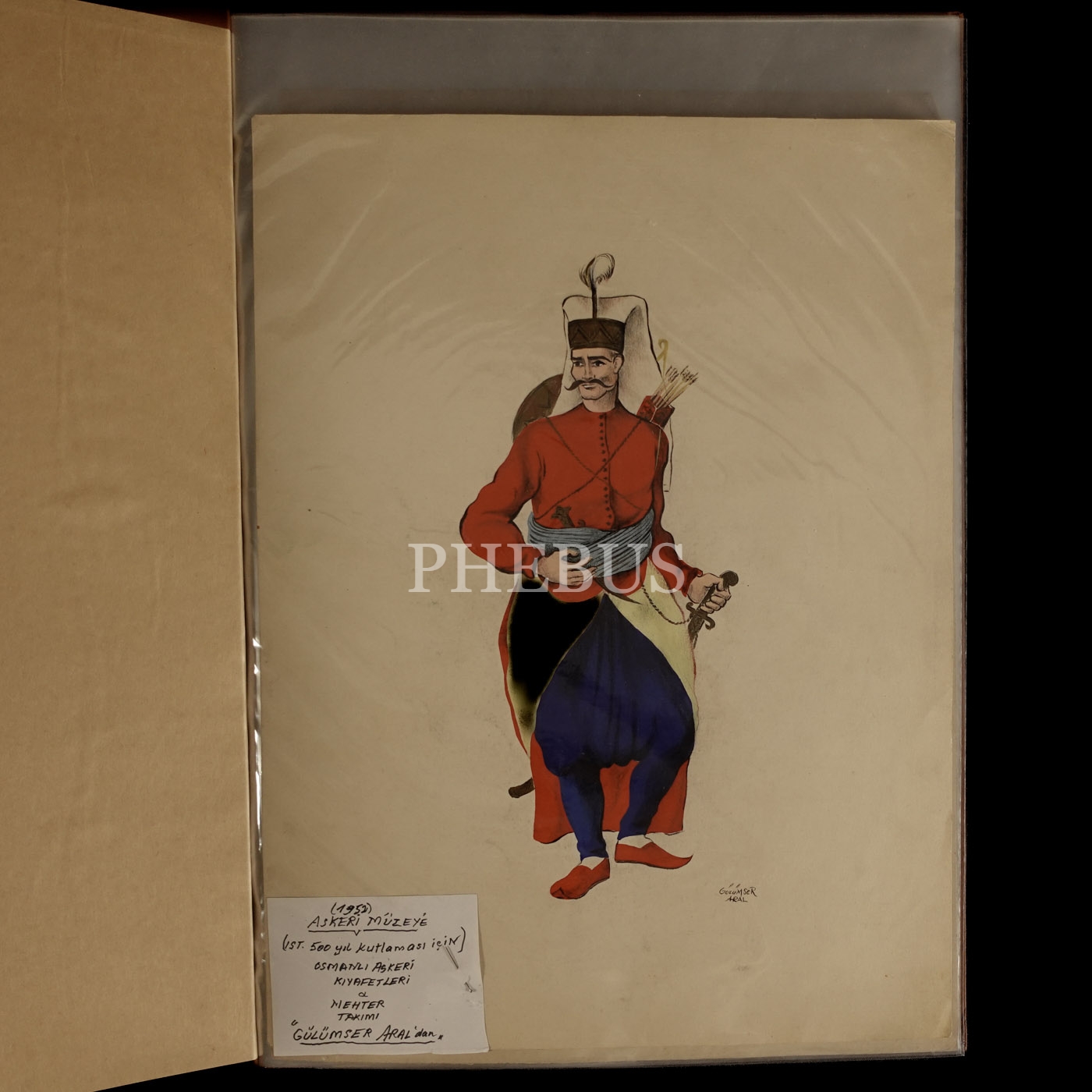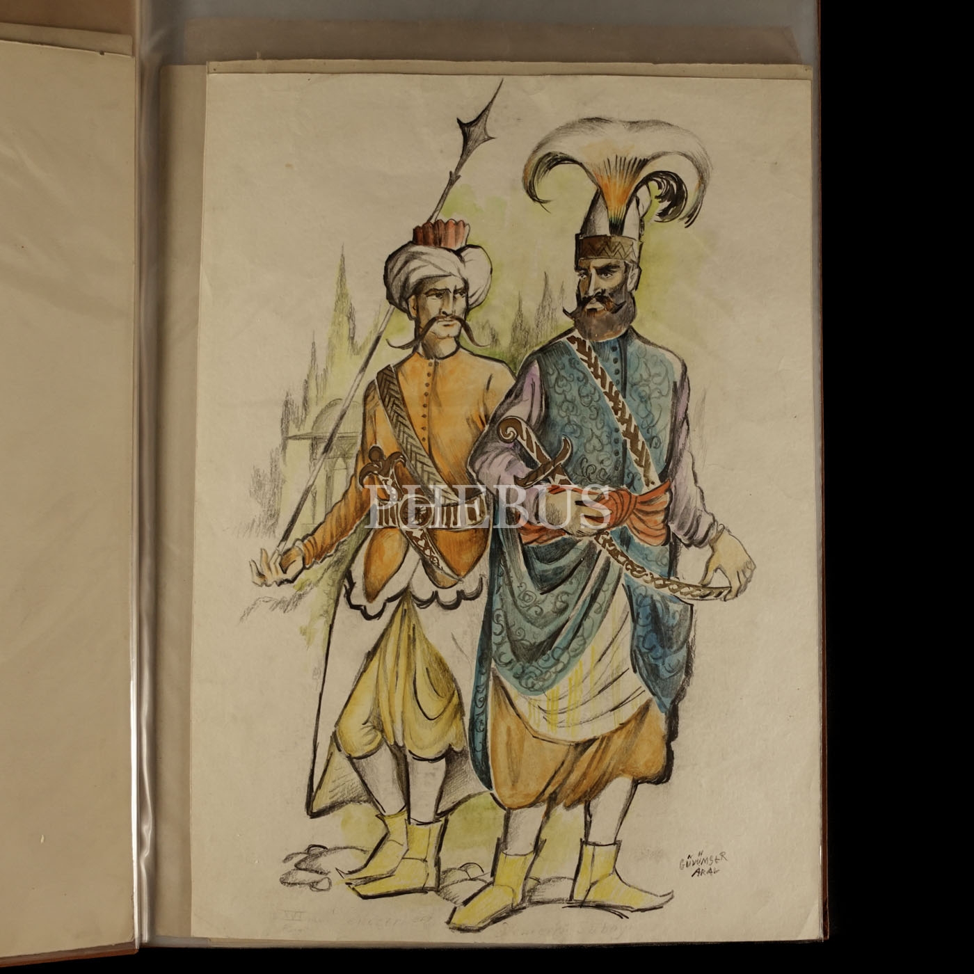 Gülümser Aral´ın, İstanbul´un Fethinin 500. Yıldönümünü Kutlamaları kapsamında Askeri Müze için hazırladığı, Osmanlı dönemi askeri ve sivil devlet erkanı kıyafet çizimleri (tamamı ıslak imzalı 13 adet çizim) ile eskiz çalışmaları (35 adet), 1952, ortalama 34x45 cm...