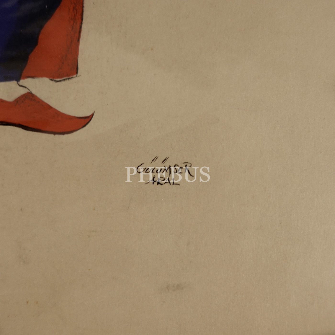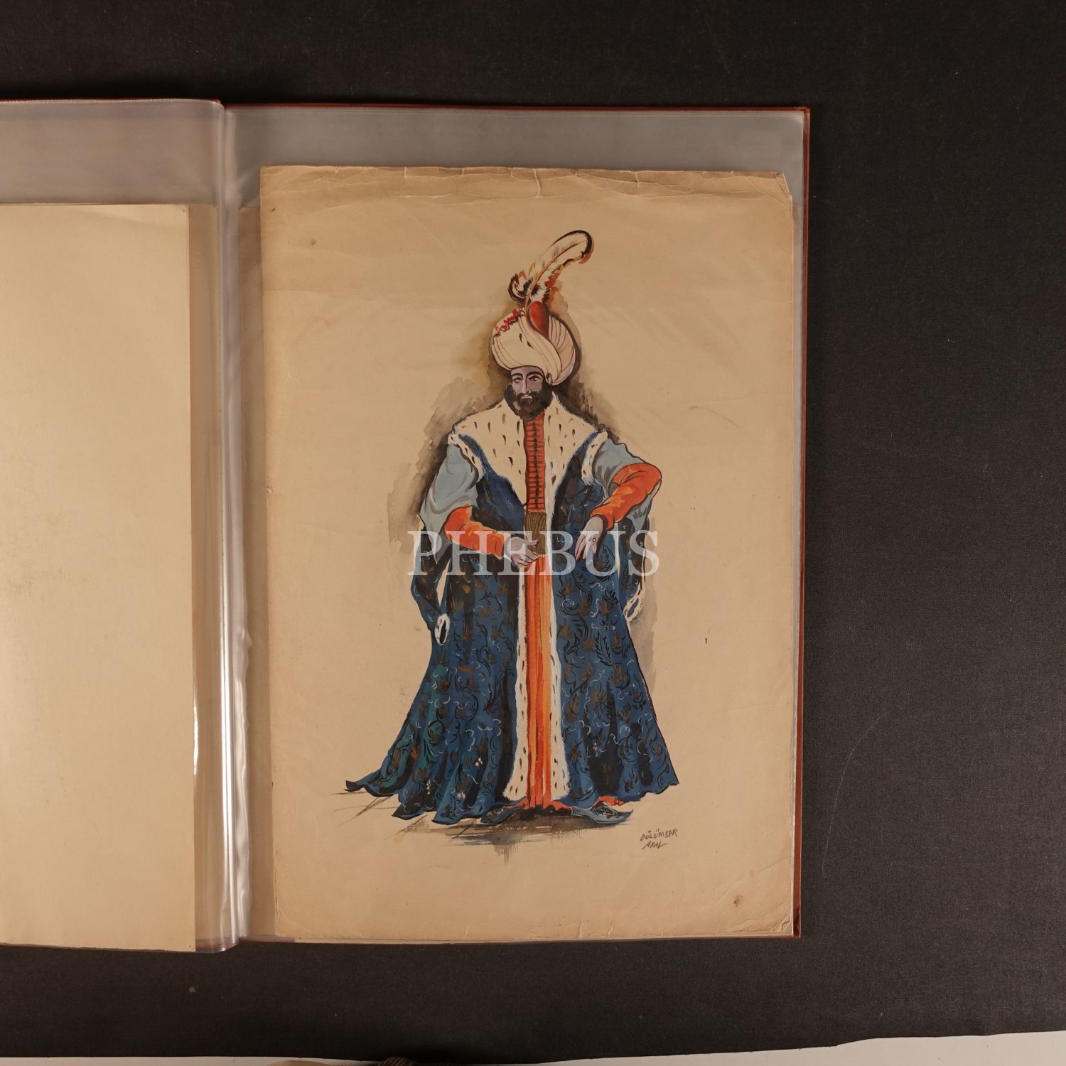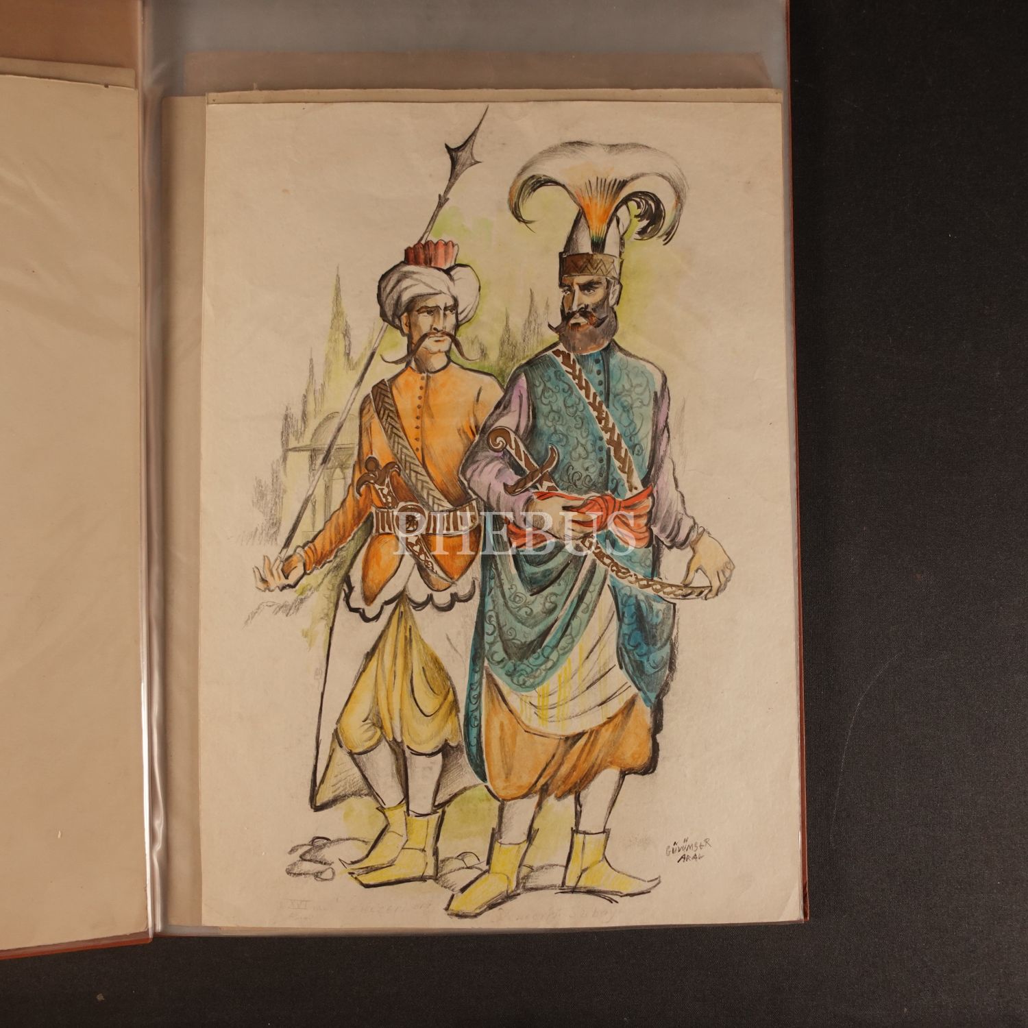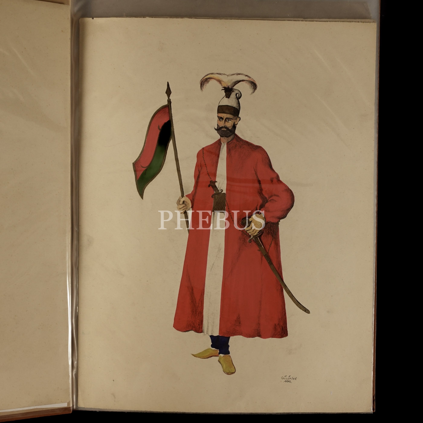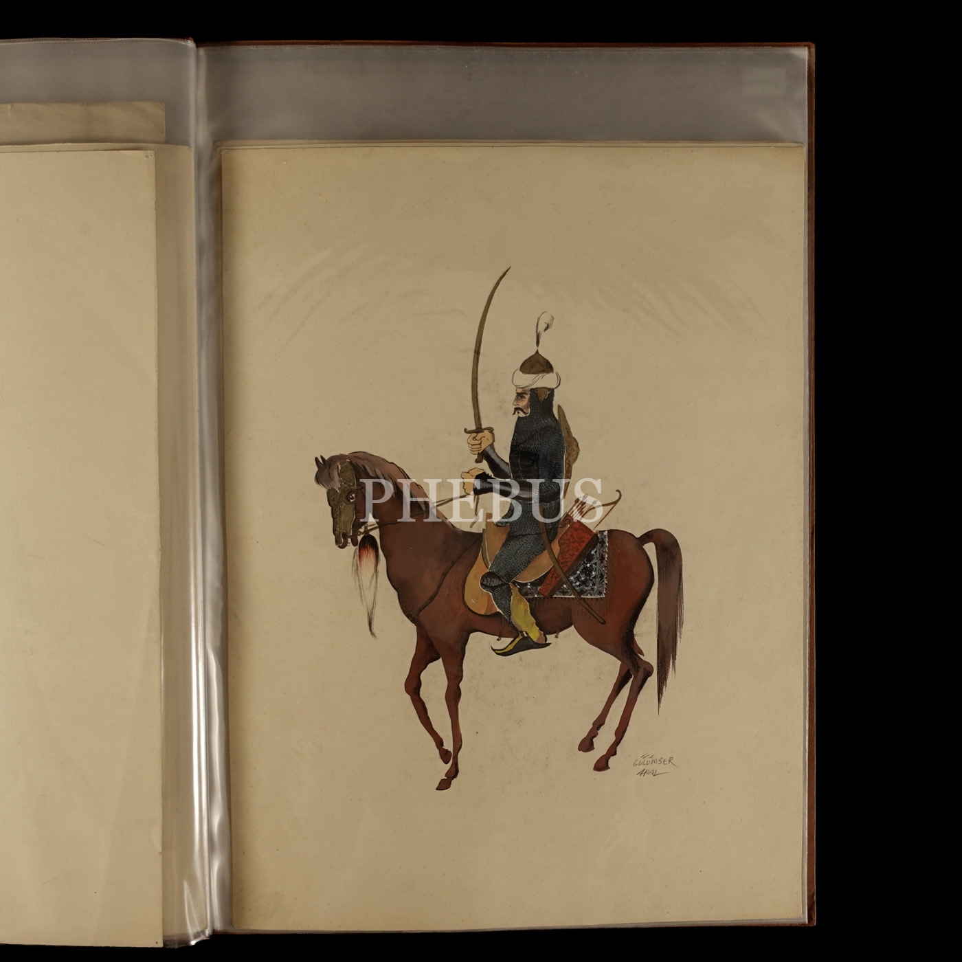 Gülümser Aral´ın, İstanbul´un Fethinin 500. Yıldönümünü Kutlamaları kapsamında Askeri Müze için hazırladığı, Osmanlı dönemi askeri ve sivil devlet erkanı kıyafet çizimleri (tamamı ıslak imzalı 13 adet çizim) ile eskiz çalışmaları (35 adet), 1952, ortalama 34x45 cm...