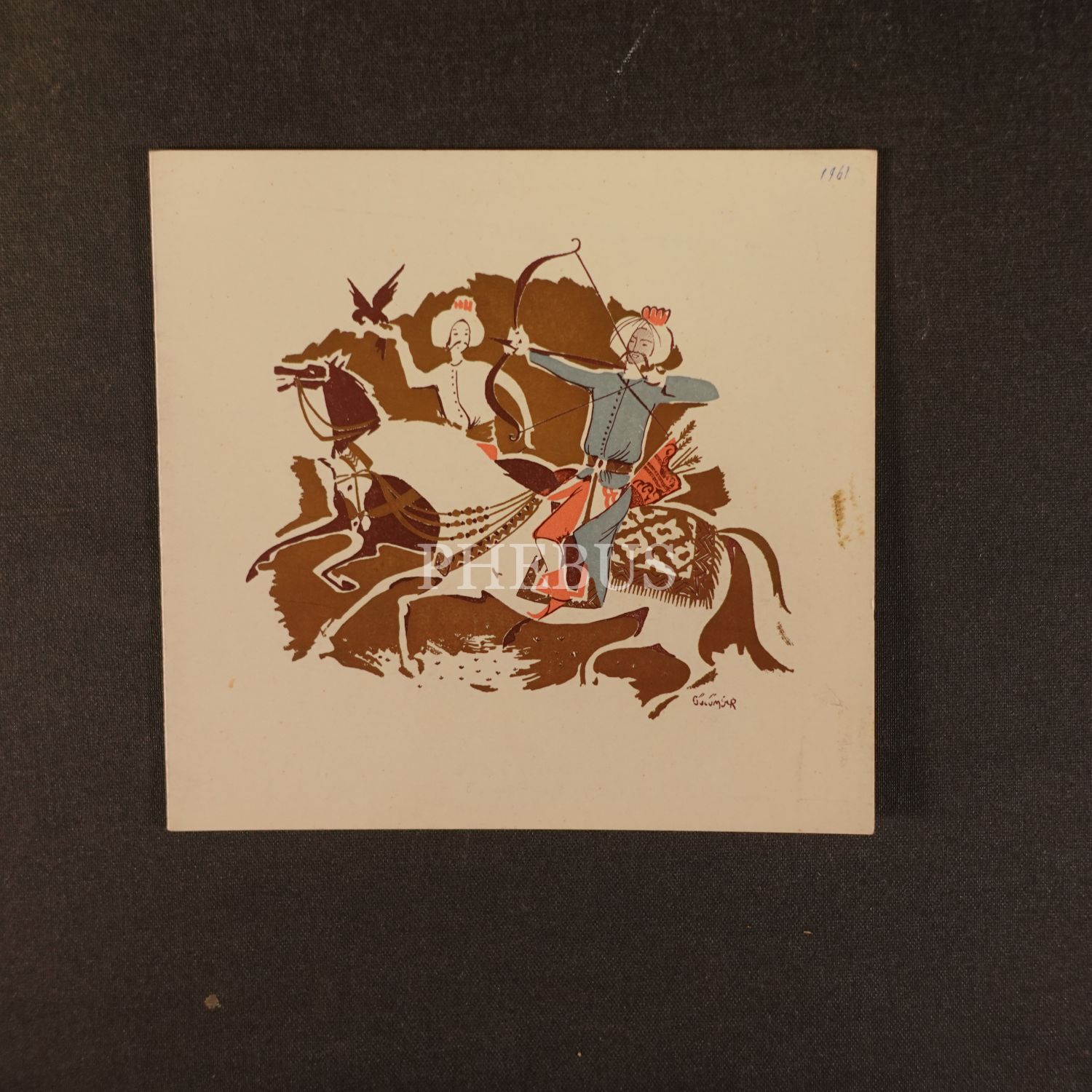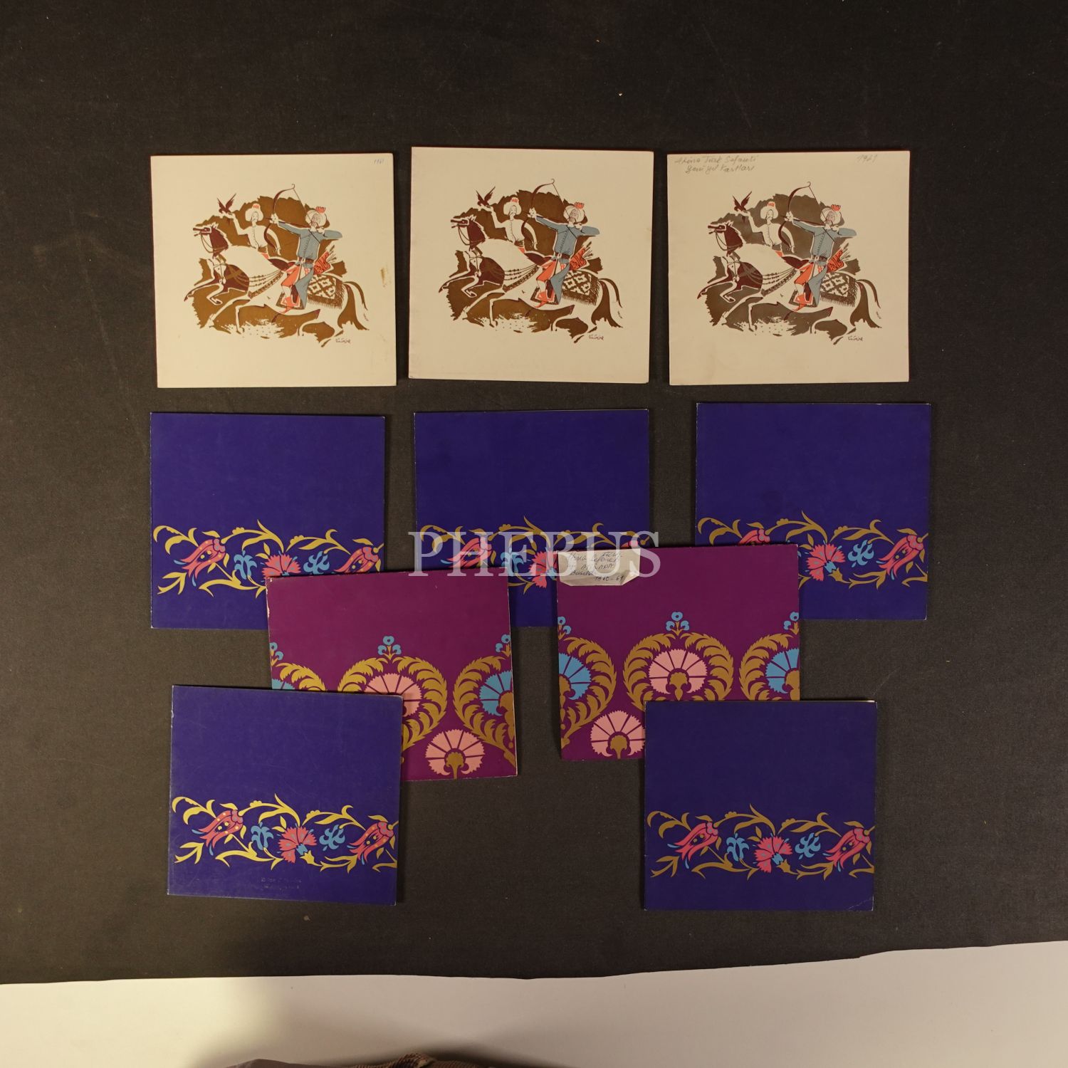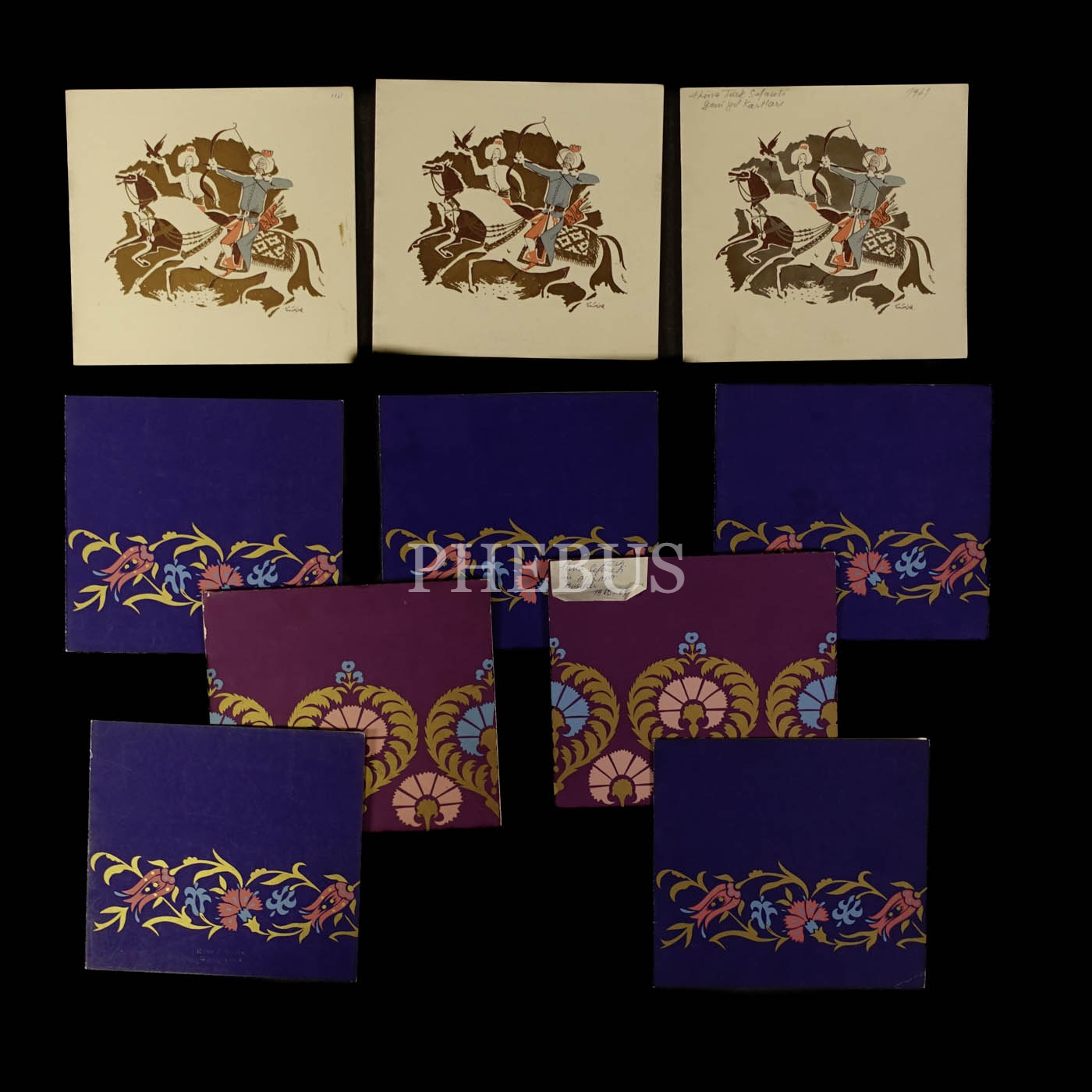 Gülümser Aral´ın, 1960-61 yıllarında Atina Türk Sefareti için tasarladığı, Türk motif ve figürleri görselli, serigrafi baskı yeni yıl tebrik kartları (10 adet), bir kısmı doldurulmuş, ortalama 16,5x17 cm...