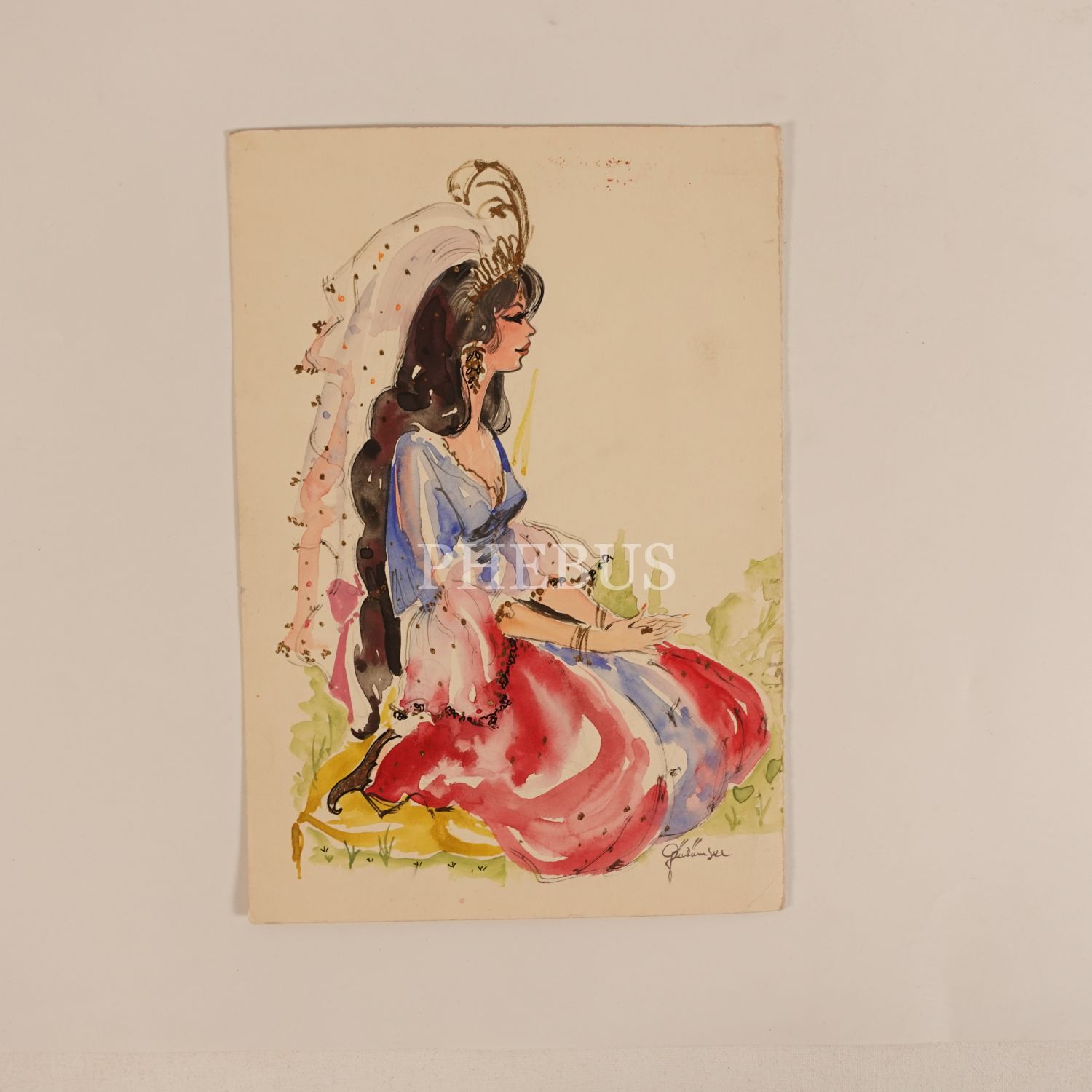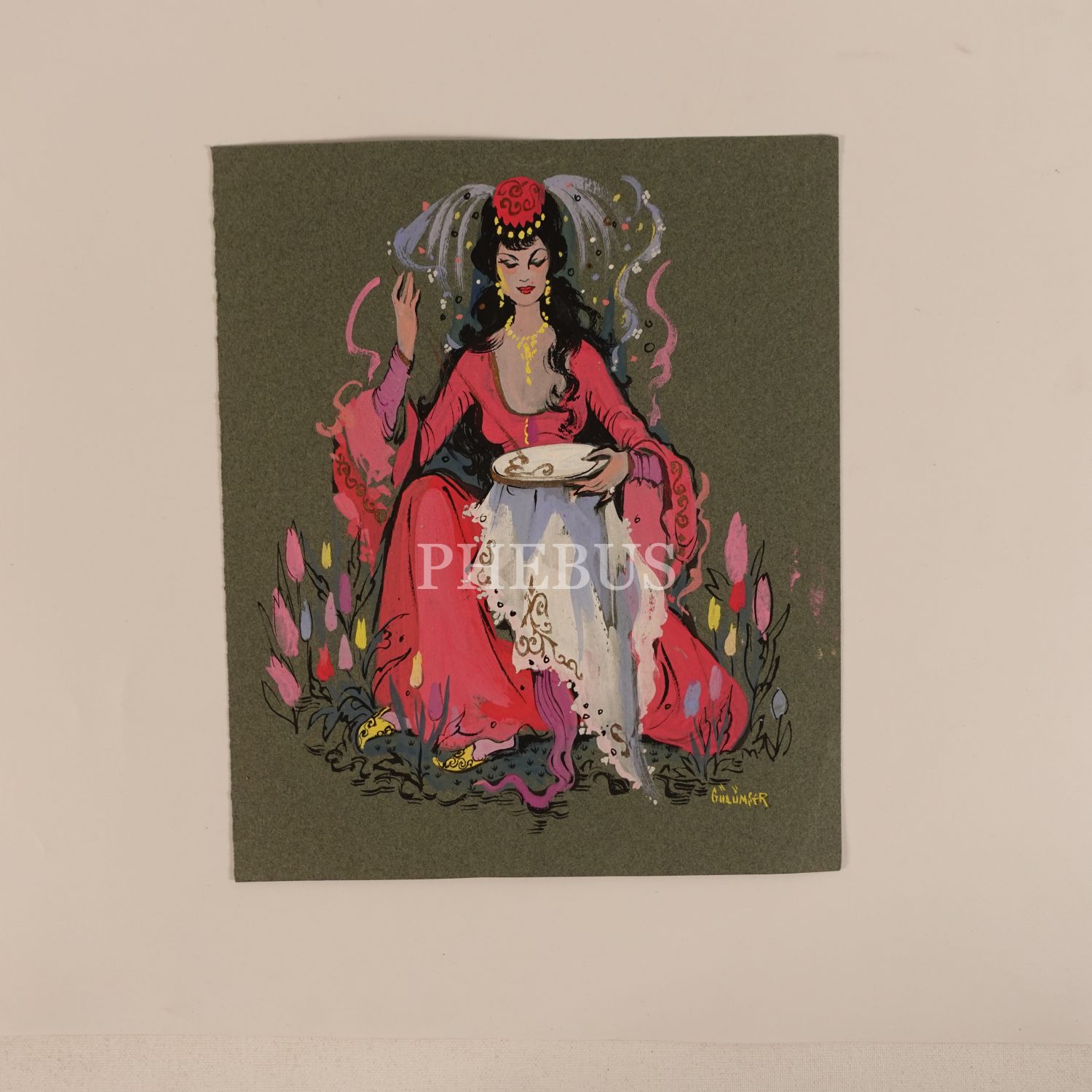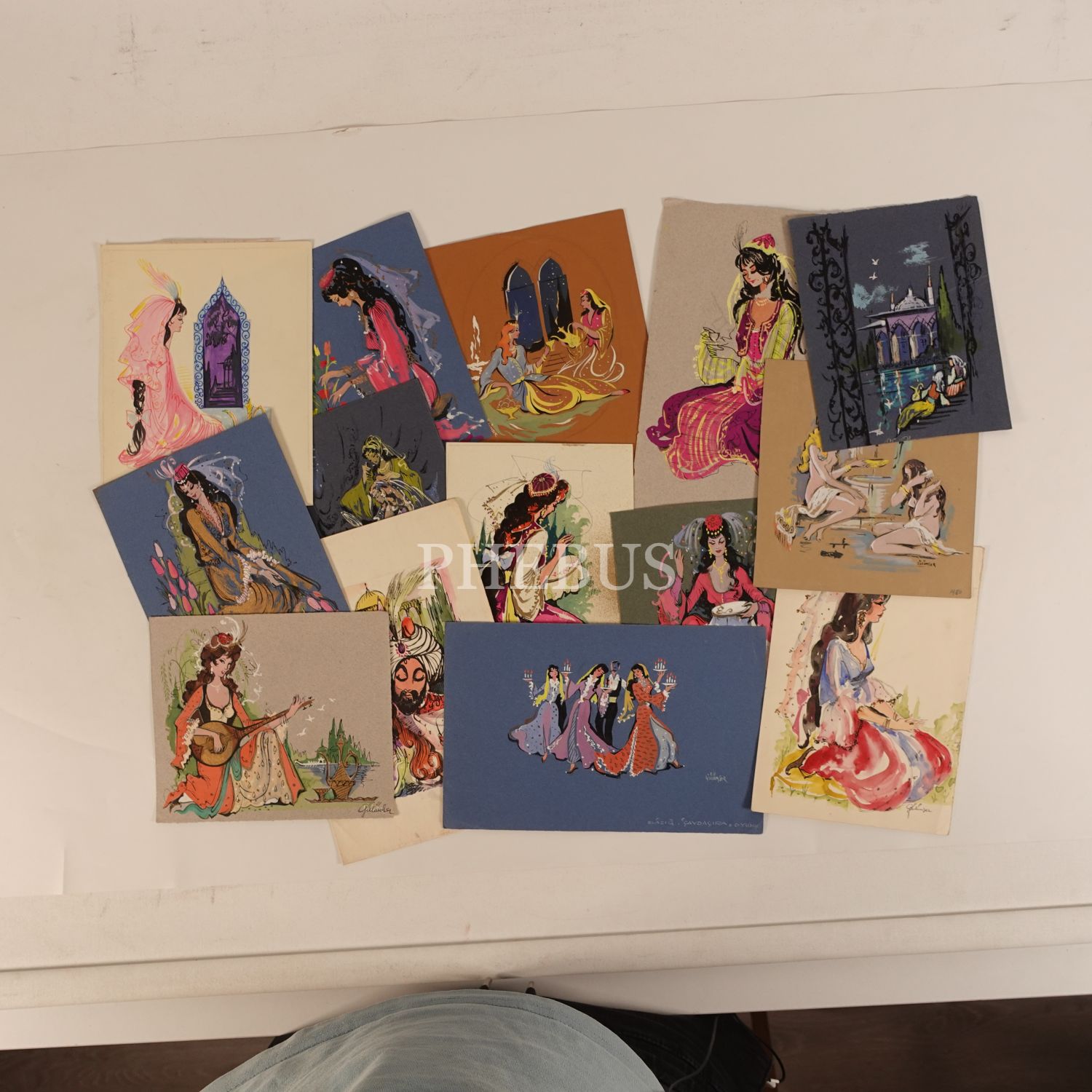 Gülümser Aral´ın ıslak imzasıyla, Osmanlı figür ve sarayları temalı orijinal bayram tebrik kartı çizimleri (16 adet), muhtelif ebatlarda...