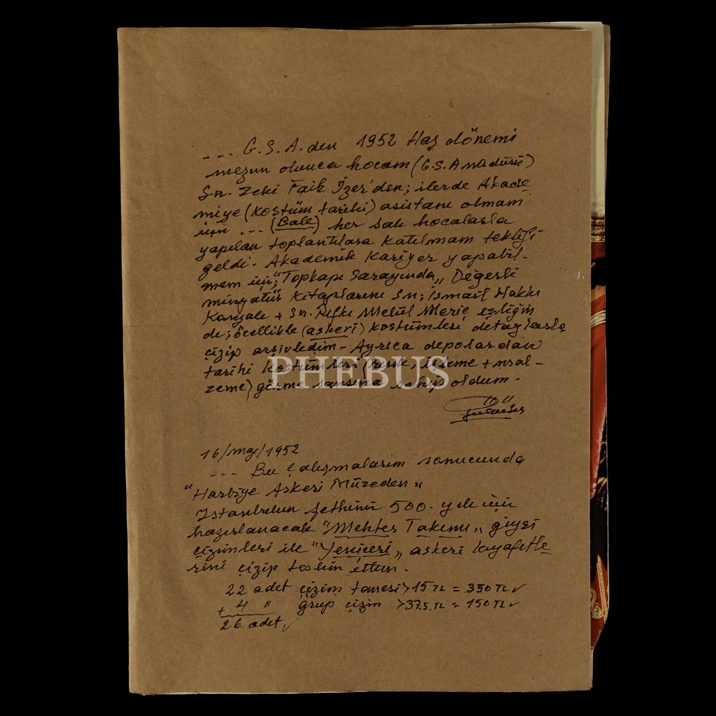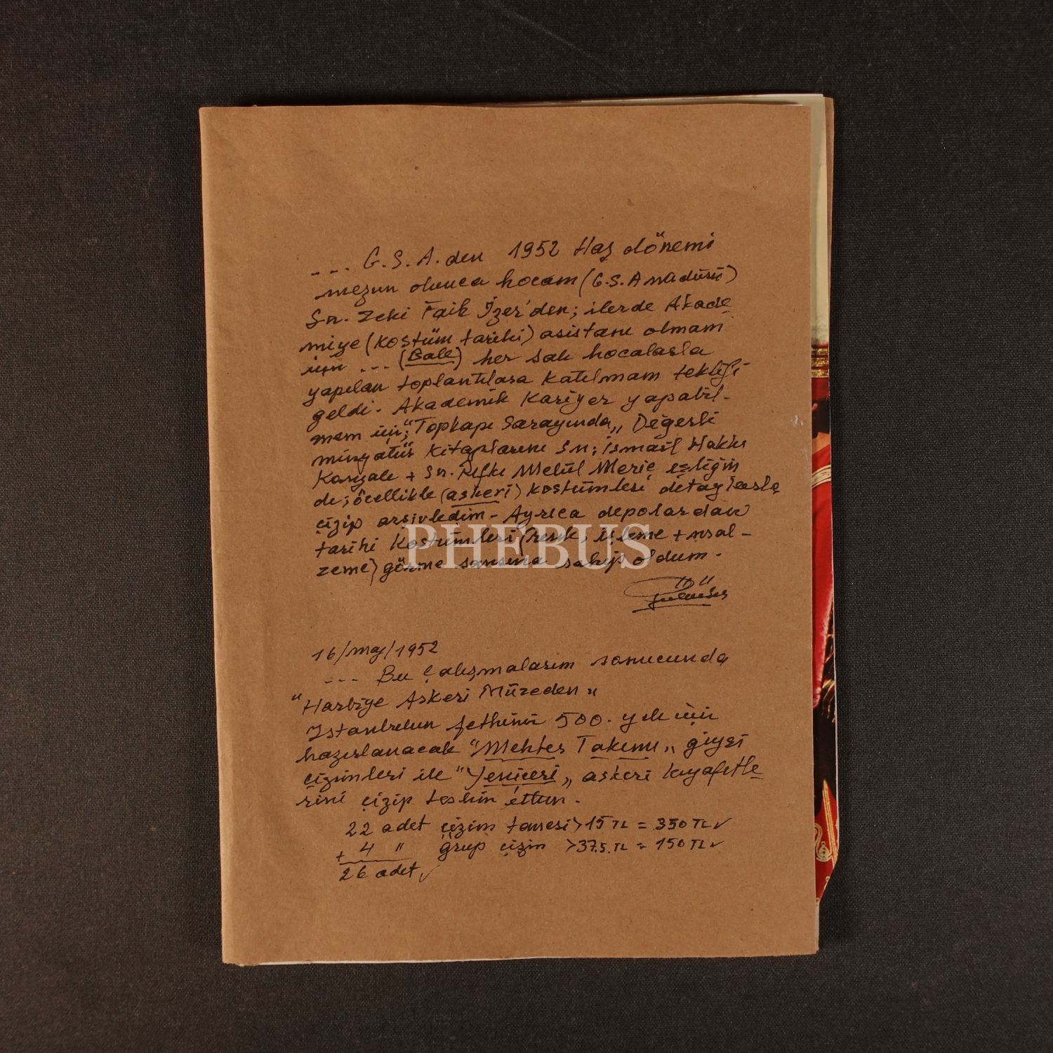 Gülümser Aral´ın, "Osmanlı ordusunun güç kaynağı MEHTER" başlıklı bir dergi makalesine kapladığı kâğıt üzerine kaleme aldığı, akademiden mezun olduktan sonra Zeki Faik İzer´in yönlendirmesi ve İsmail Hakkı Uzunçarşılı ile Rıfkı Melûl Meriç´in yardımlarıyla Osmanlı askeri kostümleri çalışmalarına başlamasını anlattığı el yazısı not, 19x27 cm...