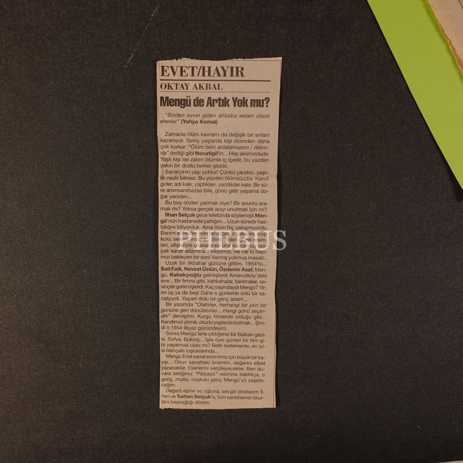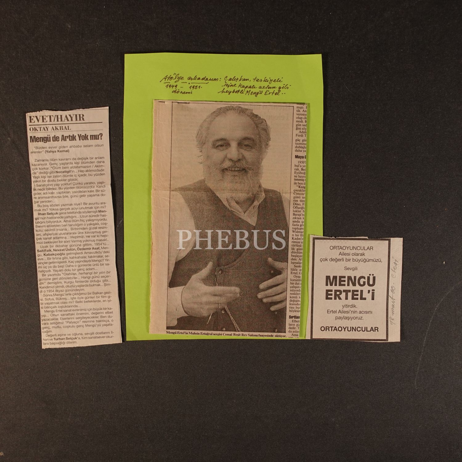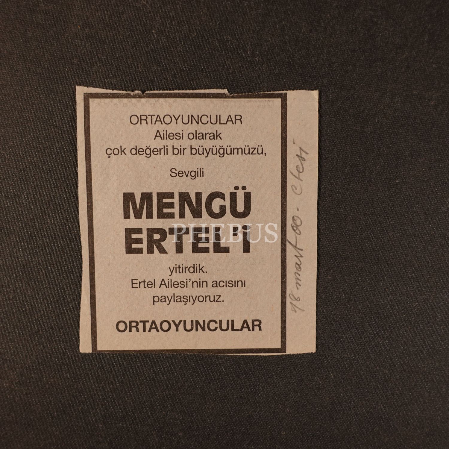 Gülümser Aral´ın, Mengü Ertel´in sağlığında (1 adet) ve vefatı sonrasında (2 adet) çıkan haber kupürlerini derlediği ve "1949-1951 dönemi Atölye arkadaşım: Çalışkan, terbiyeli, içine kapalı, aslan gibi heybetli Mengü Ertel.." notuyla dosyaladığı lot...