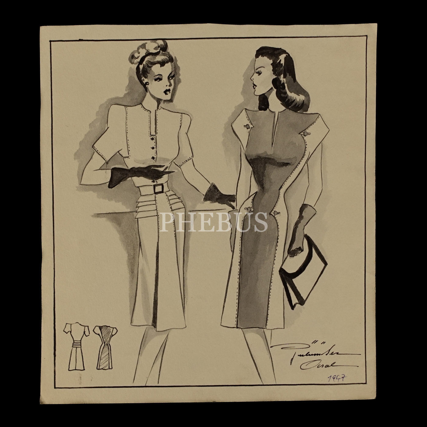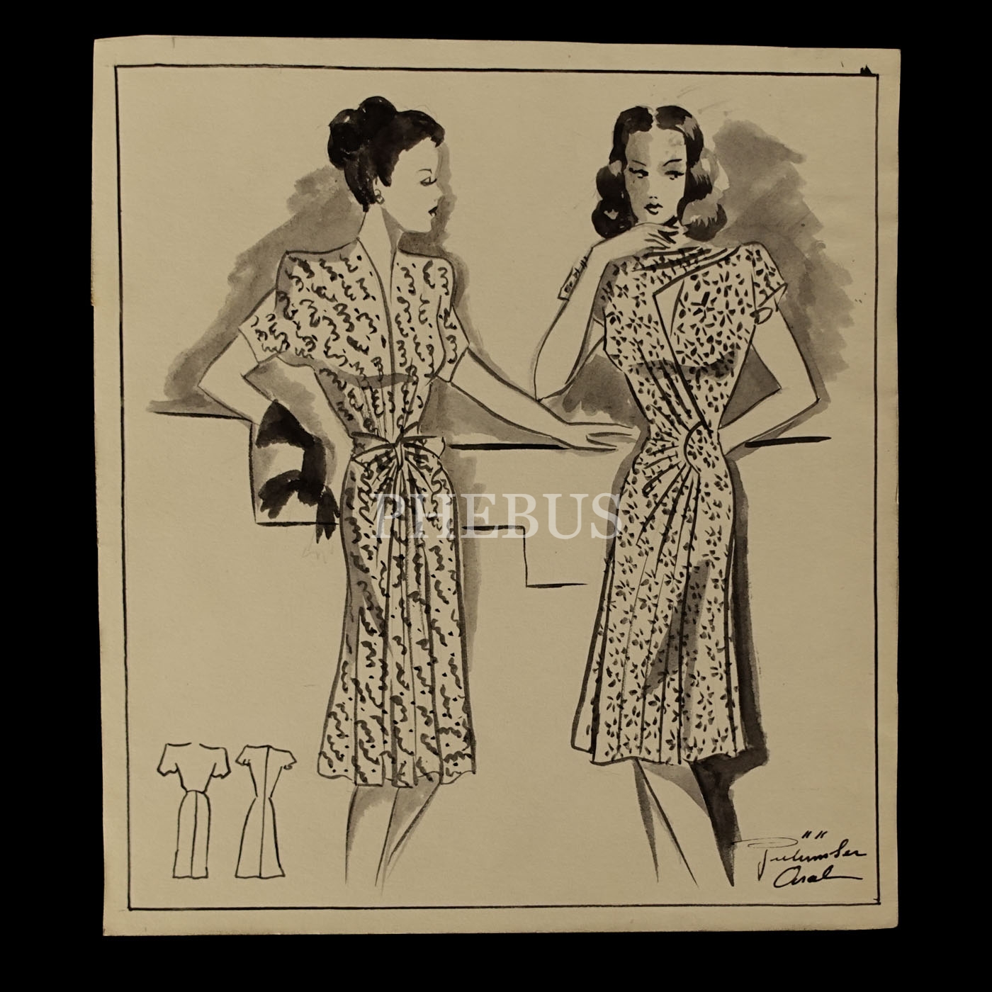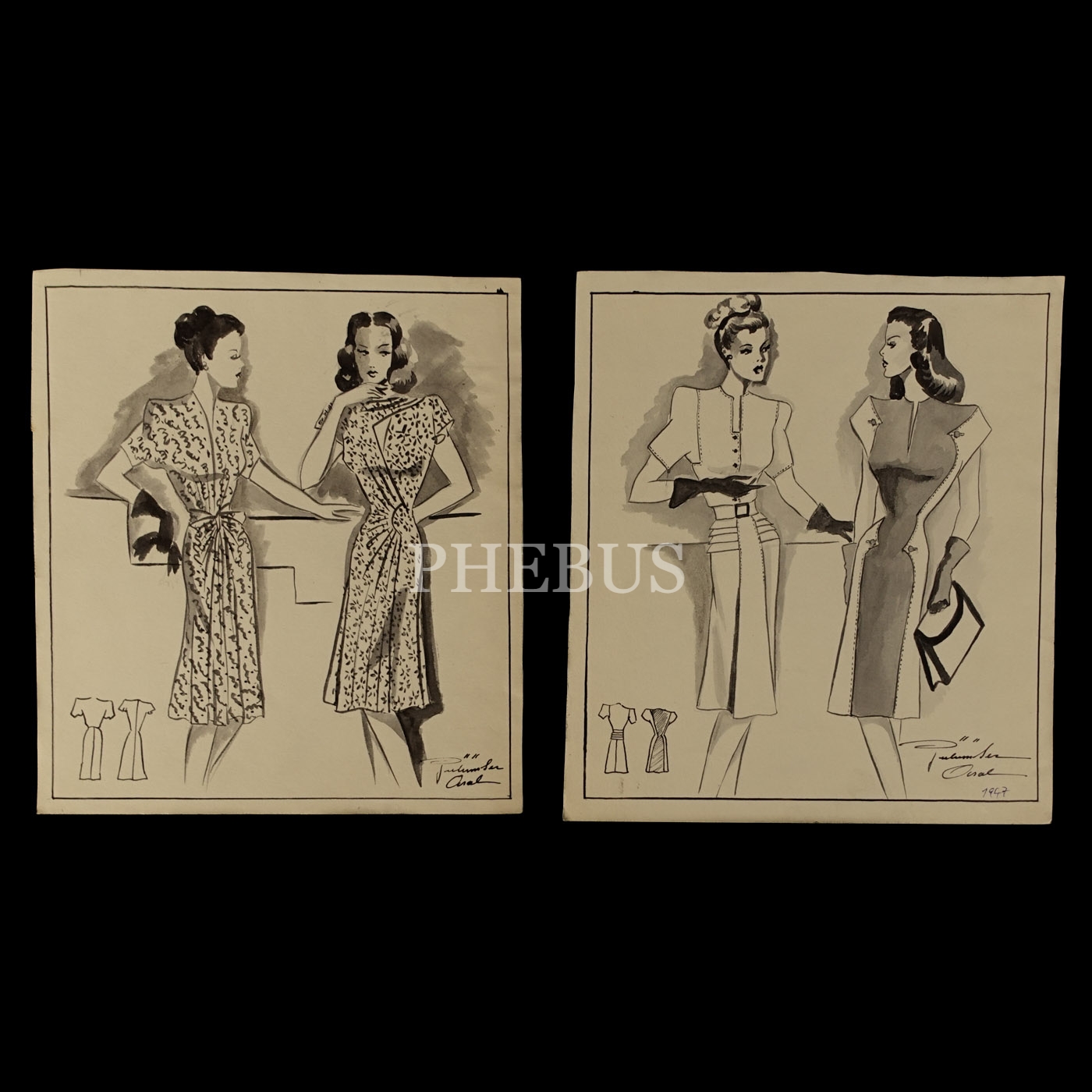 Gülümser Aral´ın EV-İŞ dergisi için çizdiği, ıslak imzalı iki adet kıyafet tasarımı, 18x20 cm...