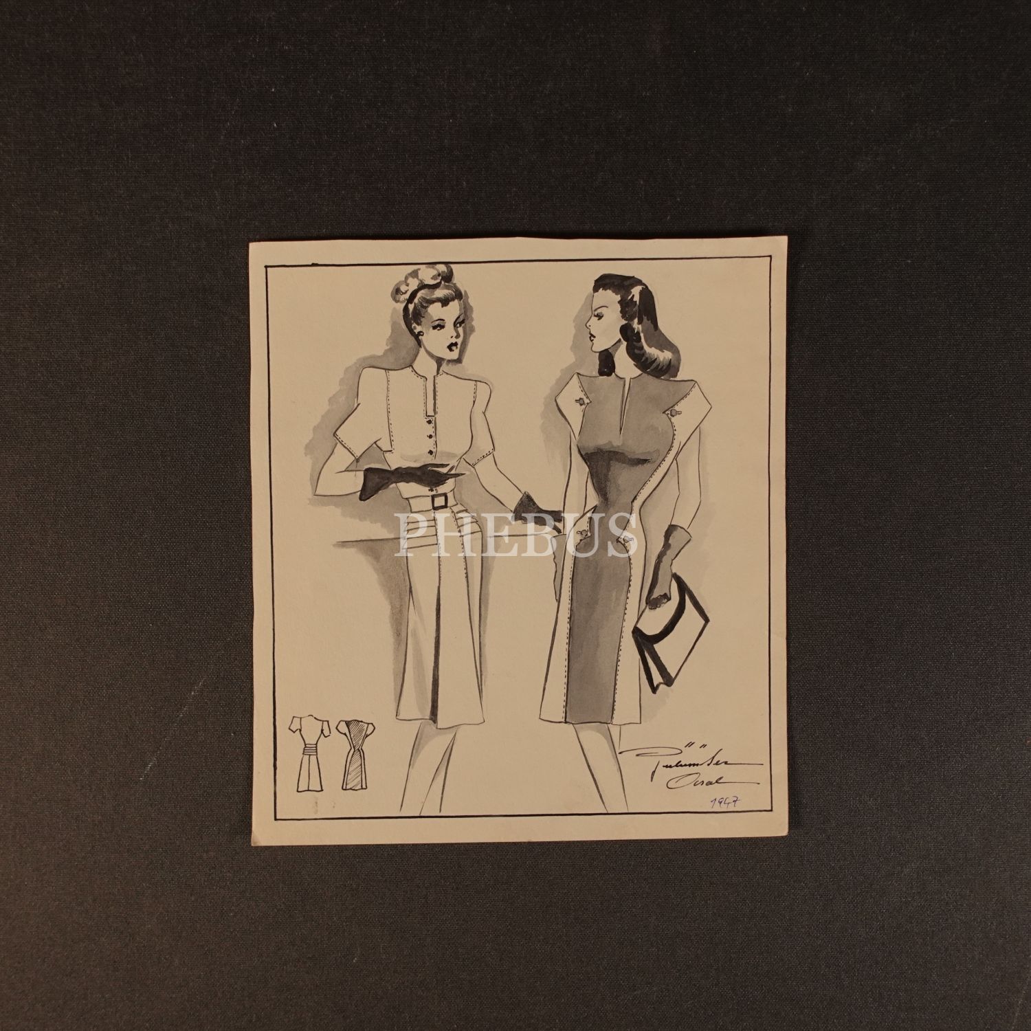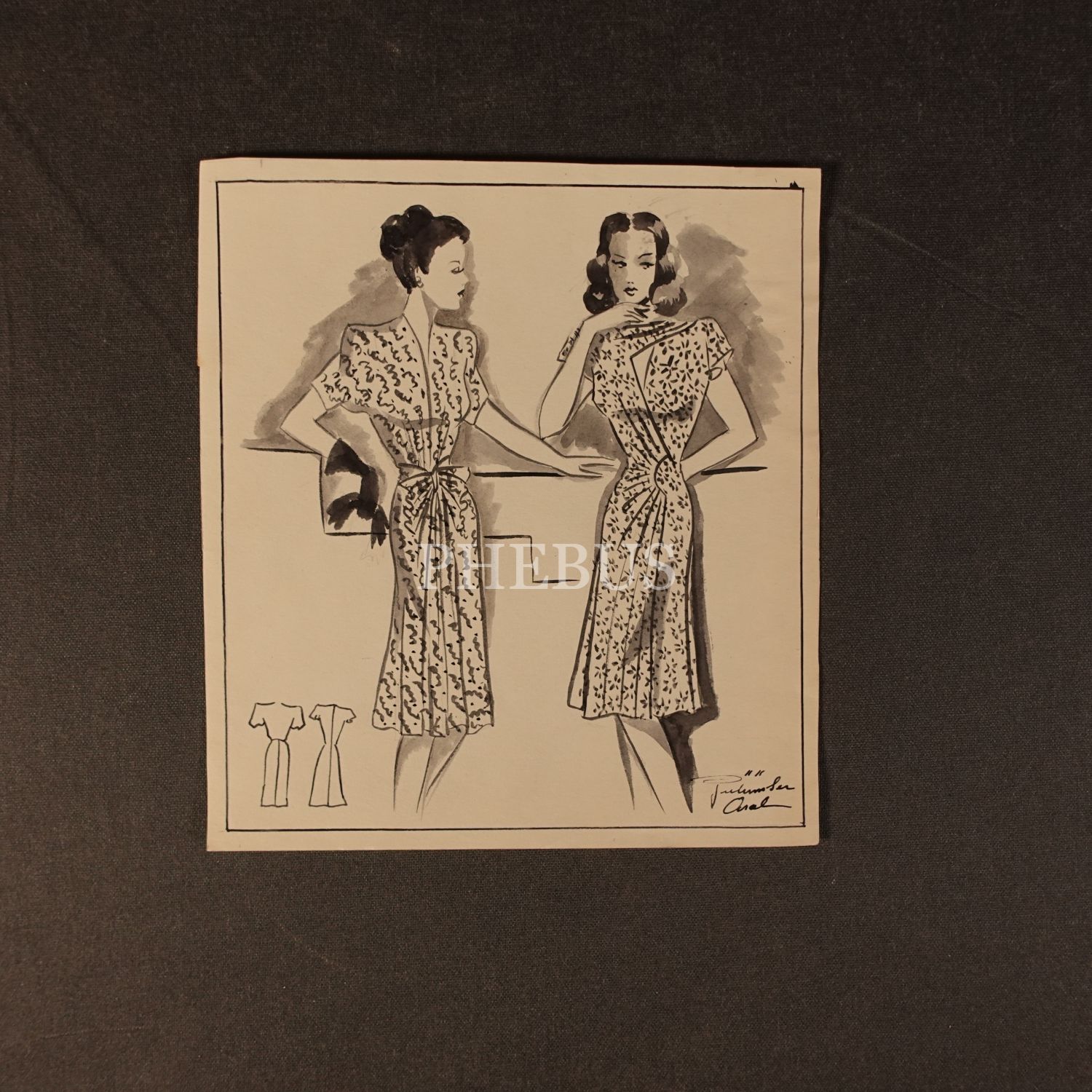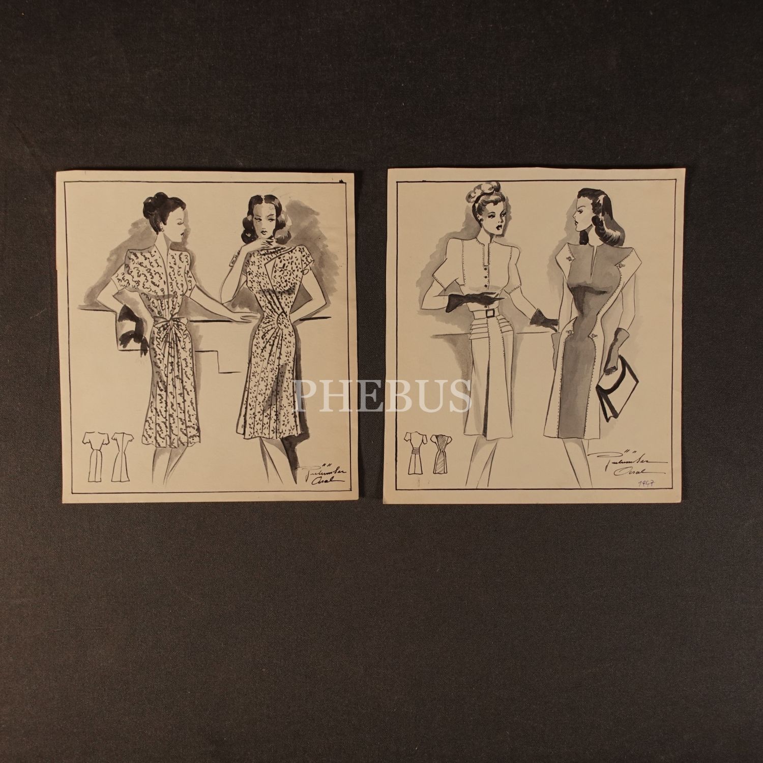 Gülümser Aral´ın EV-İŞ dergisi için çizdiği, ıslak imzalı iki adet kıyafet tasarımı, 18x20 cm...