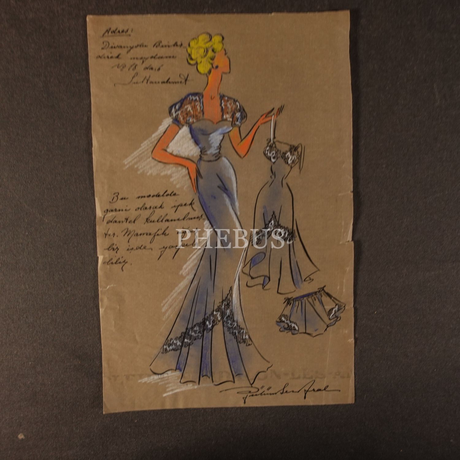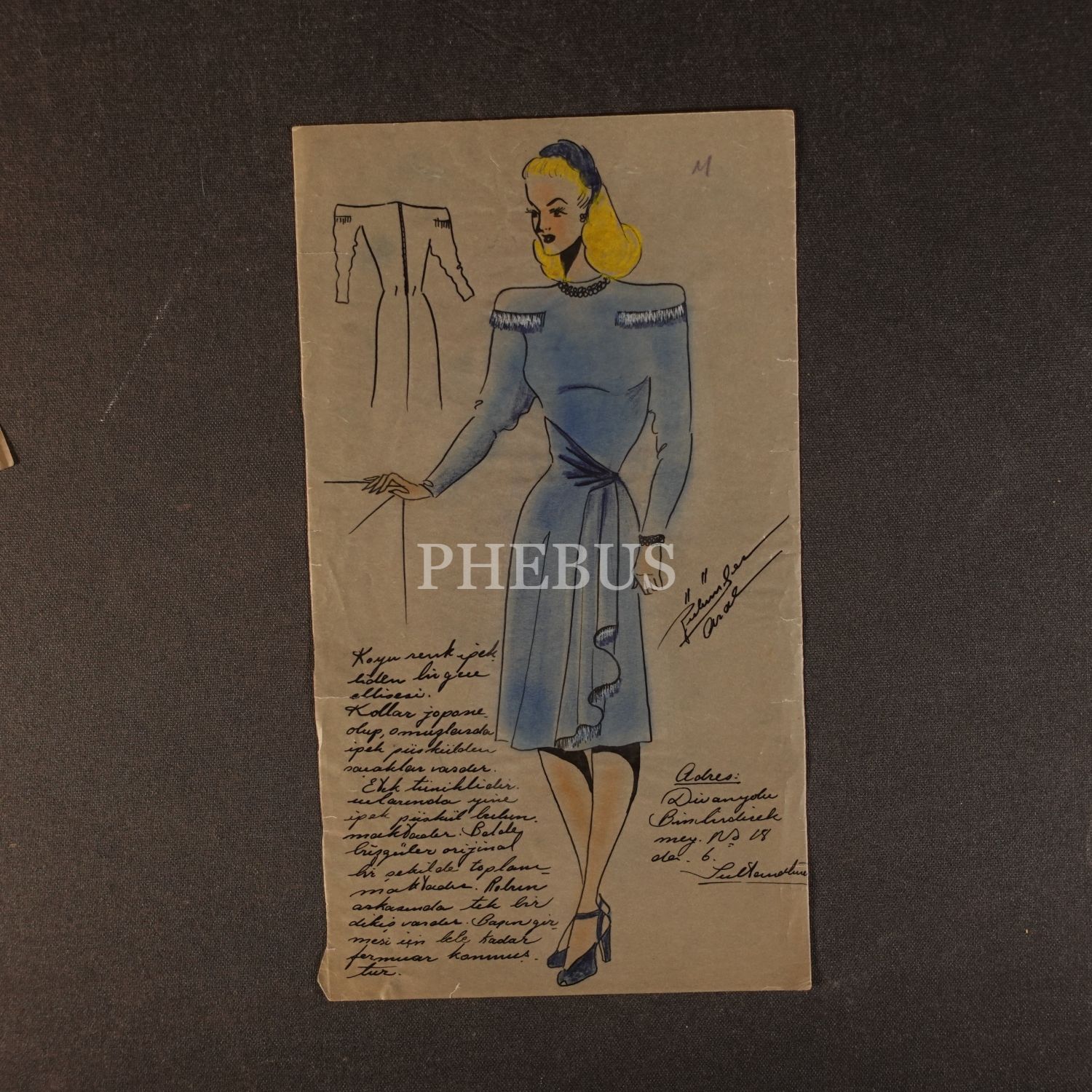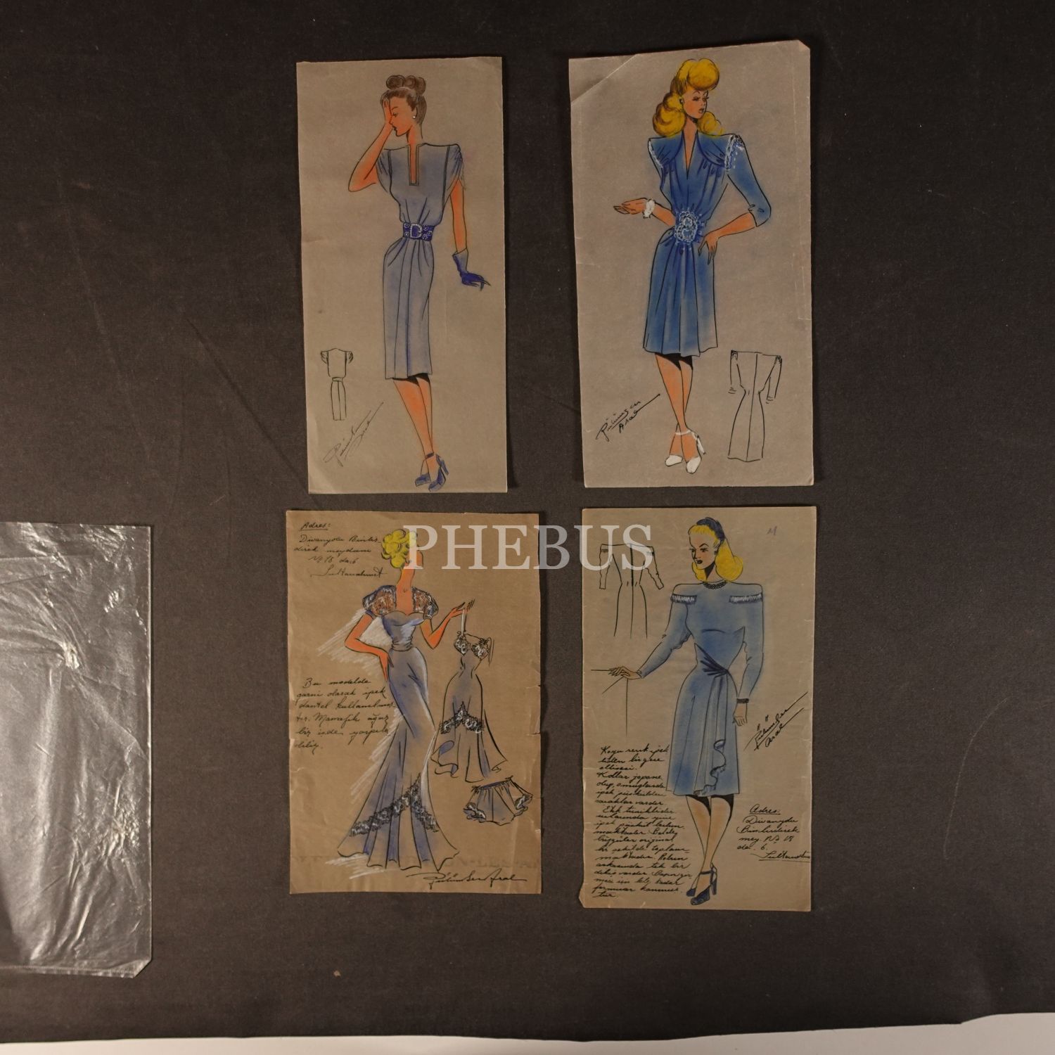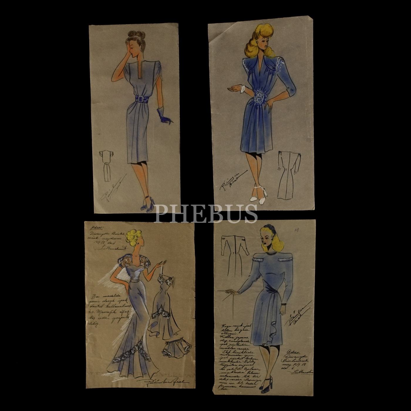 Gülümser Aral´ın EV-İŞ dergisi için çizdiği, ıslak imzalı dört adet kıyafet tasarımı, ortalama 14x28 cm...