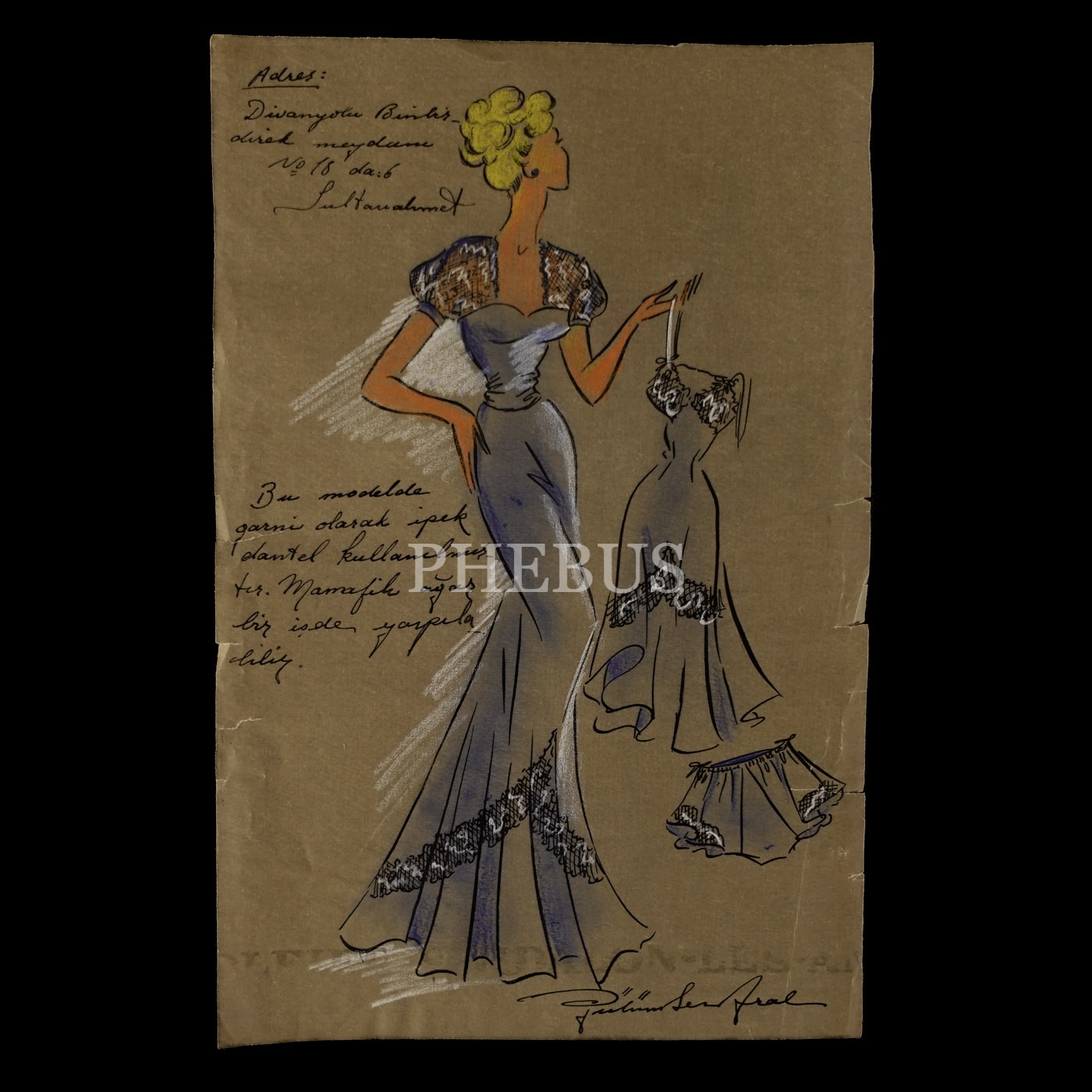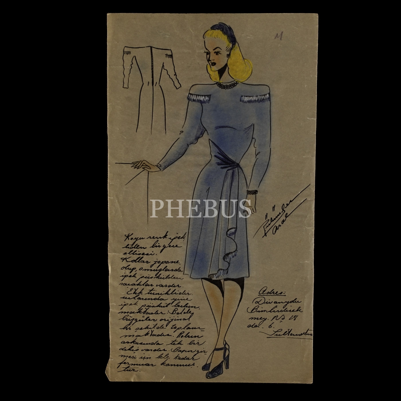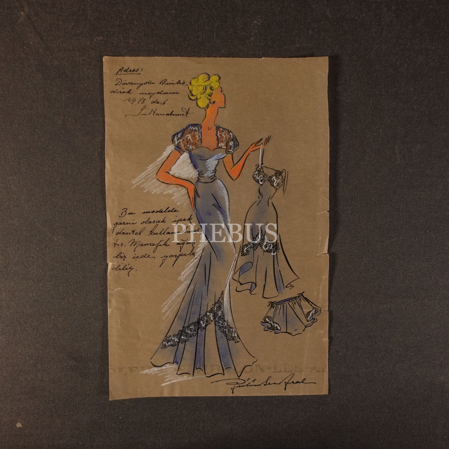 Gülümser Aral´ın EV-İŞ dergisi için çizdiği, ıslak imzalı dört adet kıyafet tasarımı, ortalama 14x28 cm...