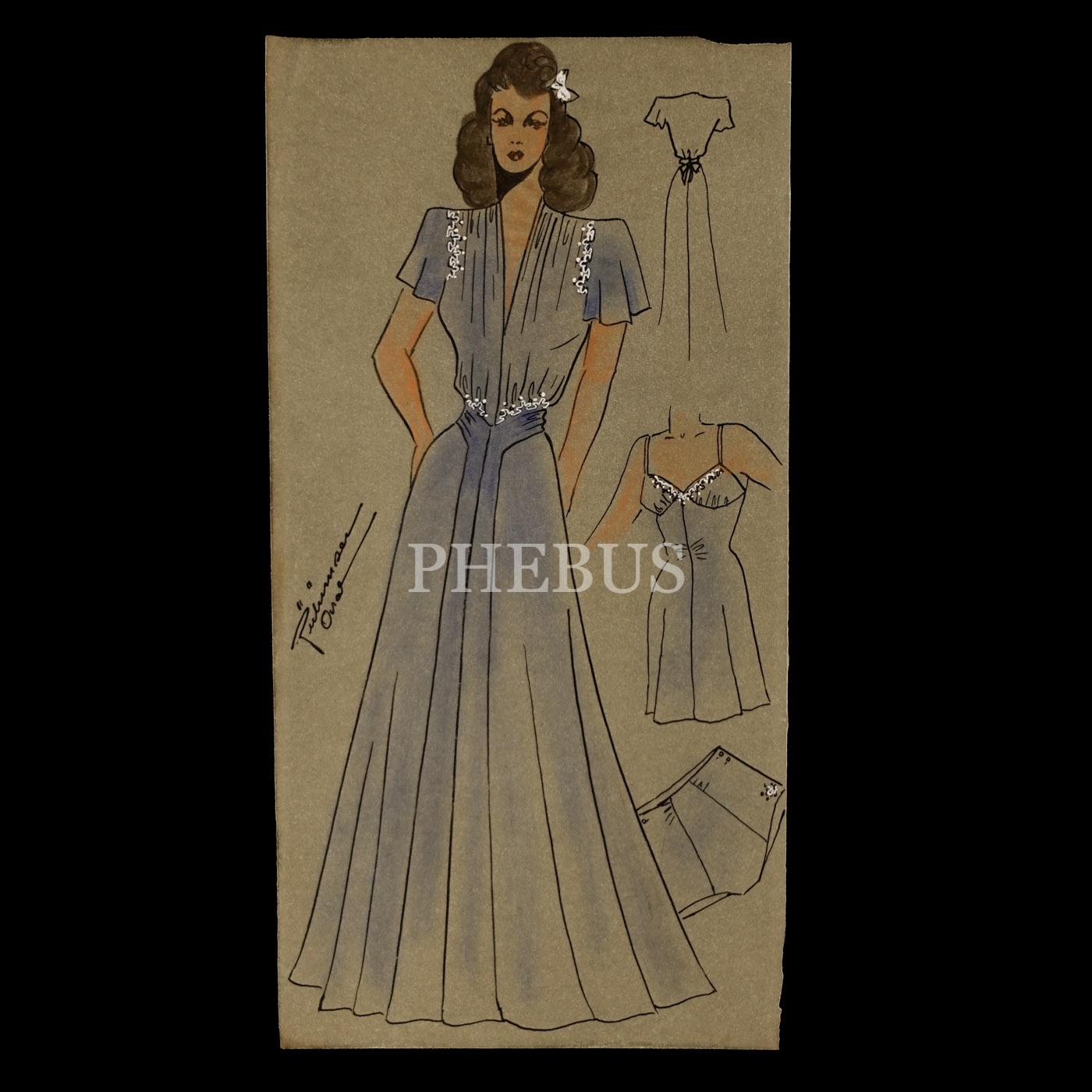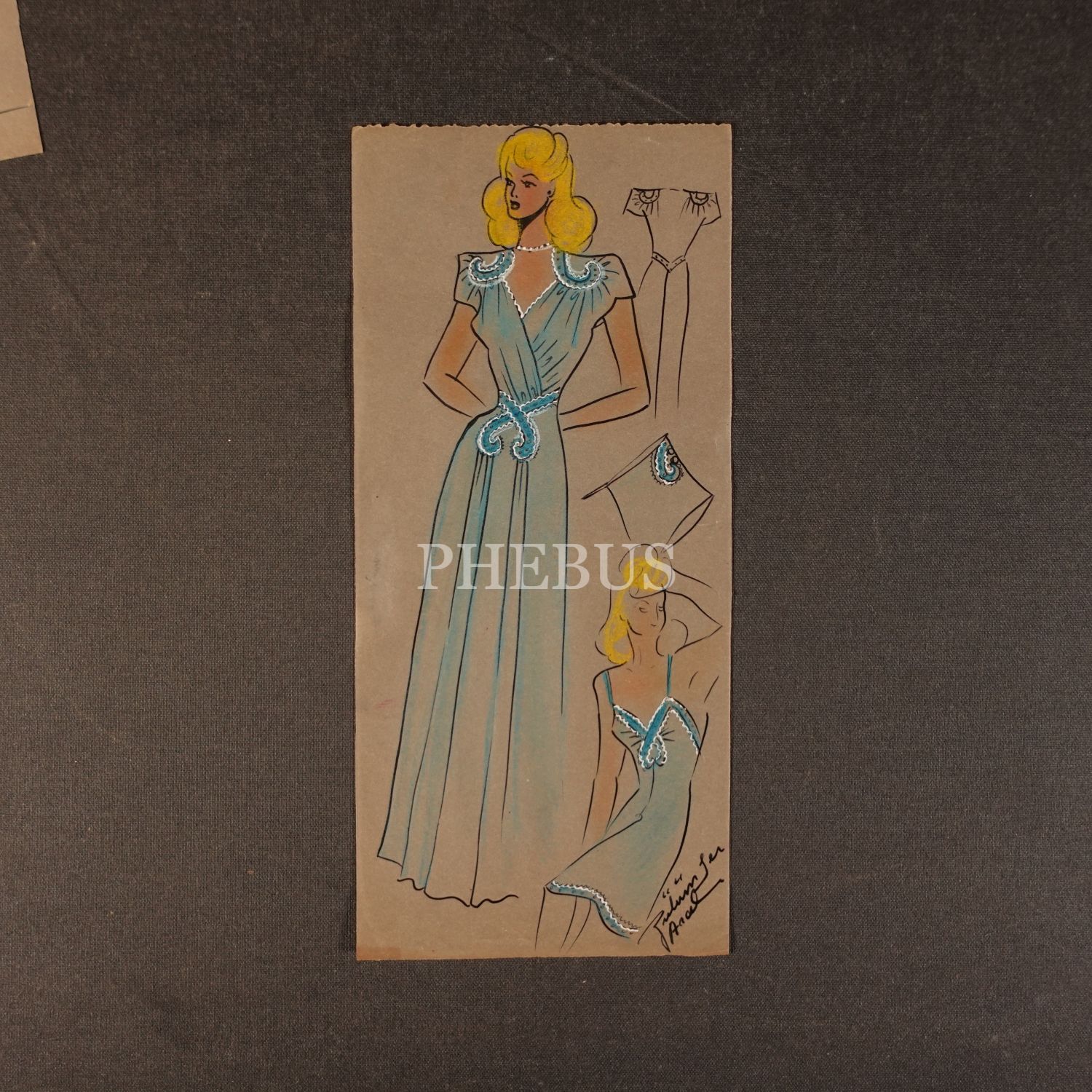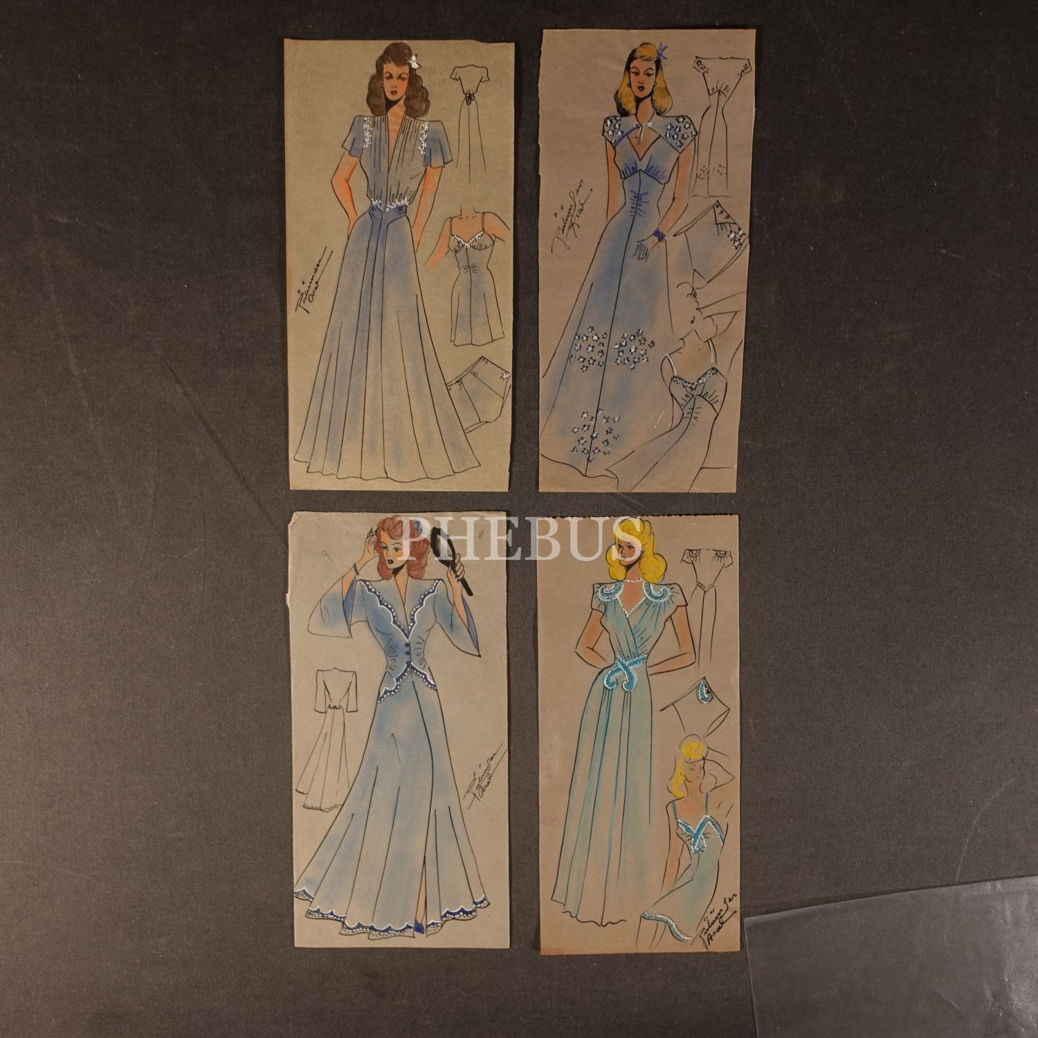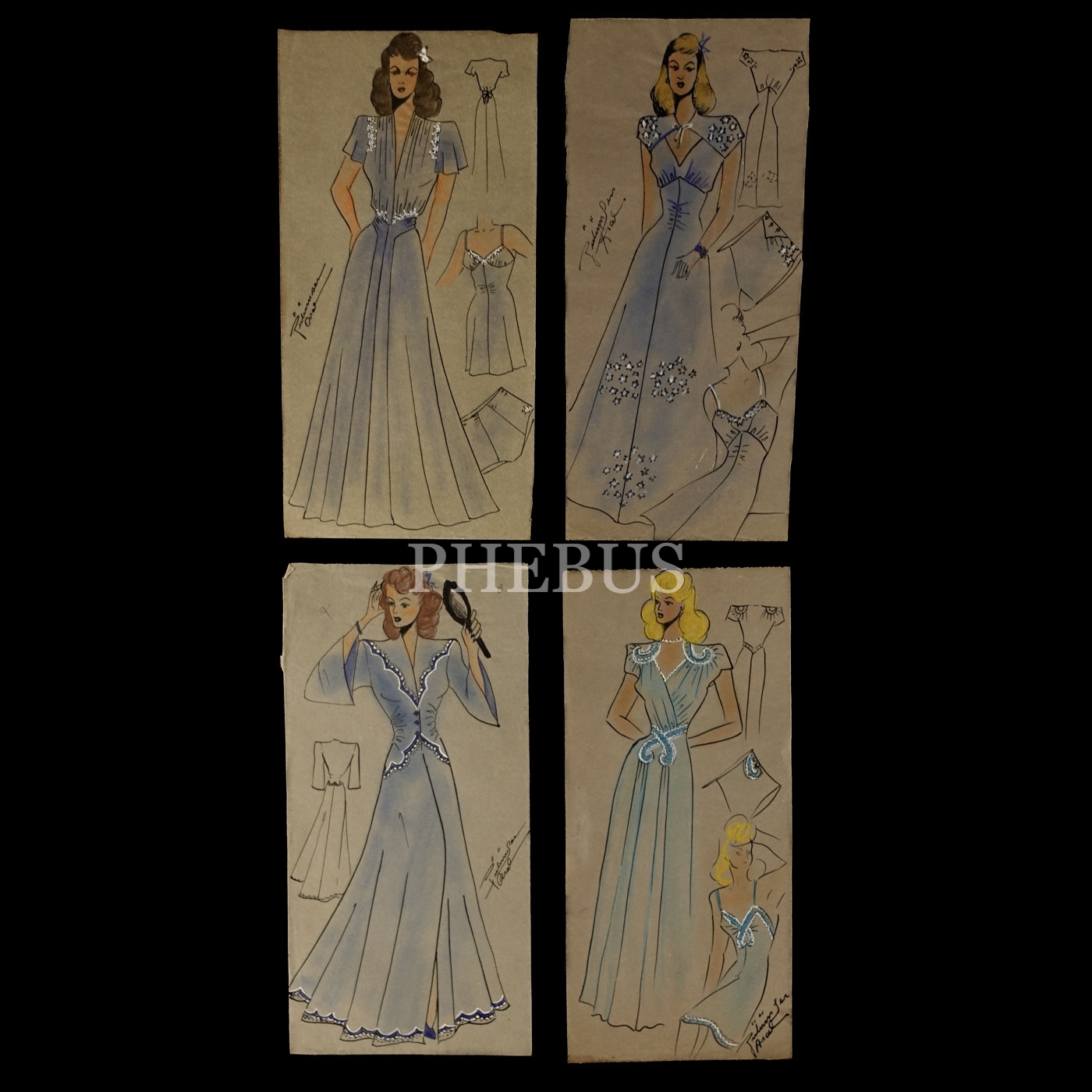 Gülümser Aral´ın EV-İŞ dergisi için çizdiği, ıslak imzalı dört adet kıyafet tasarımı, ortalama 14x28 cm...
