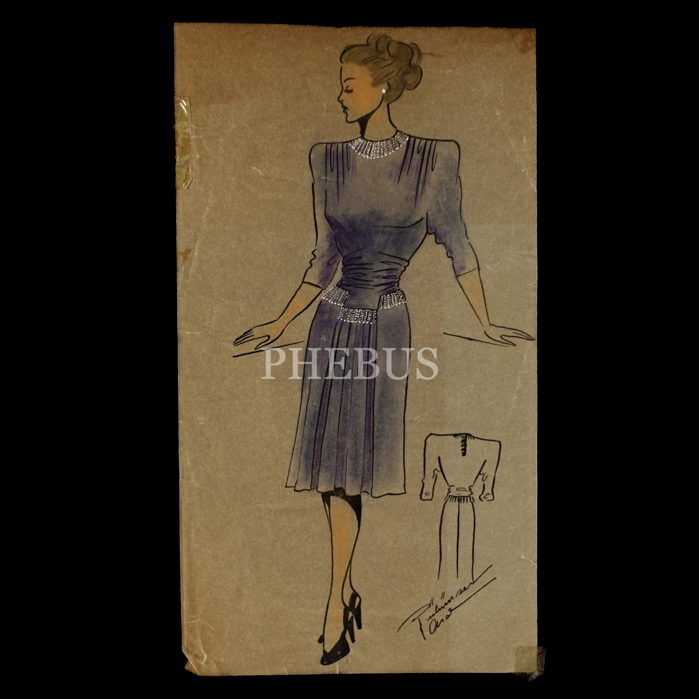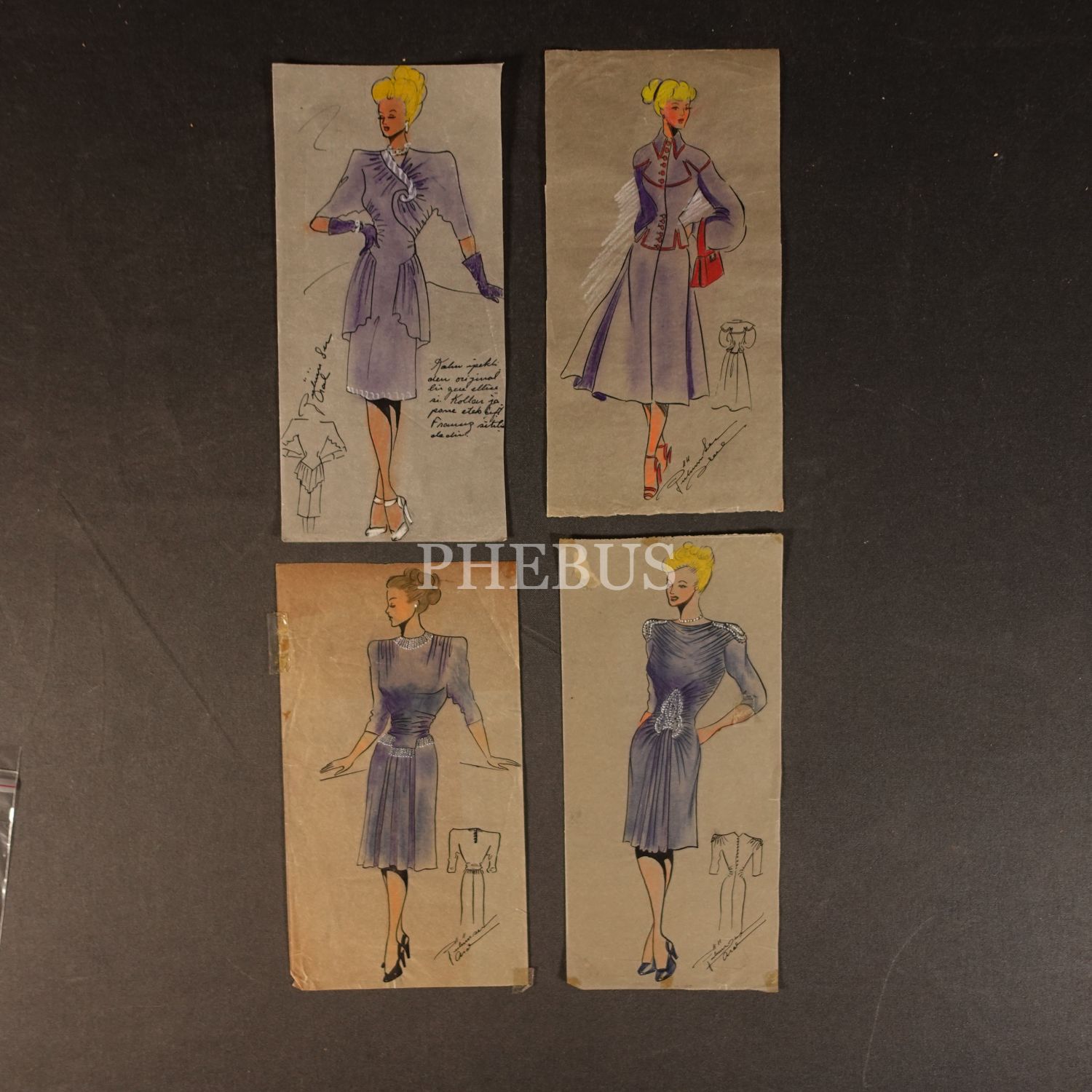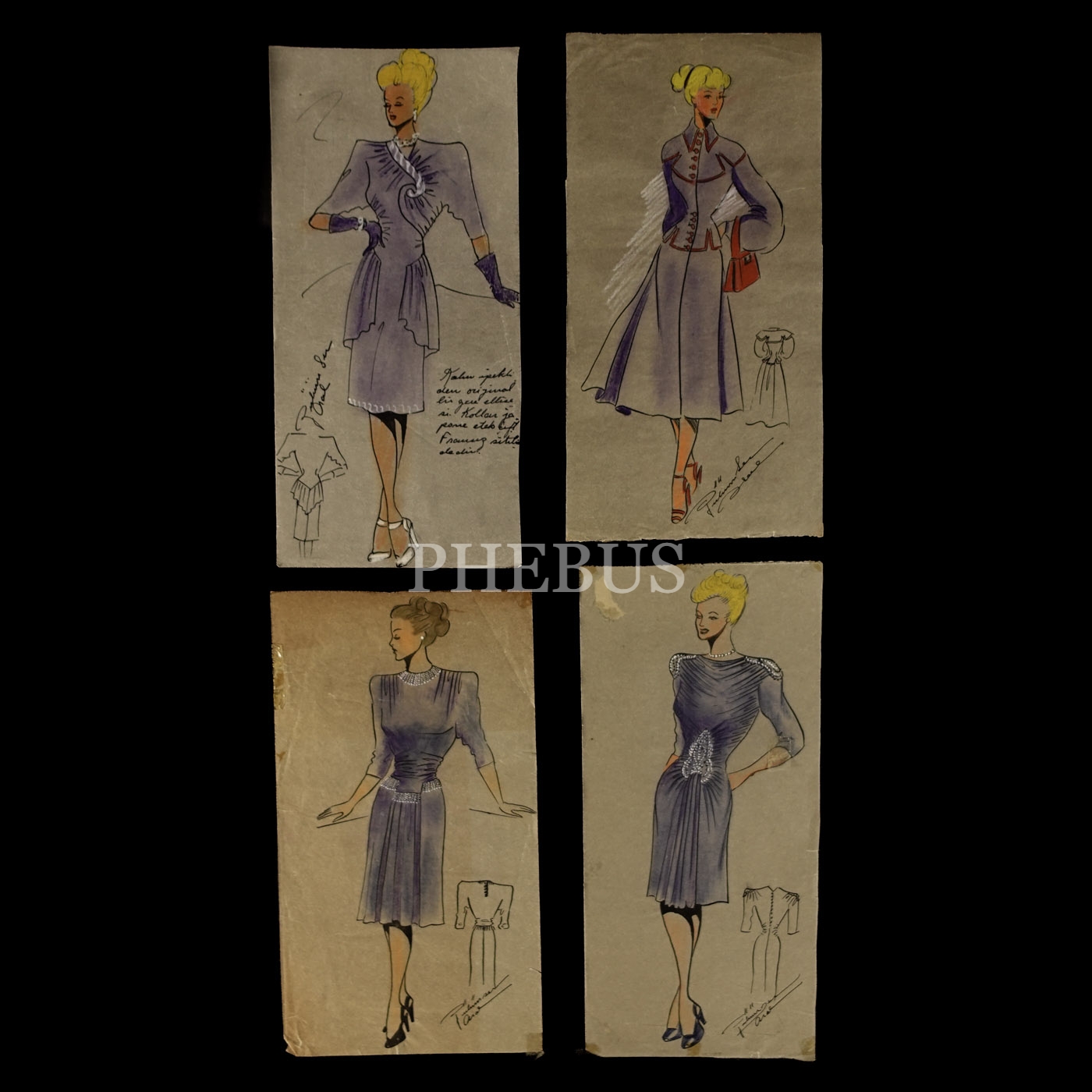 Gülümser Aral´ın EV-İŞ dergisi için çizdiği, ıslak imzalı dört adet kıyafet tasarımı, ortalama 14x28 cm...