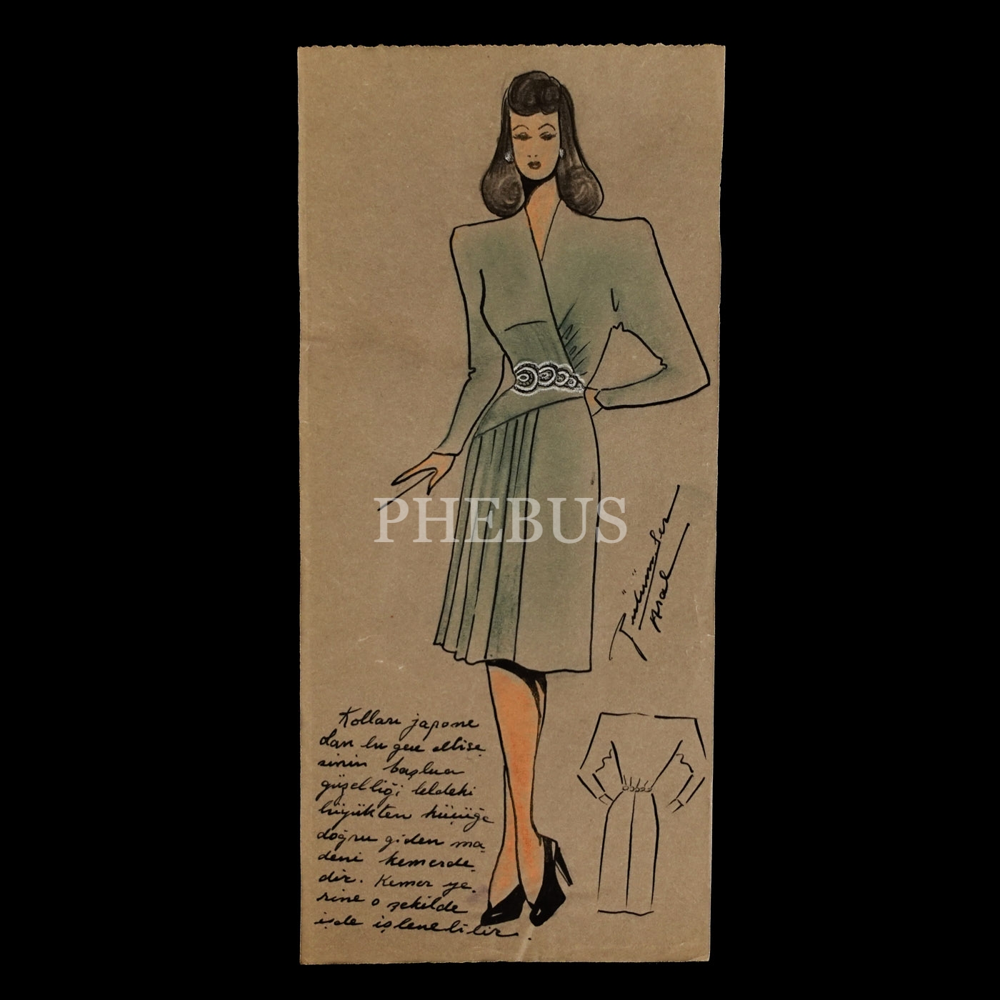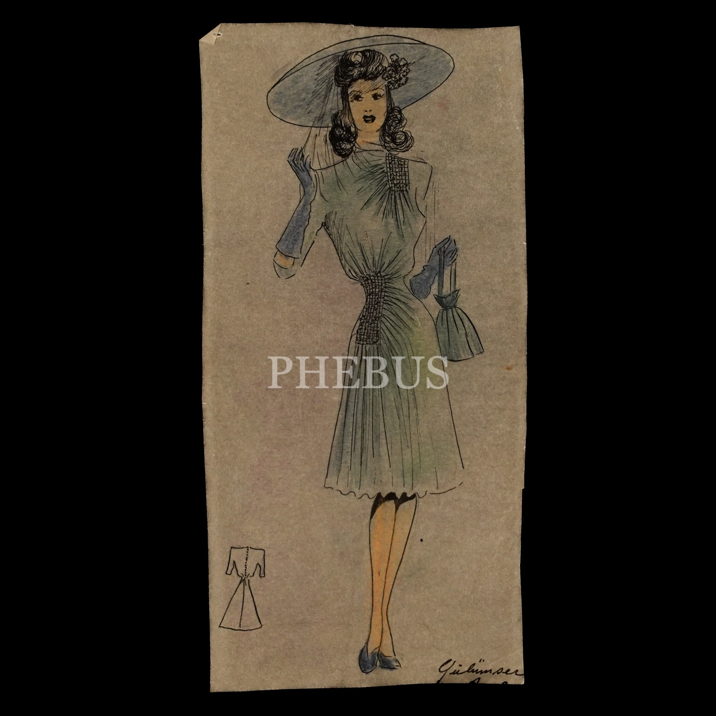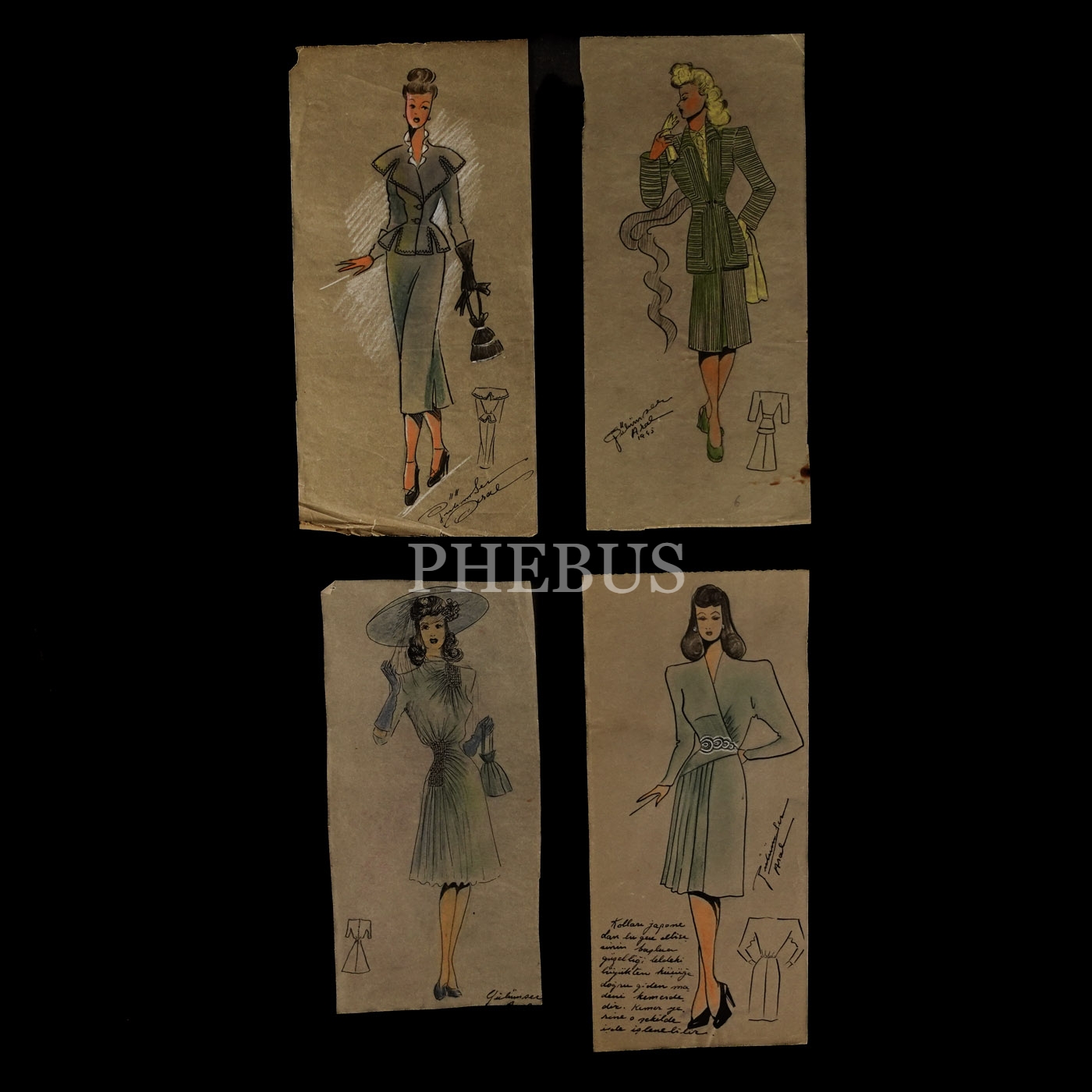 Gülümser Aral´ın EV-İŞ dergisi için çizdiği, ıslak imzalı dört adet kıyafet tasarımı, ortalama 14x28 cm...