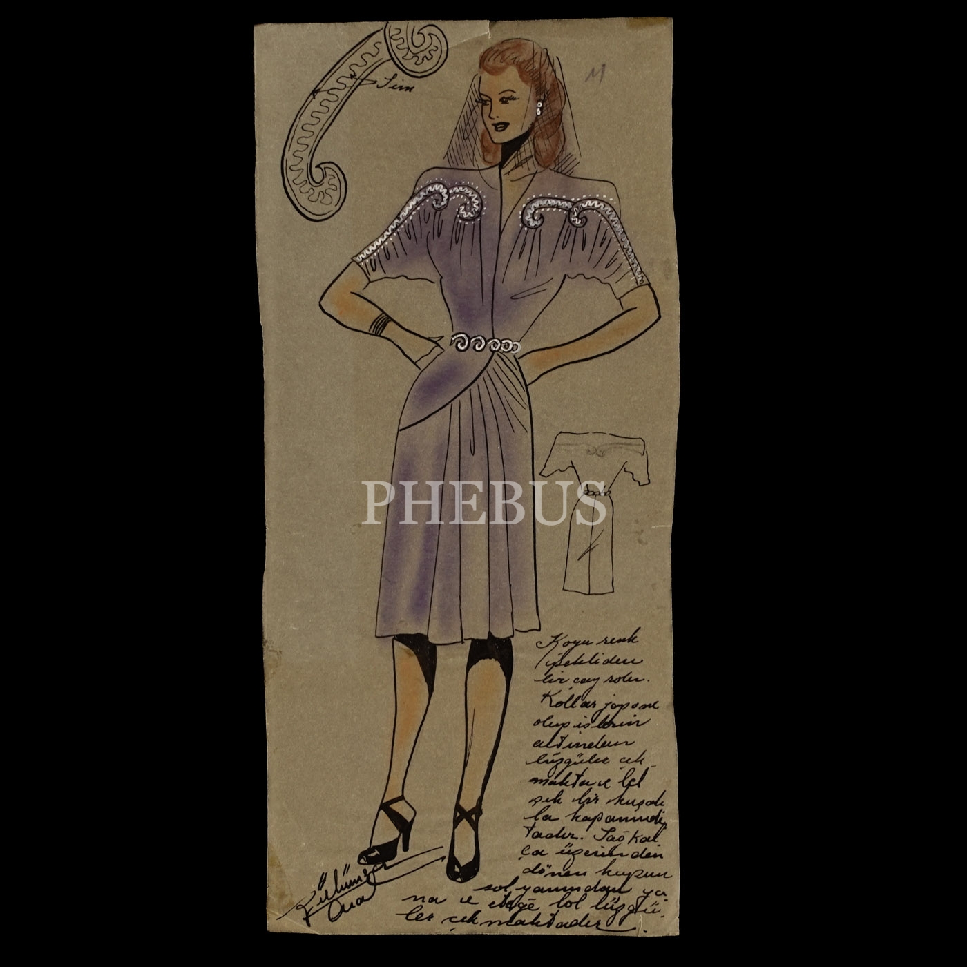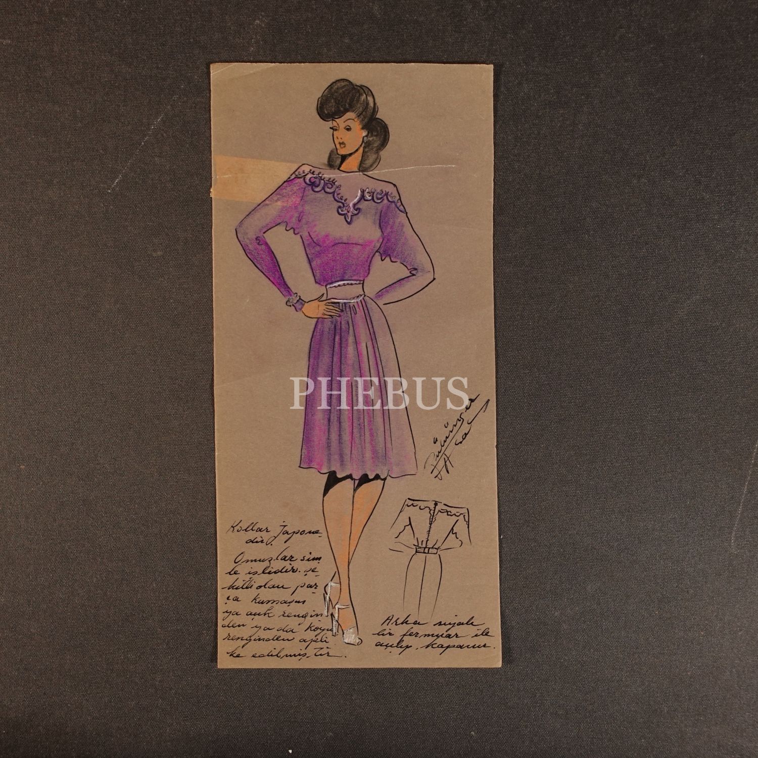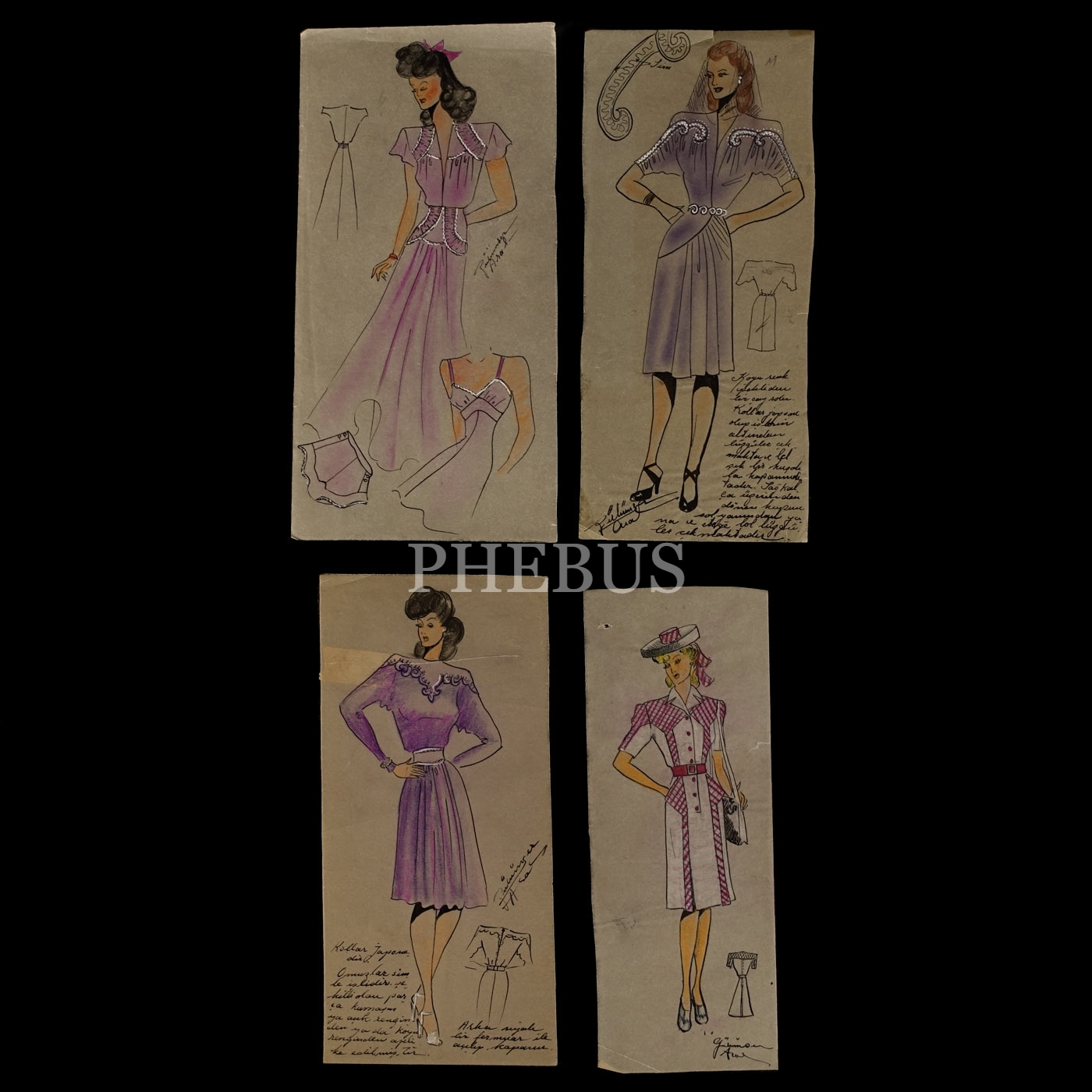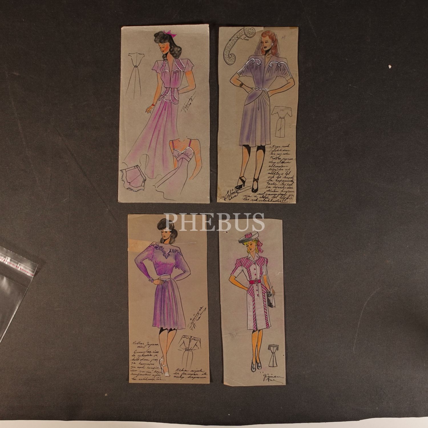 Gülümser Aral´ın EV-İŞ dergisi için çizdiği, ıslak imzalı dört adet kıyafet tasarımı, ortalama 14x28 cm...