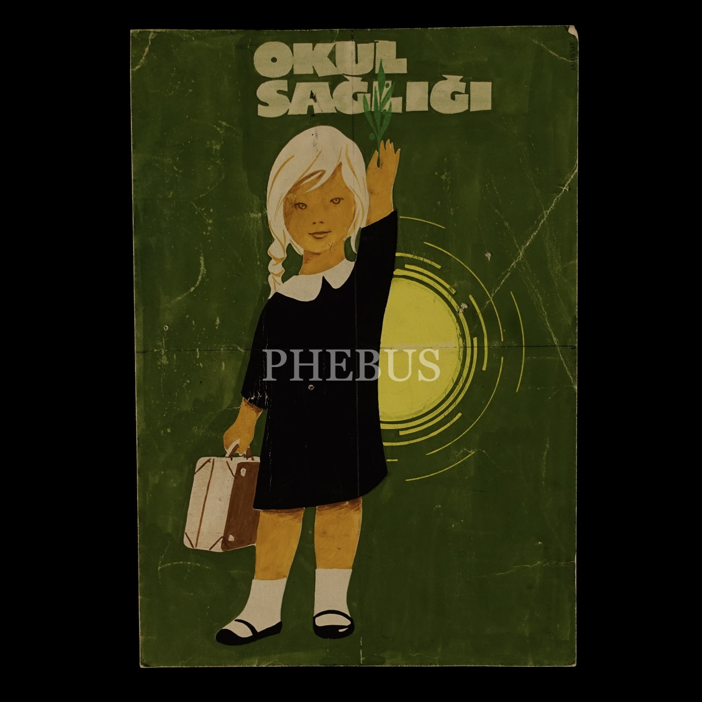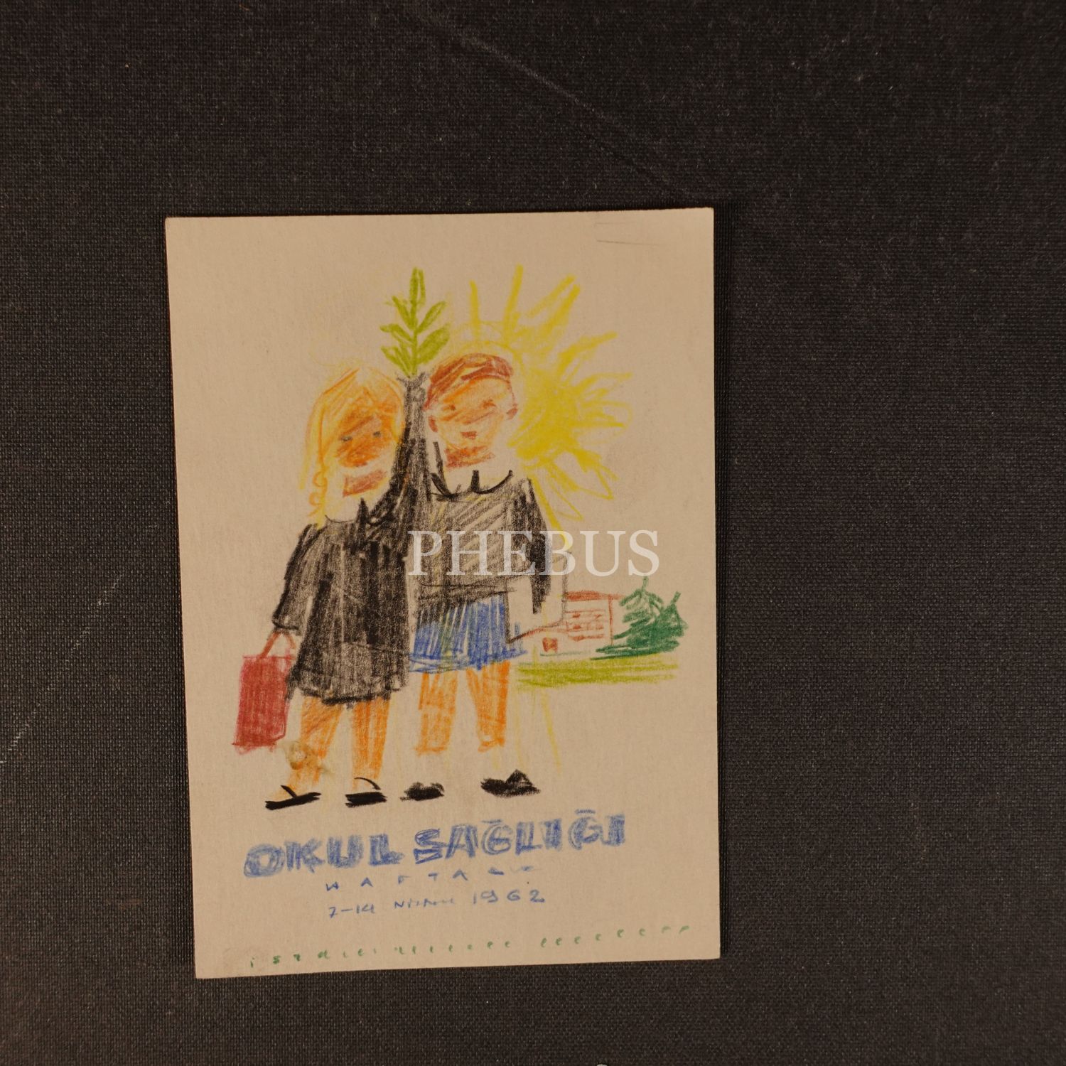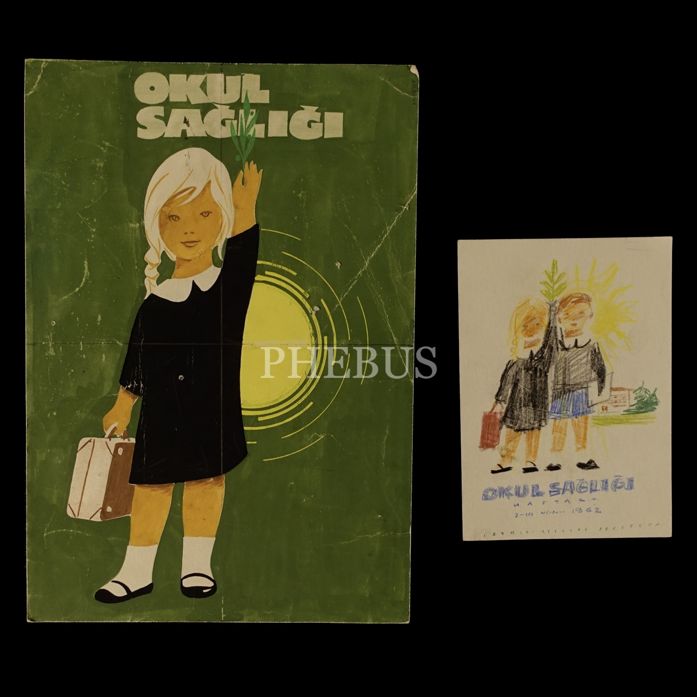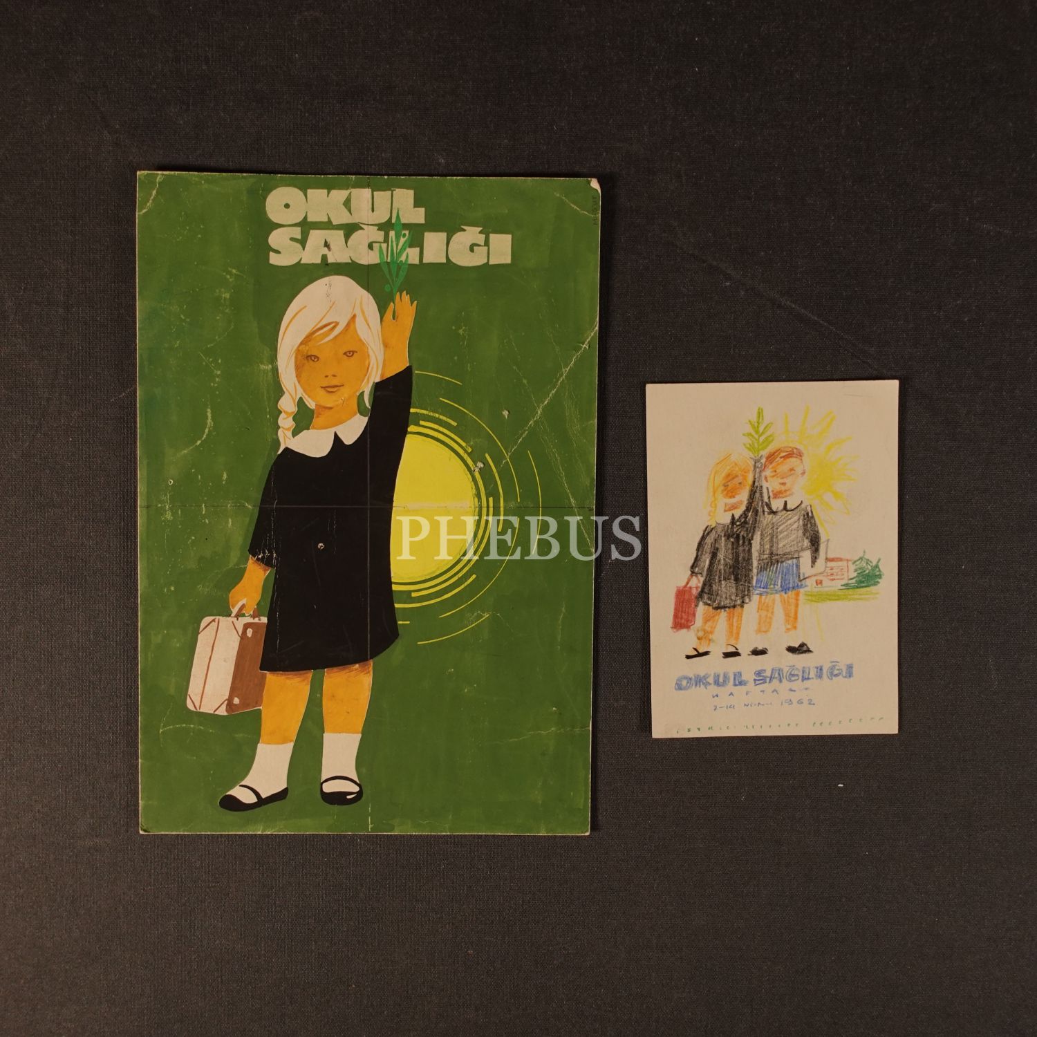 Mesut Manioğlu tasarımlı, "Okul Sağlığı Haftası" konulu iki adet orijinal afiş taslağı çizimi, 7-14 Nisan 1962, 18x26 cm - 10x14 cm...