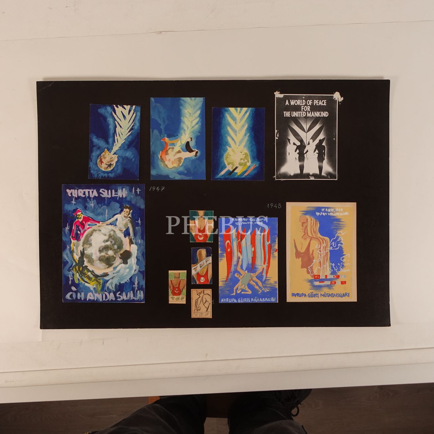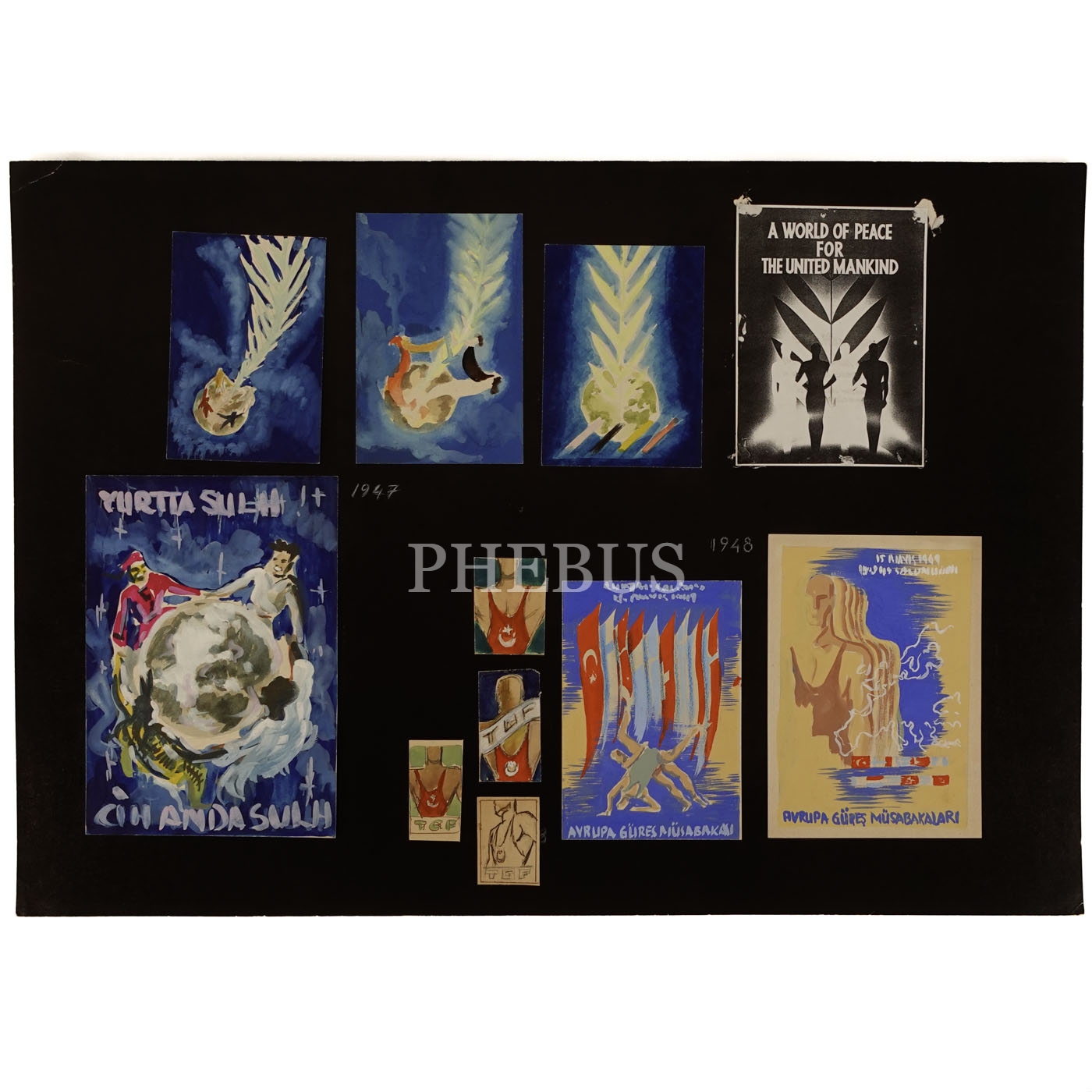 Mesut Manioğlu´nun, "Yurtta Sulh Cihanda Sulh" ve "Avrupa Güreş Müsabakaları" konulu afişleri için hazırladığı taslak çizimleri (10 adet) ve "A World of Peace for The United Mankind" başlıklı afişinin fotokopisi, 1947-48, muhtelif ebatlarda (en büyüğü 16x23 cm, en küçüğü 3x6 cm)...