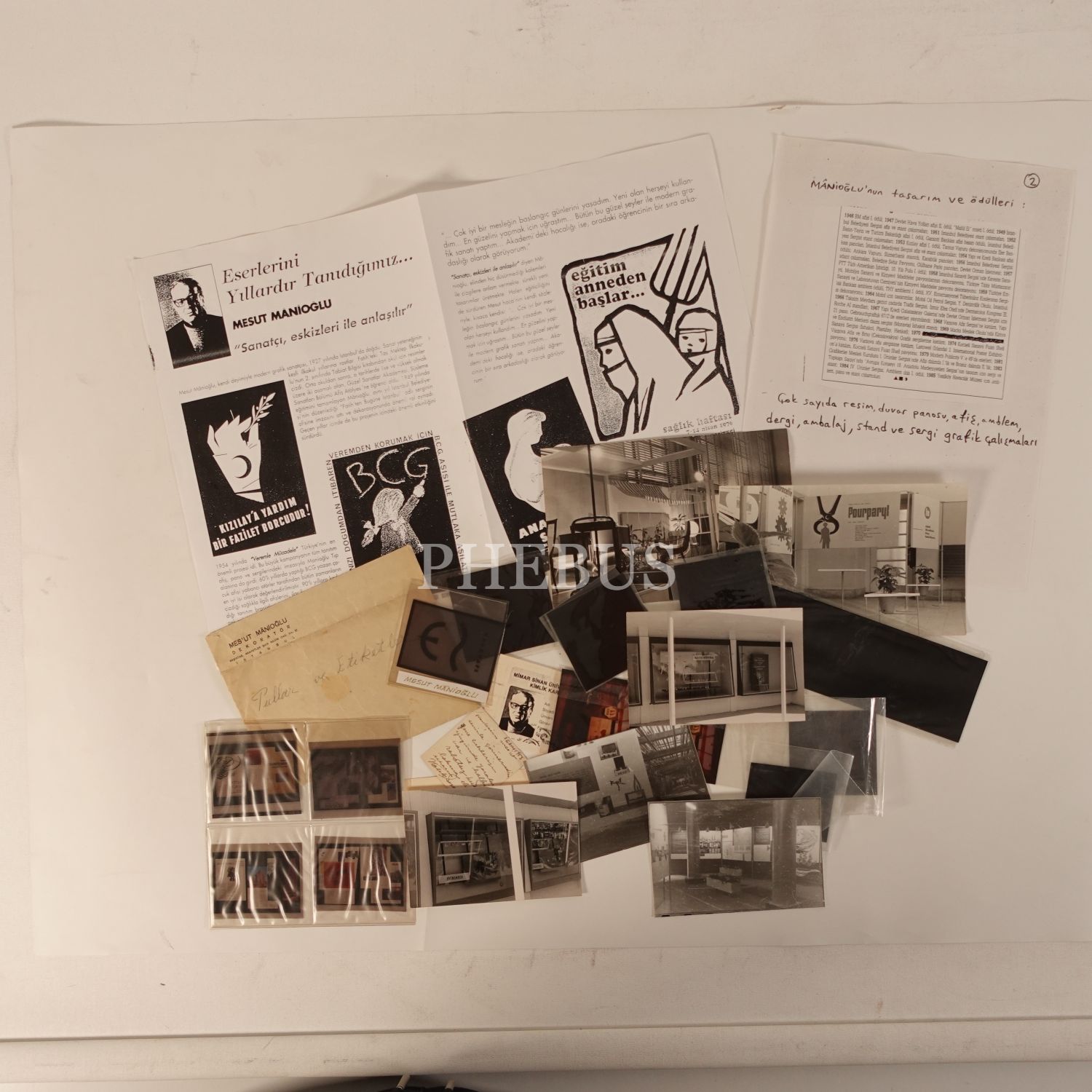 Lot içeriği: Mesut Manioğlu´na ait Mimar Sinan Üniversitesi Kimlik Kartı´nın fotokopisi, Mesut Manioğlu´na ait kartvizit, "Mes´ut Mânioğlu (Dekoratör)" antetli zarf içinde saklanmış yerli pullar, "Eserlerini Yıllardır Tanıdığımız... Mesut Mânioğlu" başlıklı dergi makalesinin fotokopisi, bir arkadaşının 3 Ekim 1953 tarihinde kendisine ithaflayıp imzaladığı fotoğrafı, Mesut Manioğlu´nun DIA fotoğrafı, işlerinin ve işlerinin sergilendiği sergilerin fotoğrafları (12 DIA, 6 pozitif baskı)...