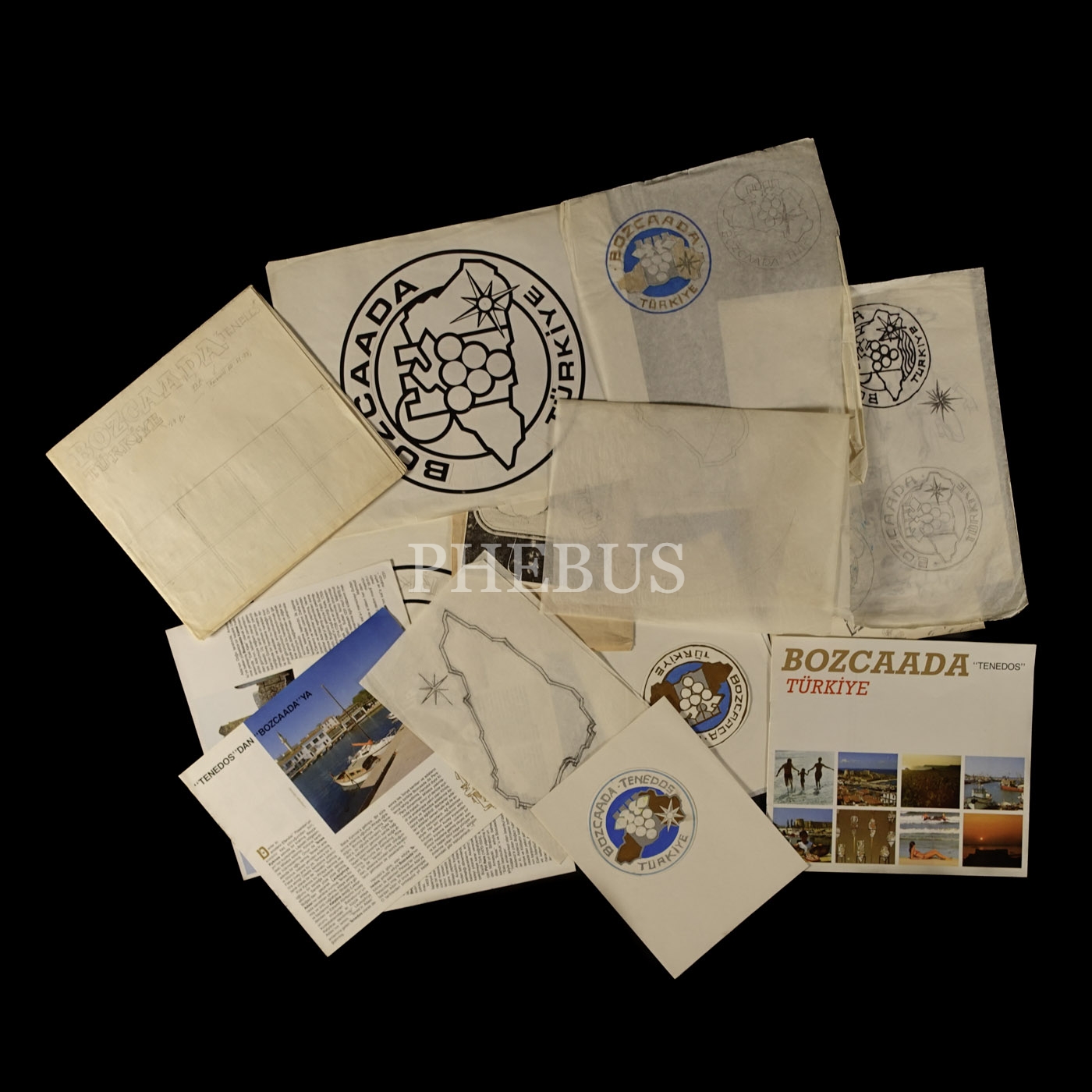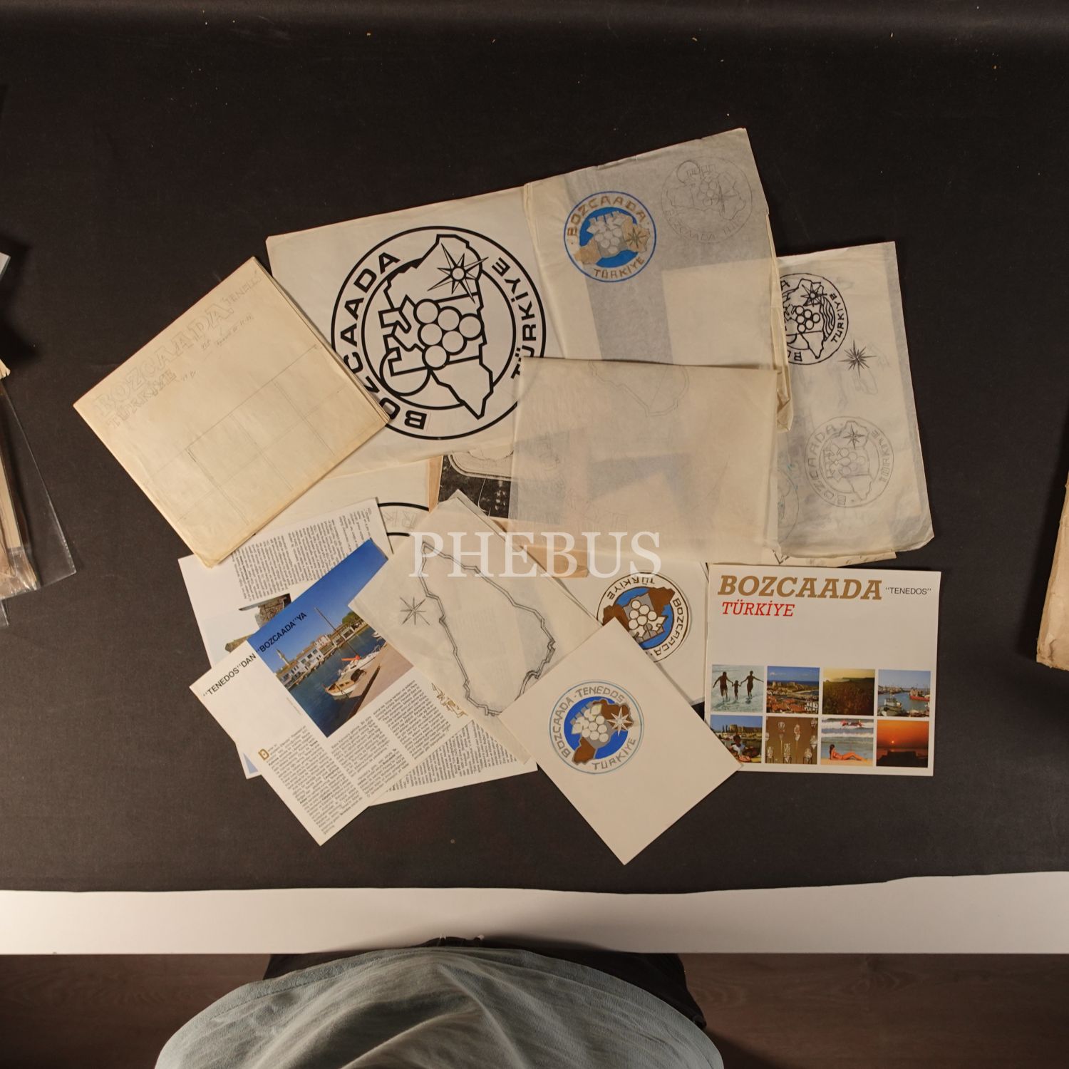 Mesut Manioğlu´nun kendi arşivinden, hazırlığını üstlendiği Bozcaada tanıtım broşürünün (1988) orijnal mizanpaj ve logo çalışmaları ile broşürün basılı nüshaları (toplam 22 parça)...