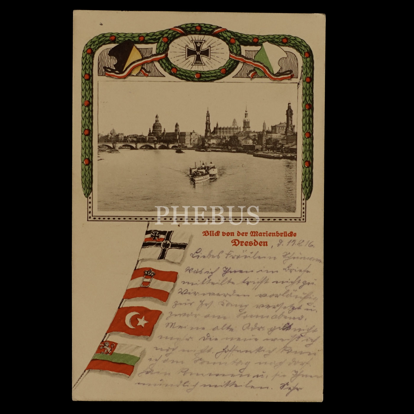 İttifak Devletleri´nin bayrakları ve Dresden görselli ittifak kartpostalı, 14x9 cm...