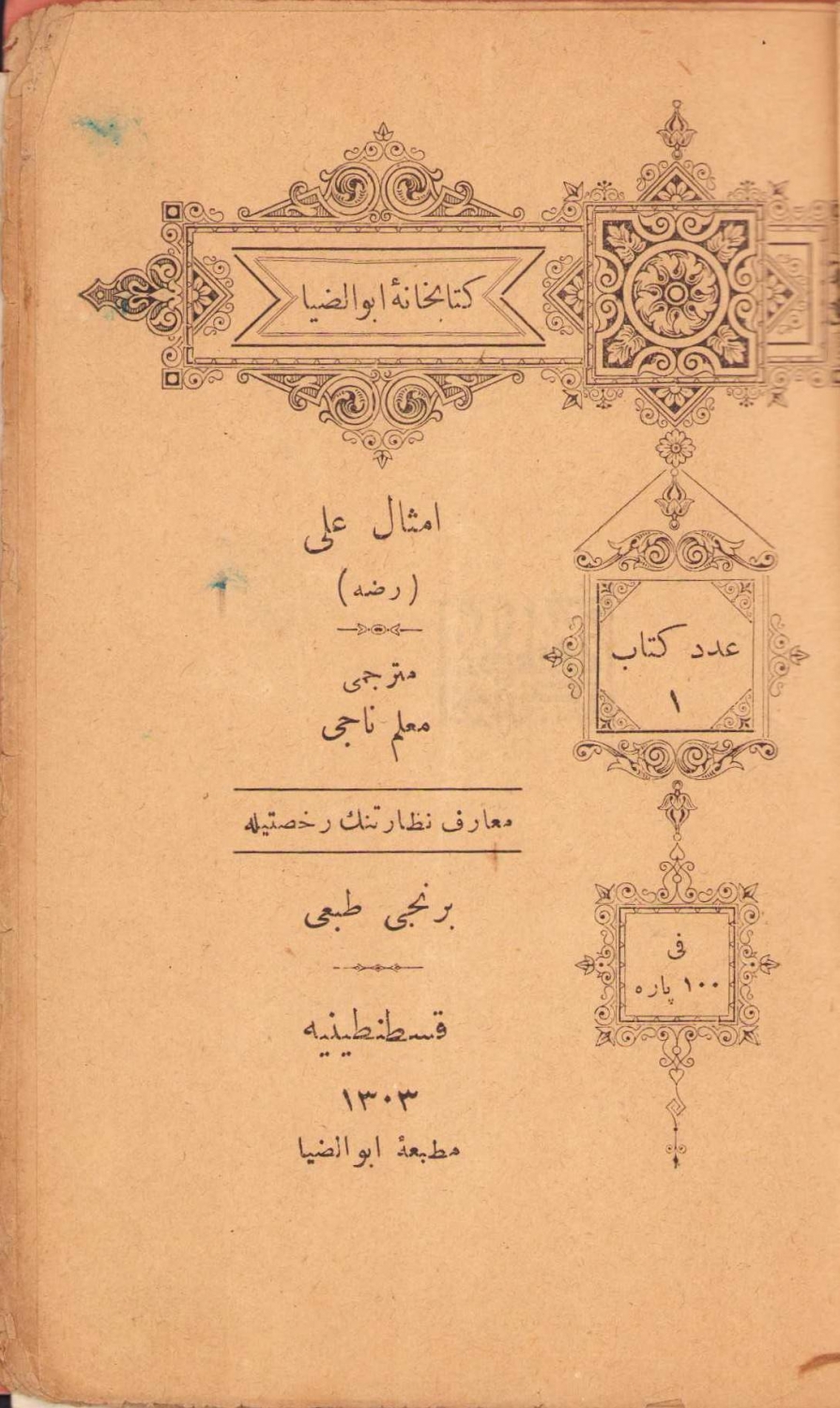 Emsal-i Ali, Ali b. Ebu Talib, çev., Muallim Naci, Matbaa-i Ebüzziya,1303, Osmanlıca - Arapça, 34 sayfa, 10x15 cm, ÖZEGE; 4896