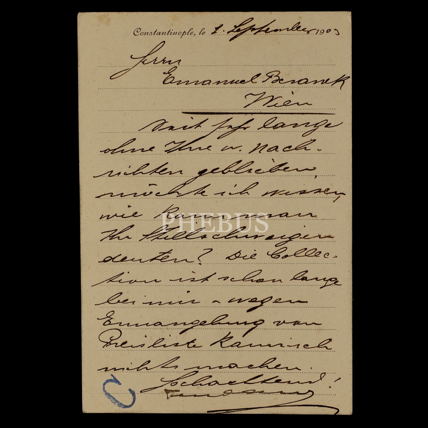 "Ferid Arie (Constantinople, Dikranian Han)" antetli, postadan geçmiş işyeri kartı, 14x9 cm...