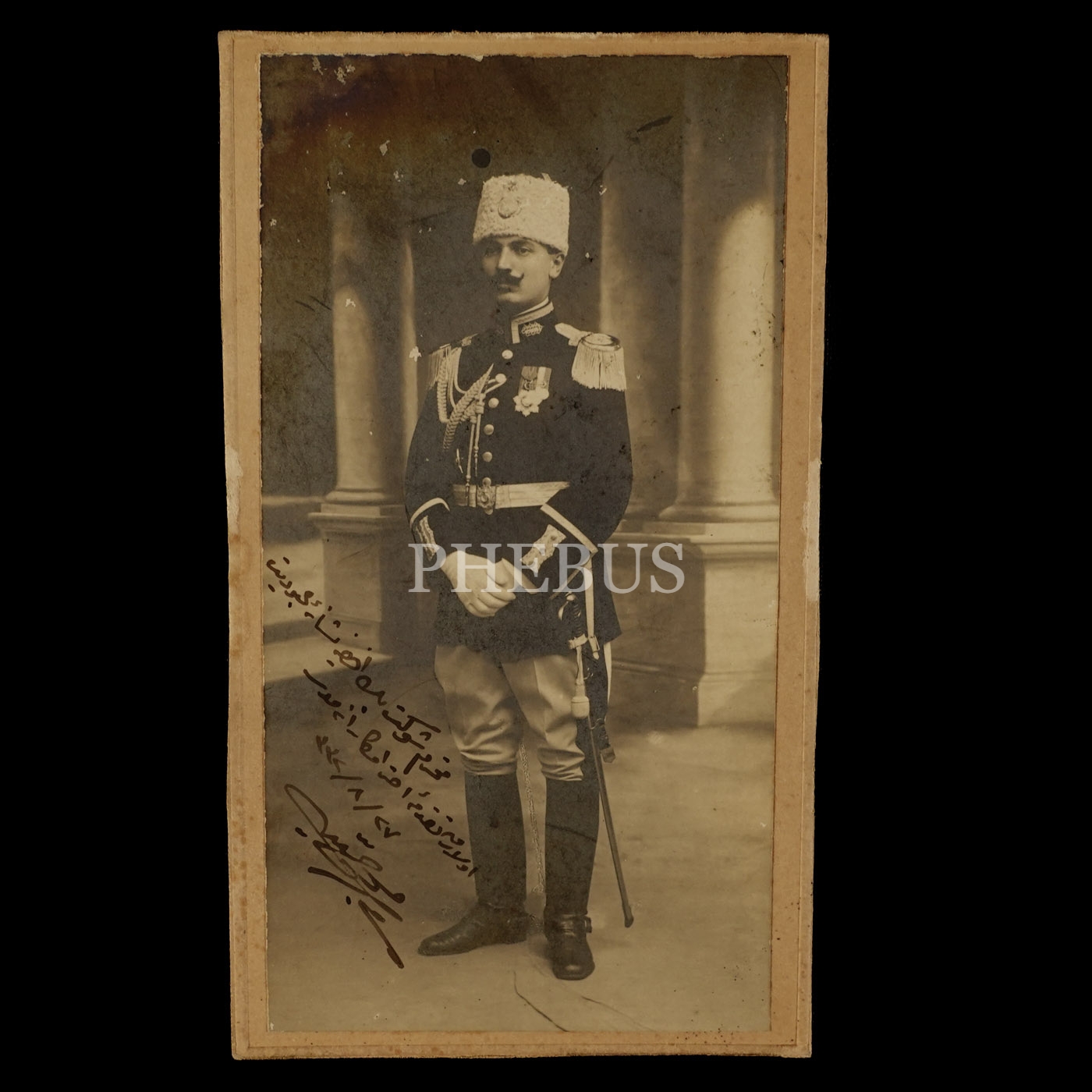 Kalpaklı ve üniformalı Osmanlı subayının stüdyo hatıra fotoğrafı, 27 Ağustos 1332, 10x17 cm...