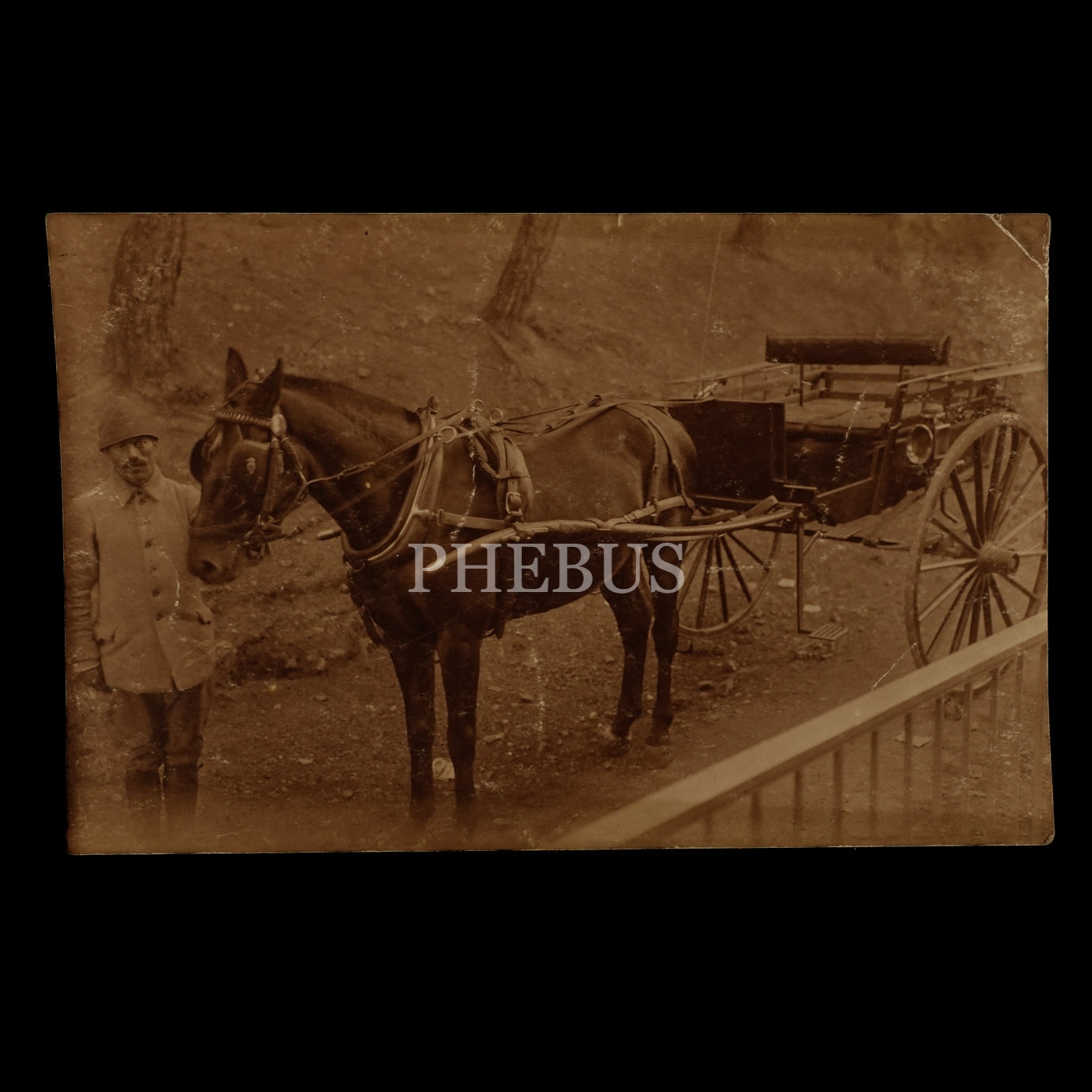 Cihan Harbi yıllarında, at arabasının başında poz veren bir Osmanlı askeri, 14x9 cm...