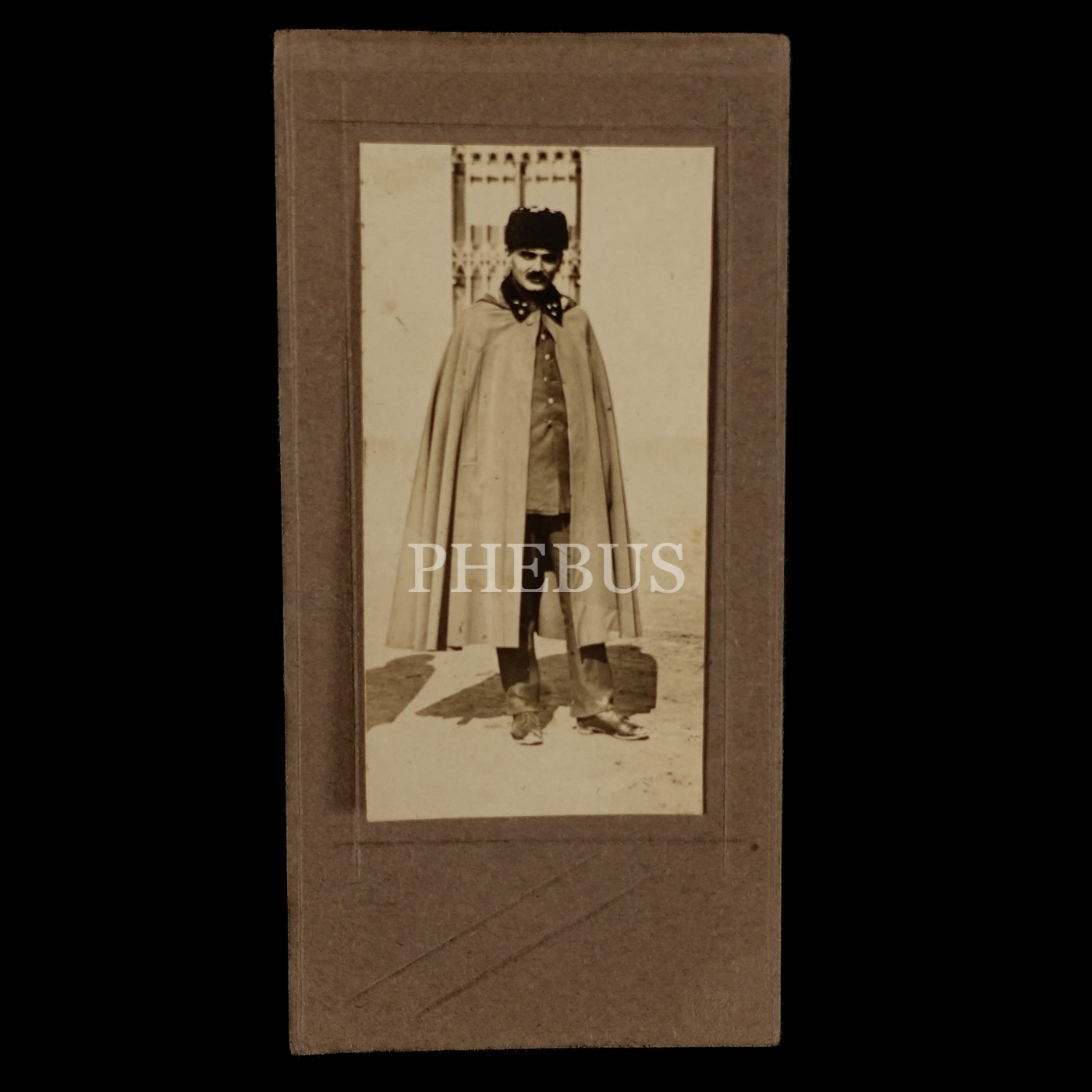 Kalpaklı ve pelerinli Osmanlı subayının hatıra fotoğrafı, 6x11 cm...