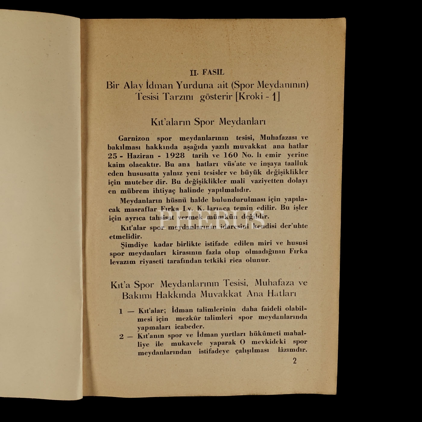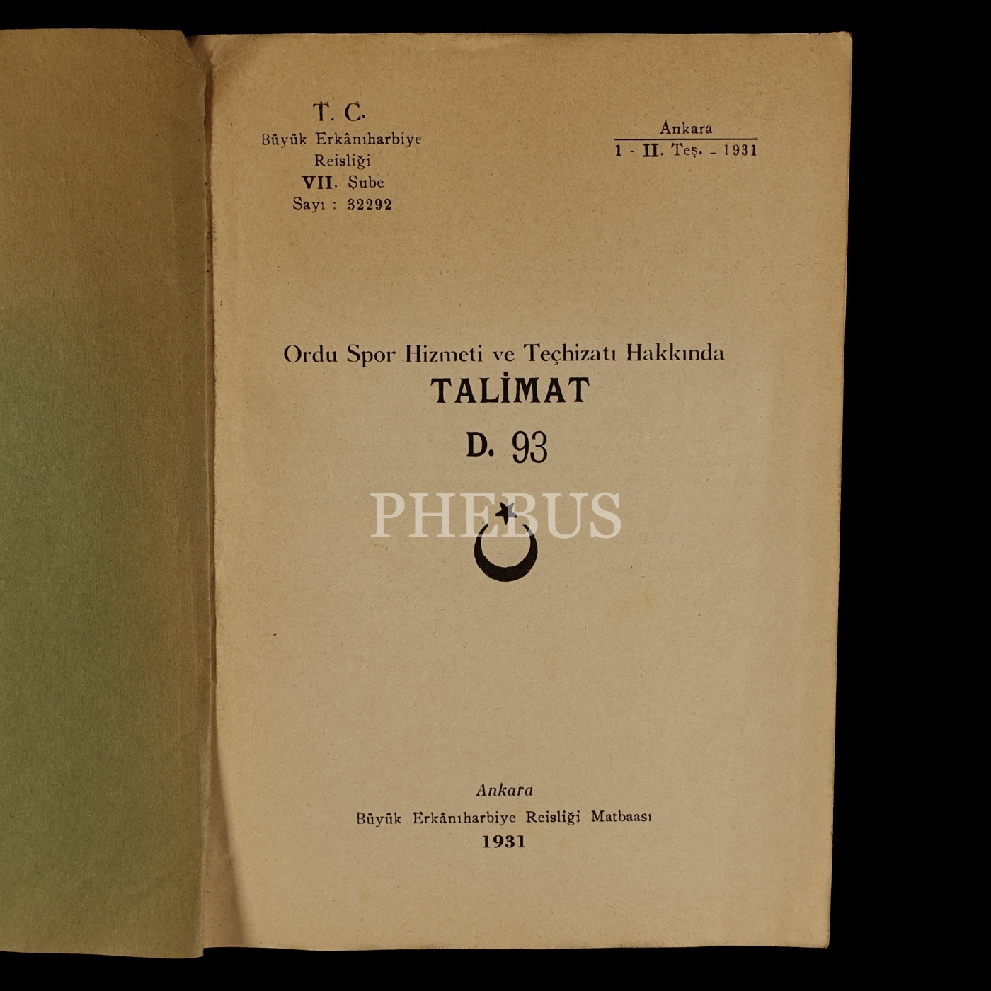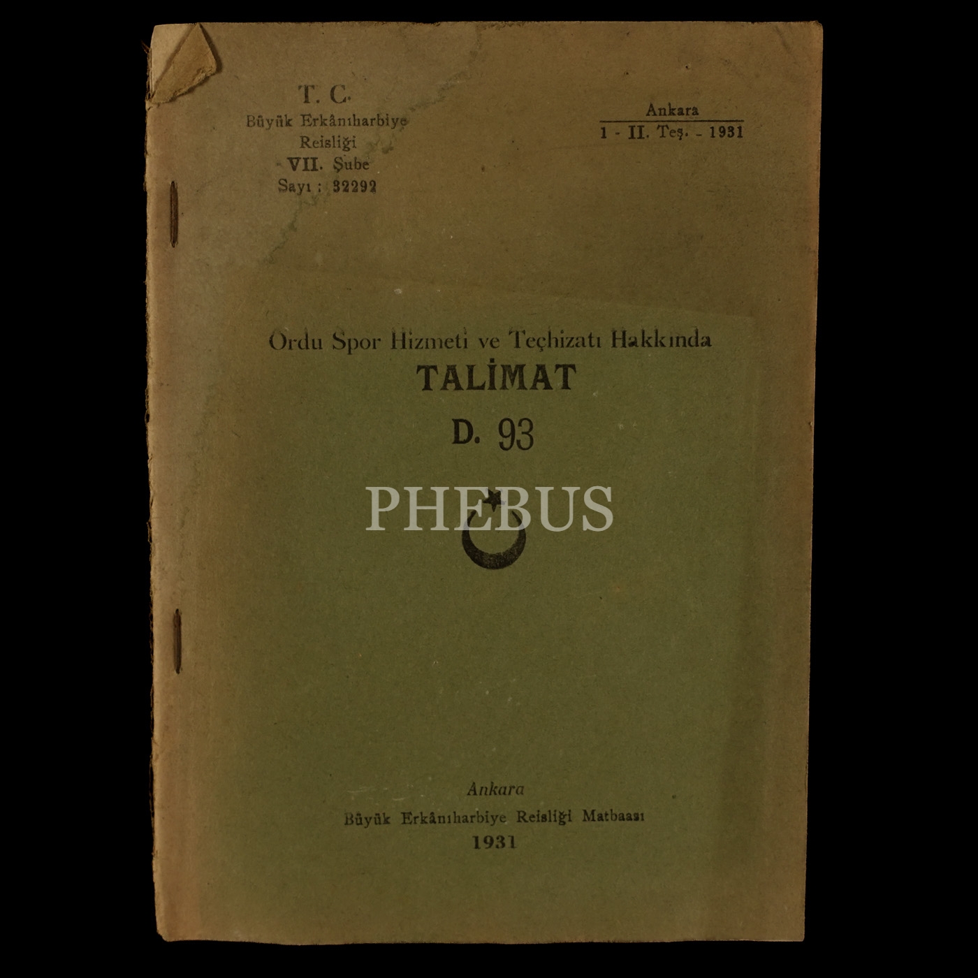 ORDU SPOR HİZMETİ VE TECHİZATI HAKKINDA TALİMAT, 1931, Büyük Erkanı Harbiye Reisliği Matbaası, 39 sayfa, 17x23 cm...