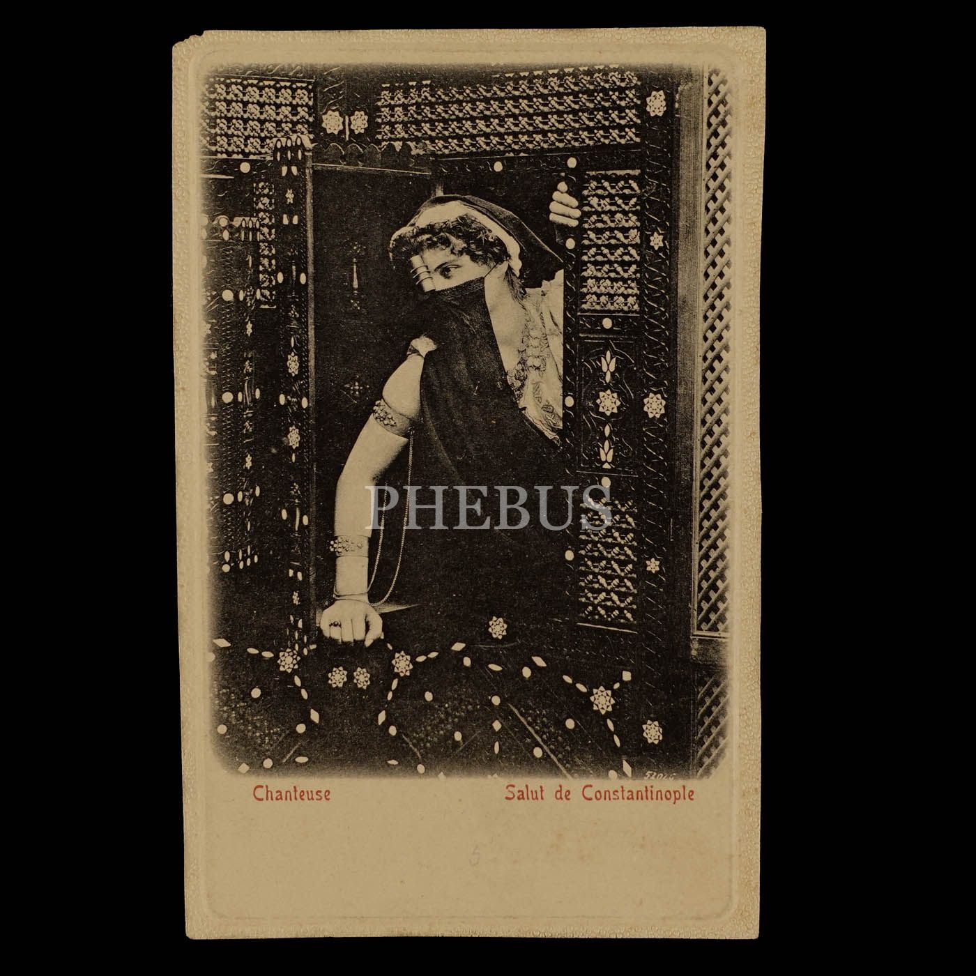 Şarkıcı Türk kadını görselli, gofre çerçeveli kartpostal, "Chanteuse - Salut de Constantinople", 9x14 cm...